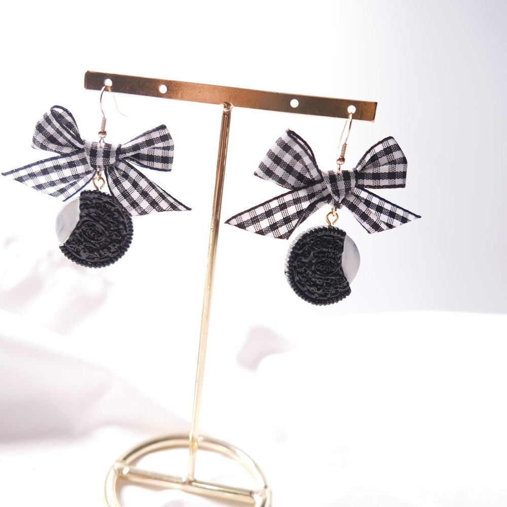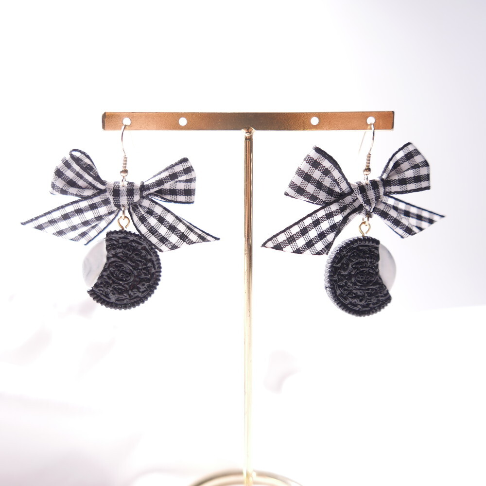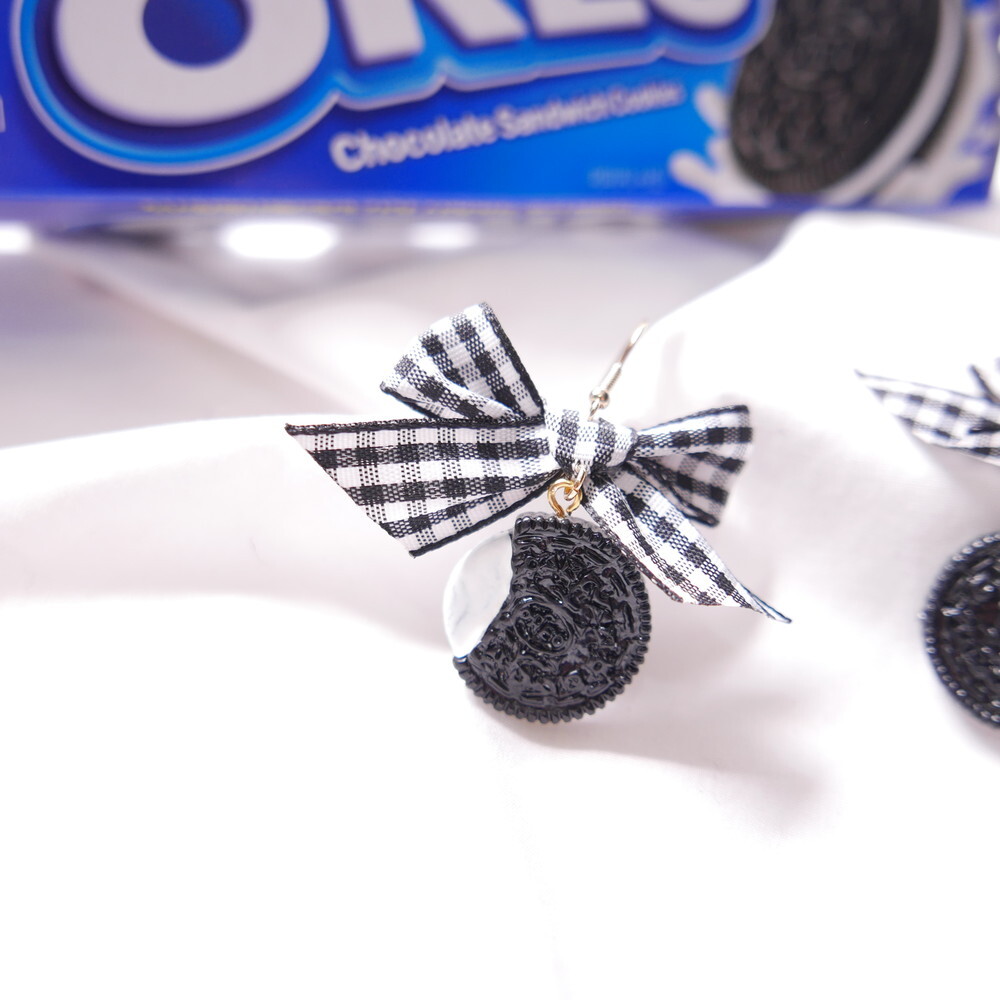 A playful twist on your favorite snack! These Oreo Cookie earrings feature a detailed half-bitten cookie charm dangling from a gingham ribbon bow. The black-and-white color palette makes them easy to style while still offering a quirky, eye-catching touch. Lightweight and comfortable with a hoop hook, these earrings are perfect for everyday fun or dessert-inspired fashion.