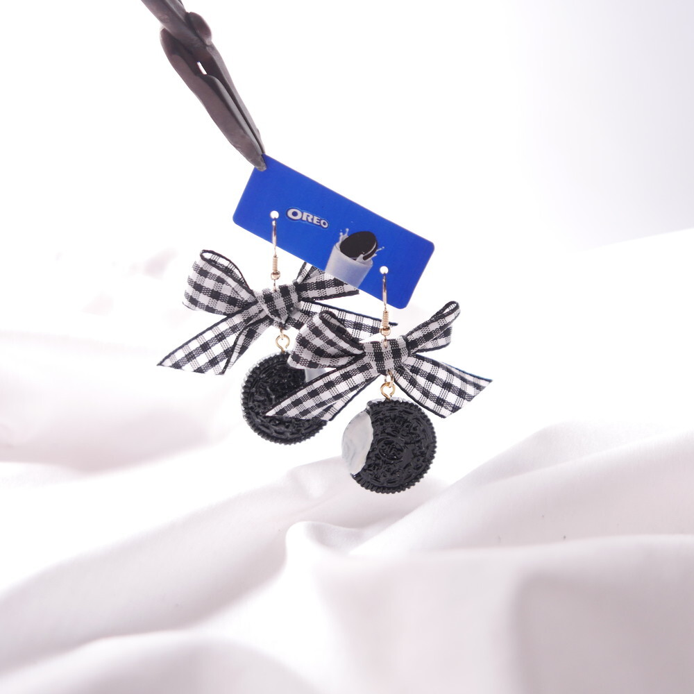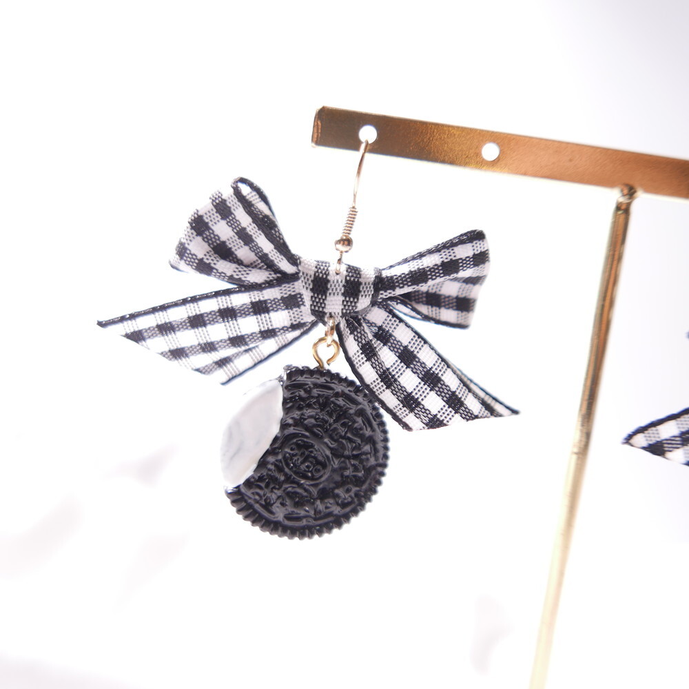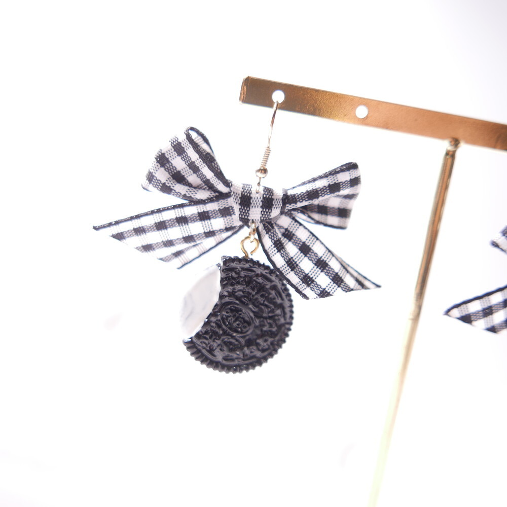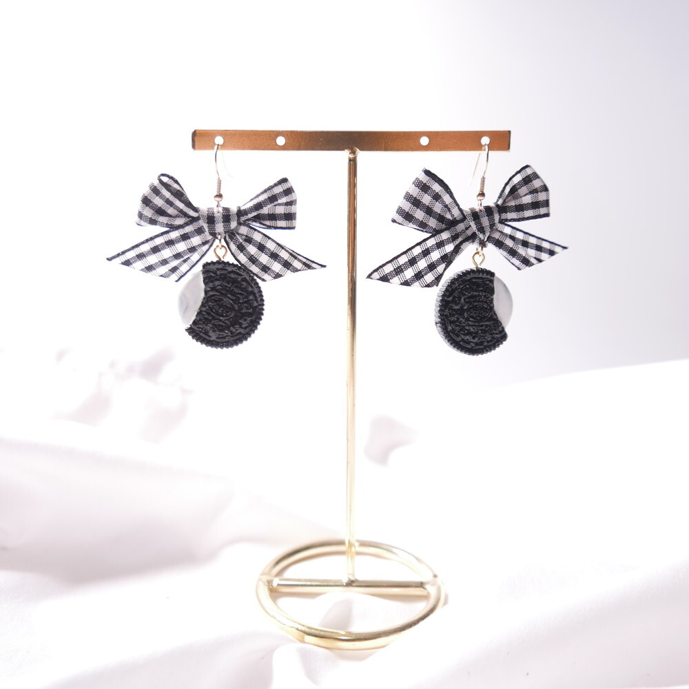 A playful twist on your favorite snack! These Oreo Cookie earrings feature a detailed half-bitten cookie charm dangling from a gingham ribbon bow. The black-and-white color palette makes them easy to style while still offering a quirky, eye-catching touch. Lightweight and comfortable with a hoop hook, these earrings are perfect for everyday fun or dessert-inspired fashion.
