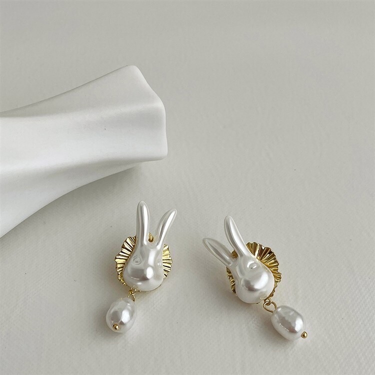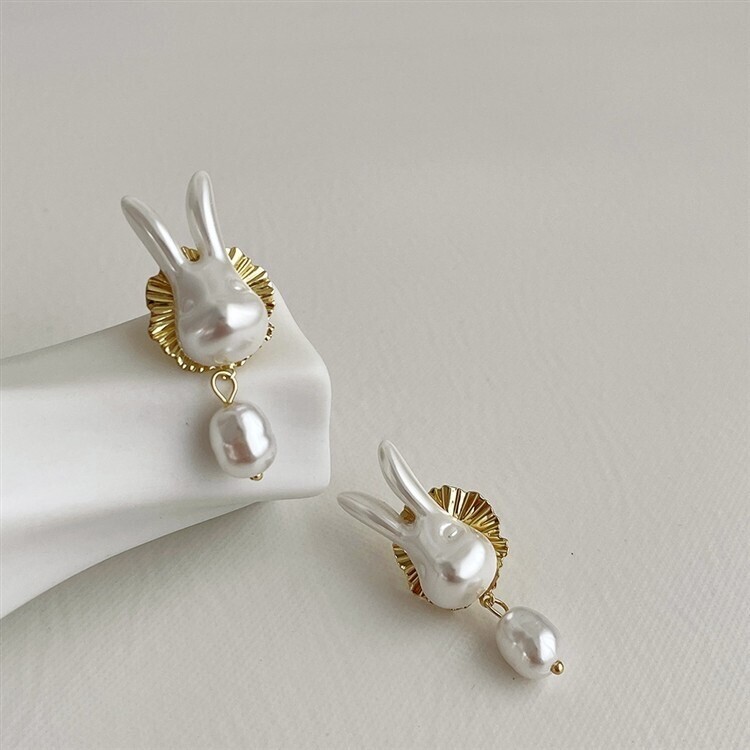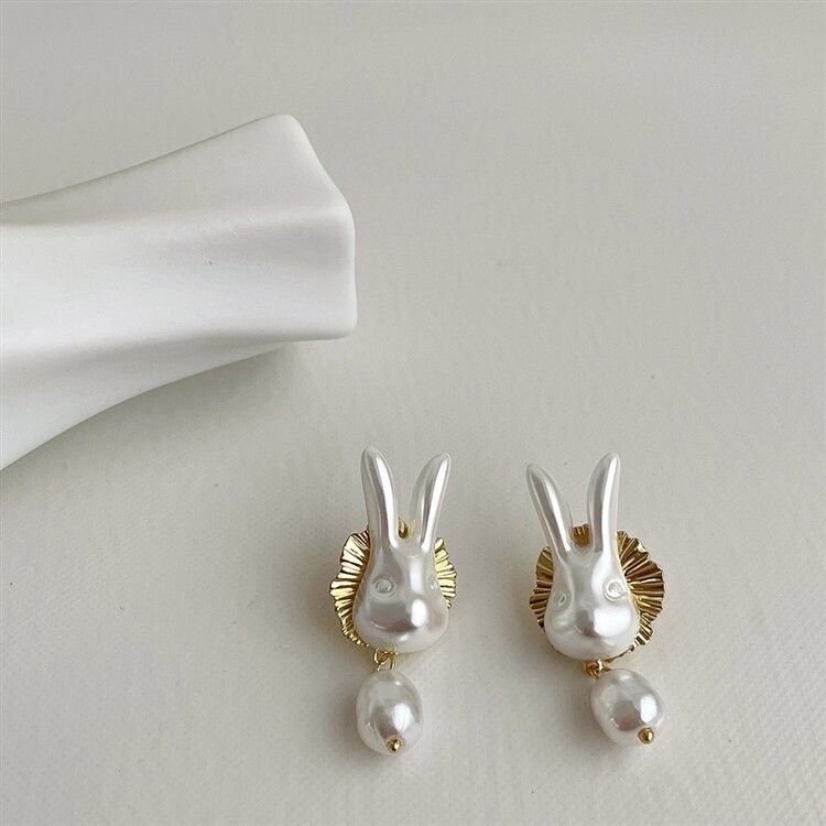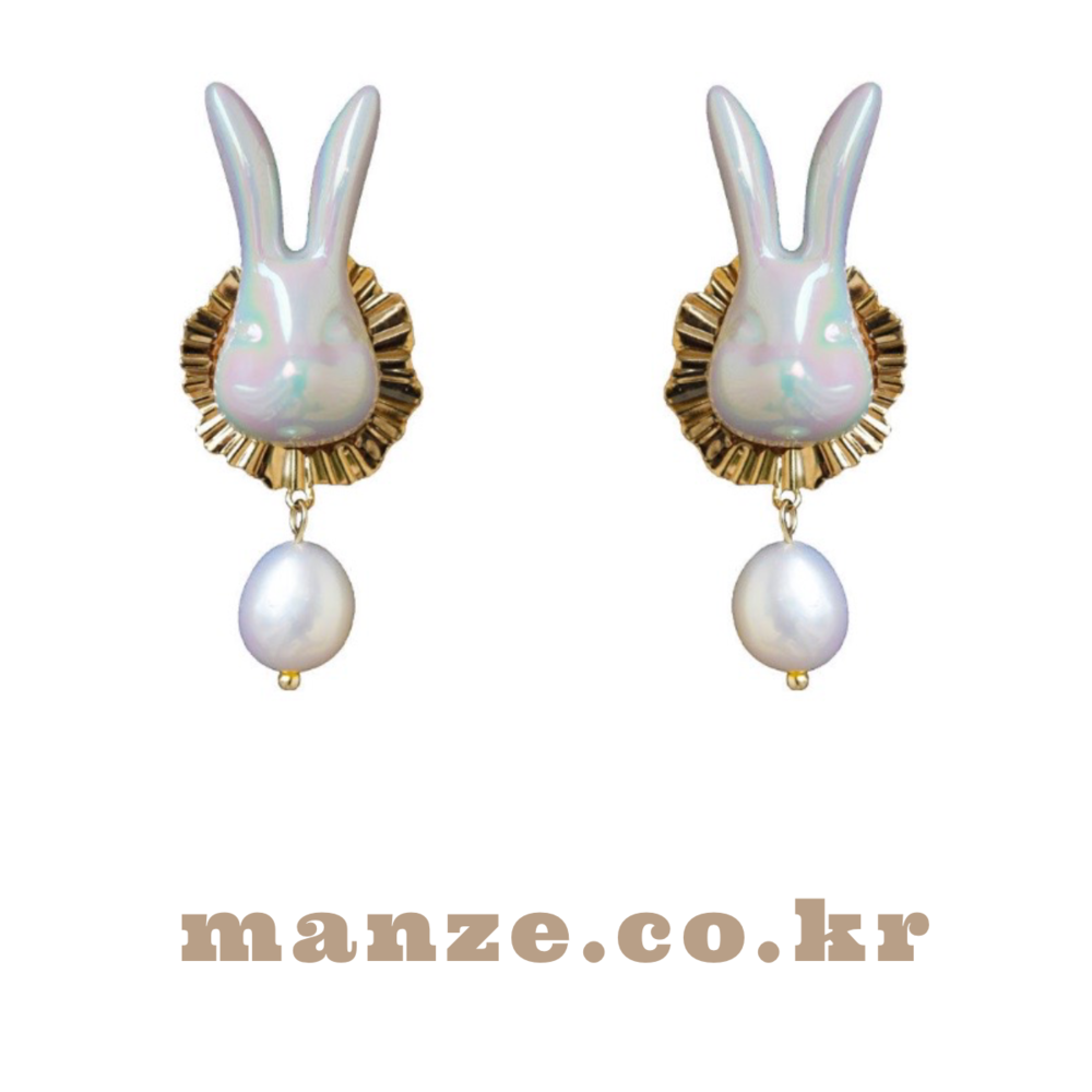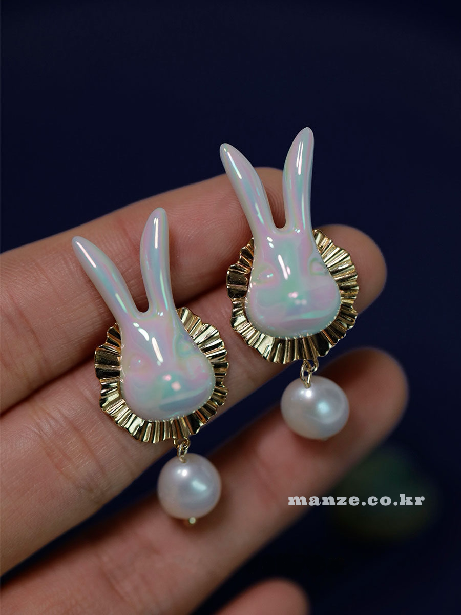 A luminous white bunny with a gold ruffled collar pairs beautifully with a dangling freshwater pearl for a whimsical yet refined look. The iridescent finish gives it a magical gleam, making this piece a charming addition to any outfit.