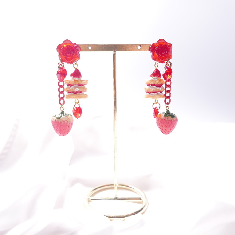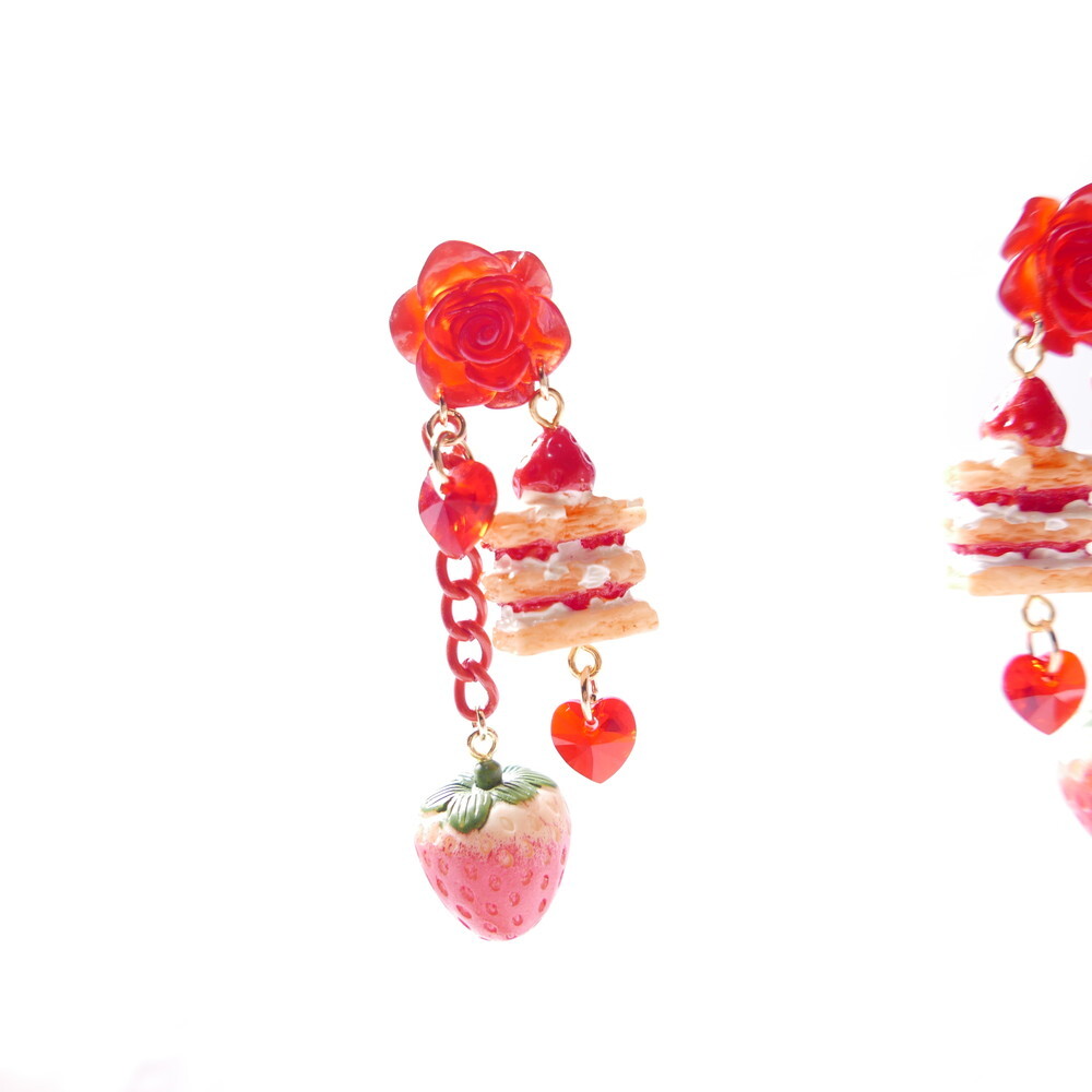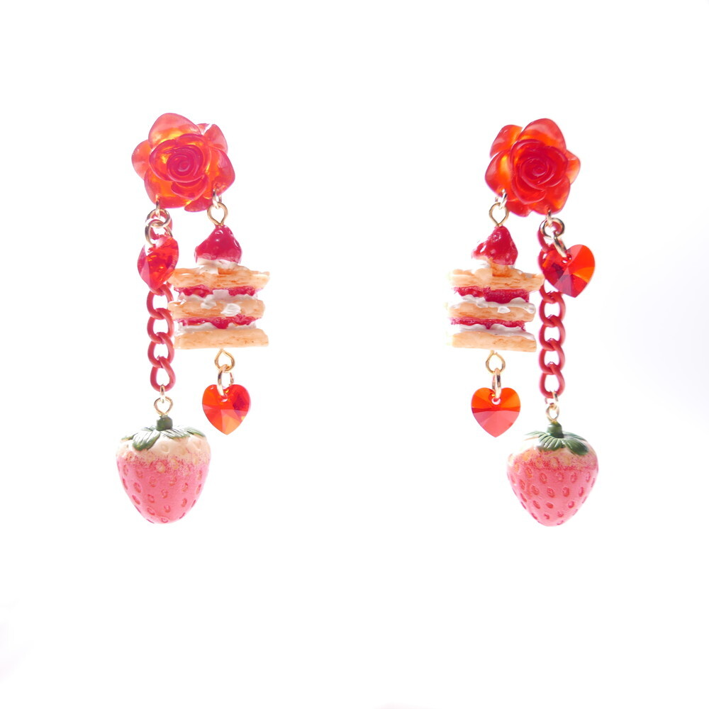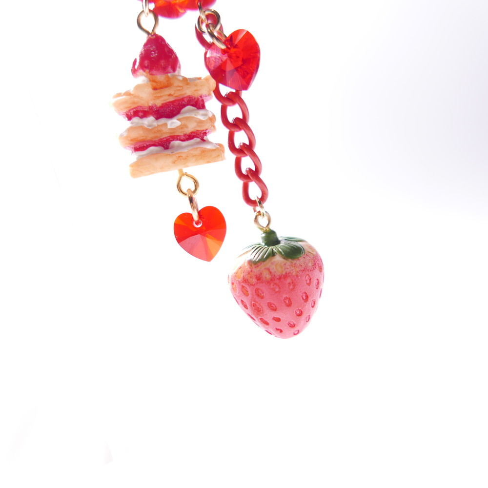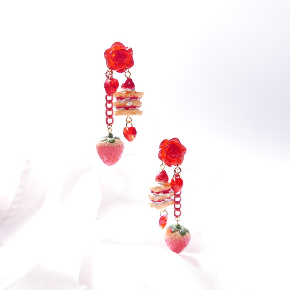 A decadent dessert fantasy brought to life! These handmade earrings feature a charming strawberry shortcake stack, a realistic strawberry charm, and sparkling red Swarovski crystals—all suspended below a translucent red rose stud. With cascading red chains and heart-shaped crystals, they add the perfect blend of sweetness and bold sparkle to your look.