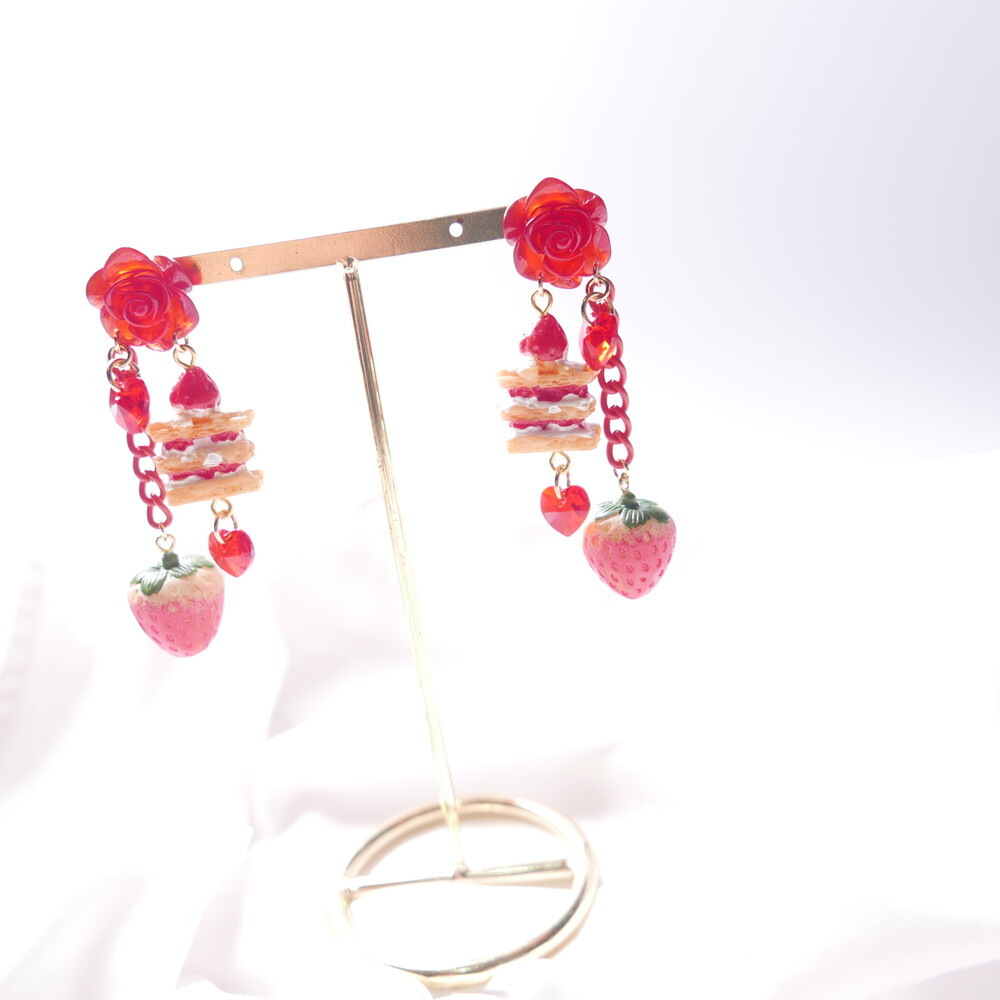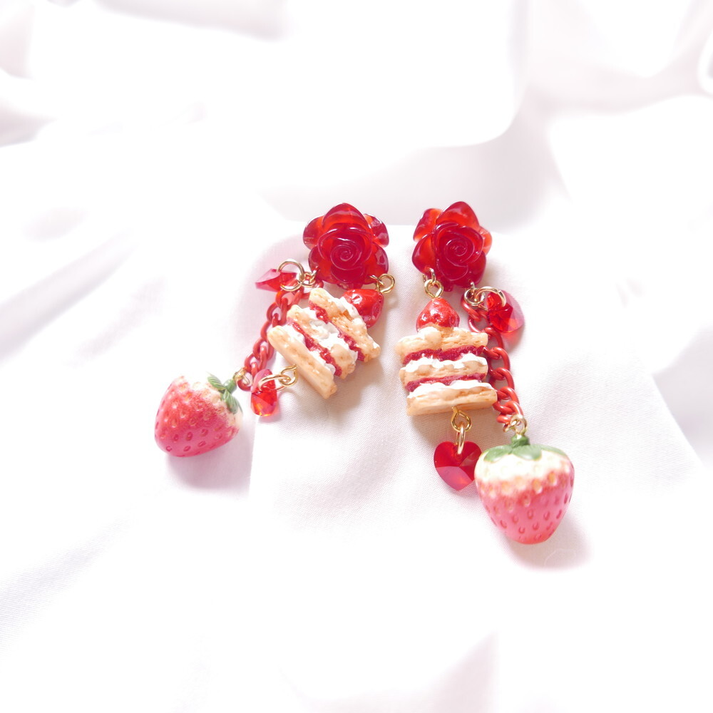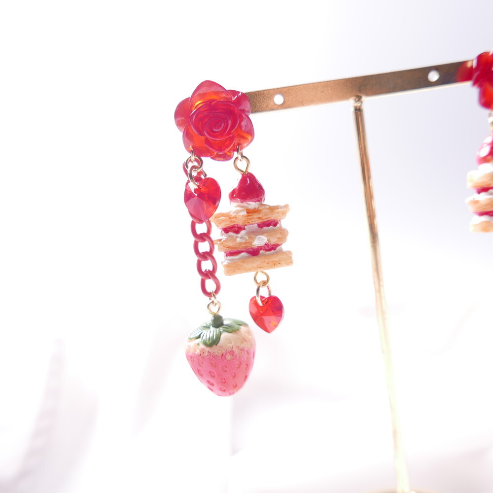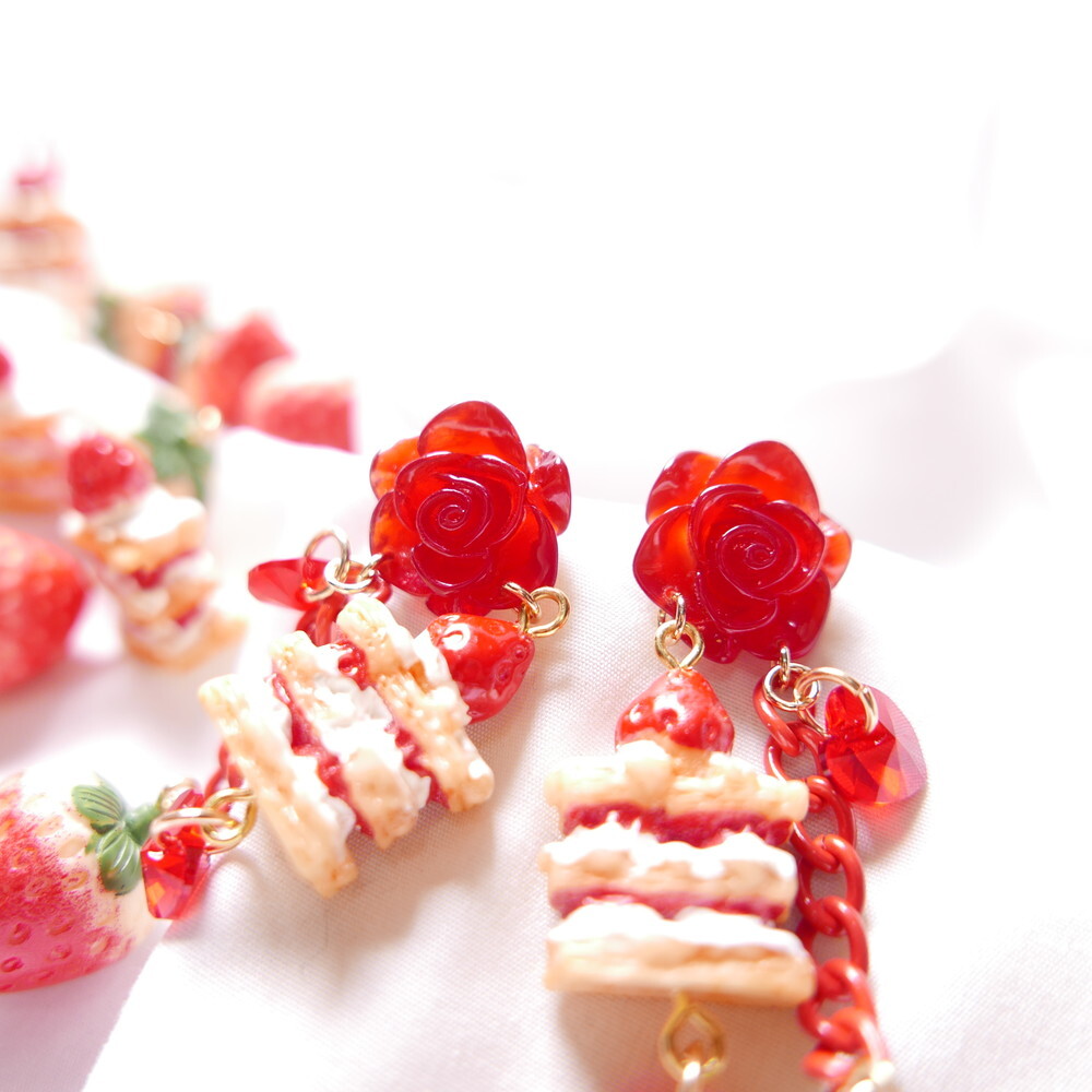 A decadent dessert fantasy brought to life! These handmade earrings feature a charming strawberry shortcake stack, a realistic strawberry charm, and sparkling red Swarovski crystals—all suspended below a translucent red rose stud. With cascading red chains and heart-shaped crystals, they add the perfect blend of sweetness and bold sparkle to your look.