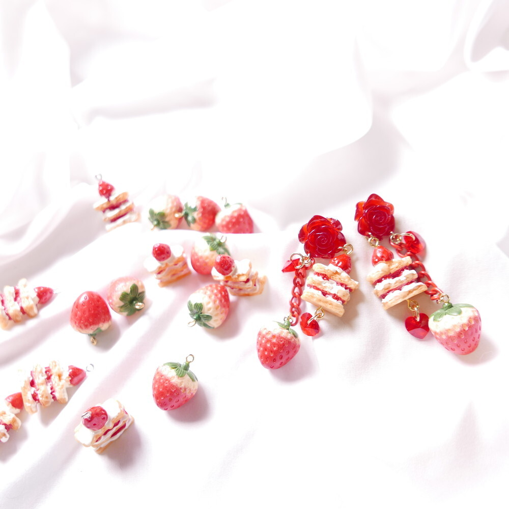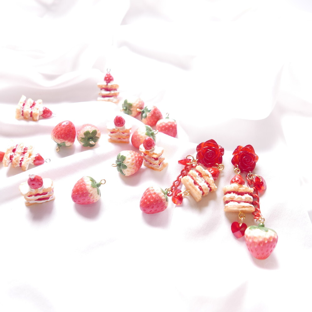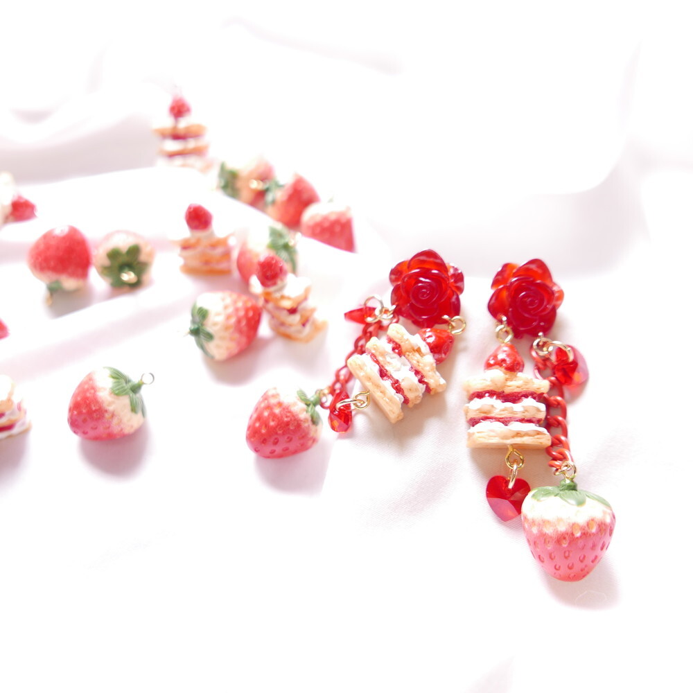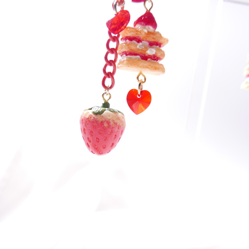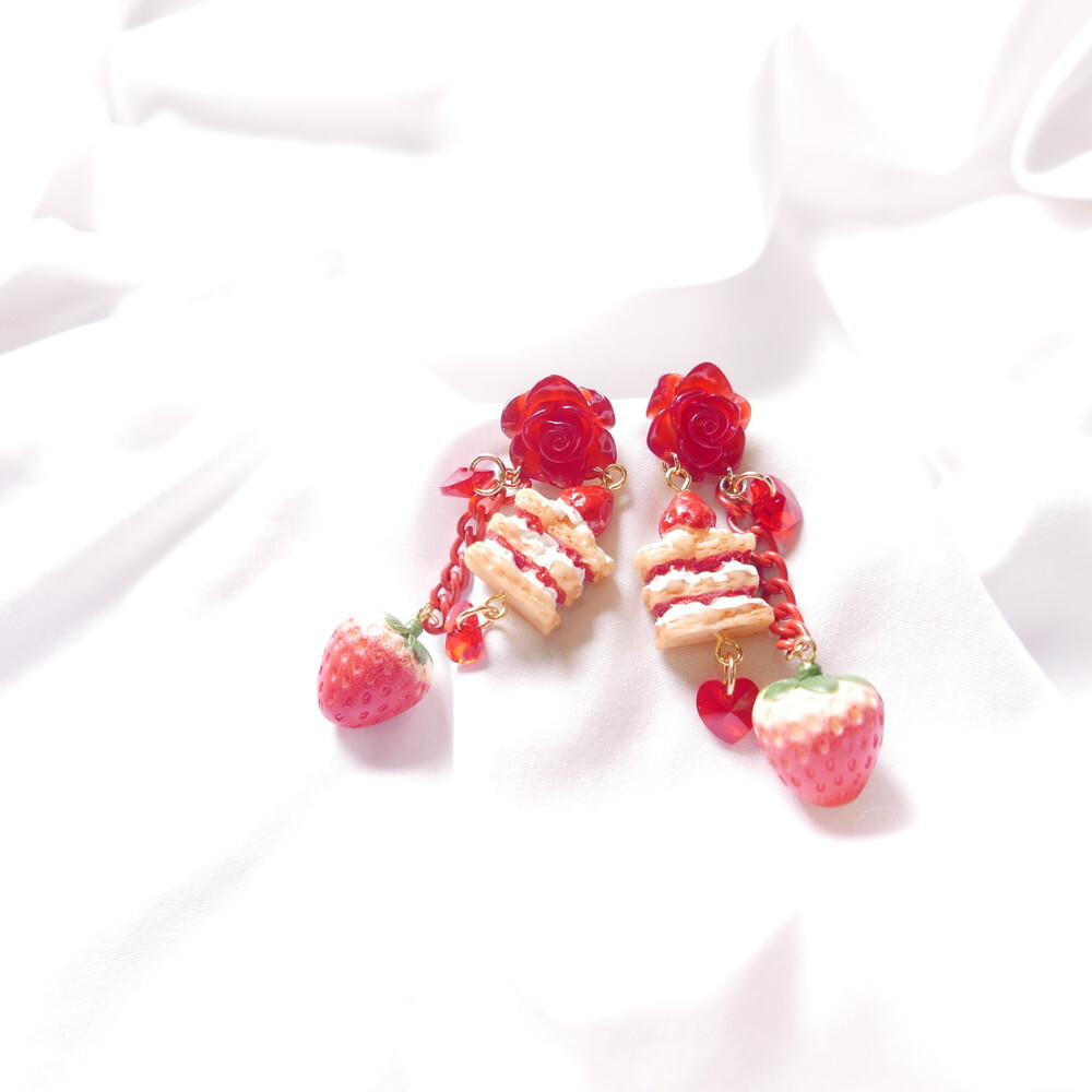 A decadent dessert fantasy brought to life! These handmade earrings feature a charming strawberry shortcake stack, a realistic strawberry charm, and sparkling red Swarovski crystals—all suspended below a translucent red rose stud. With cascading red chains and heart-shaped crystals, they add the perfect blend of sweetness and bold sparkle to your look.
