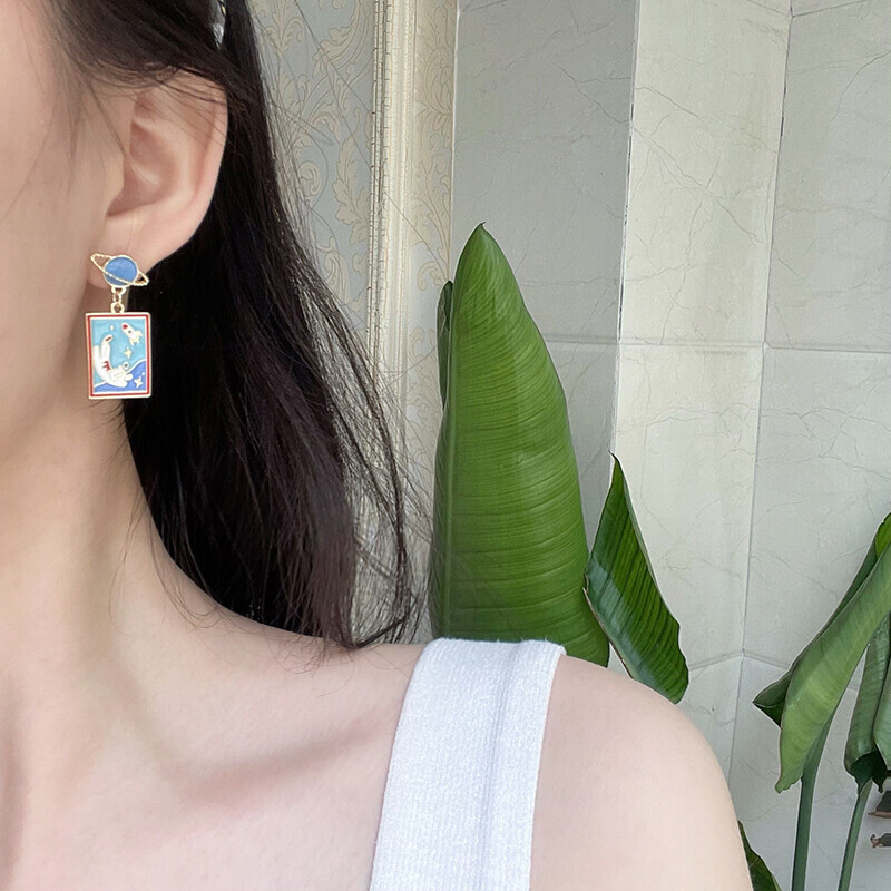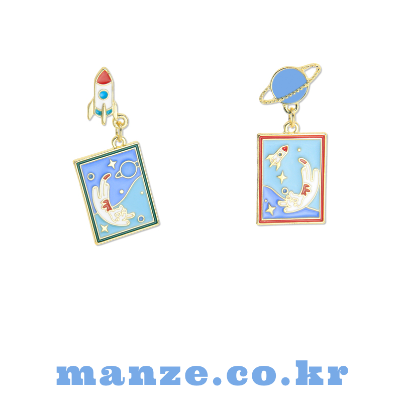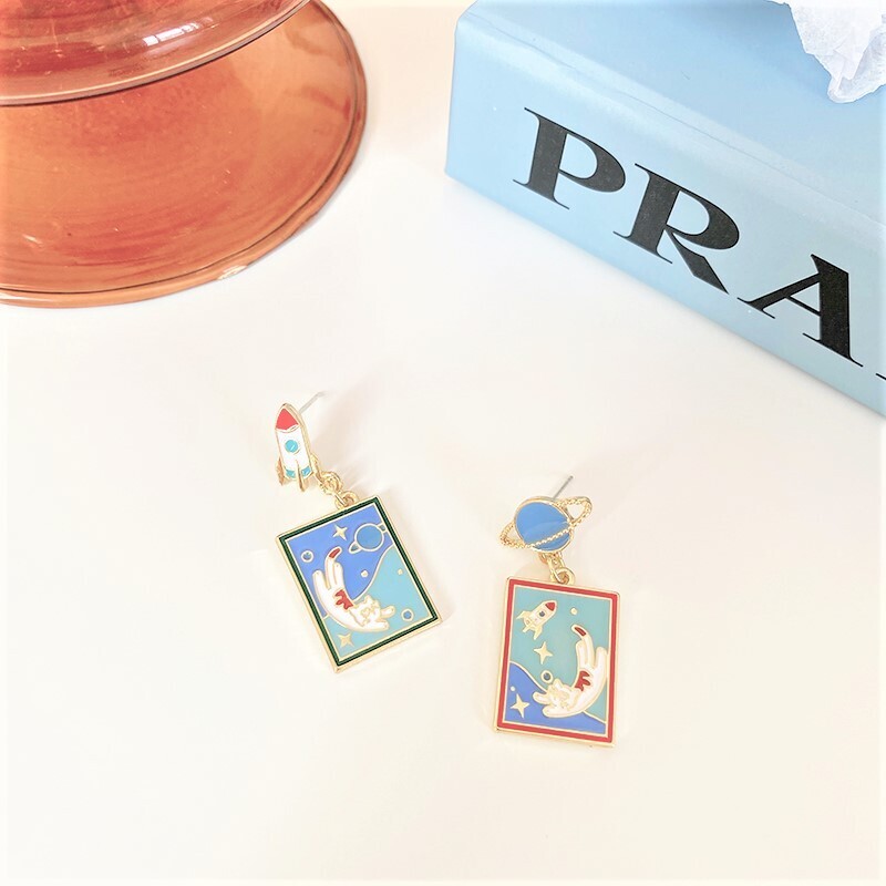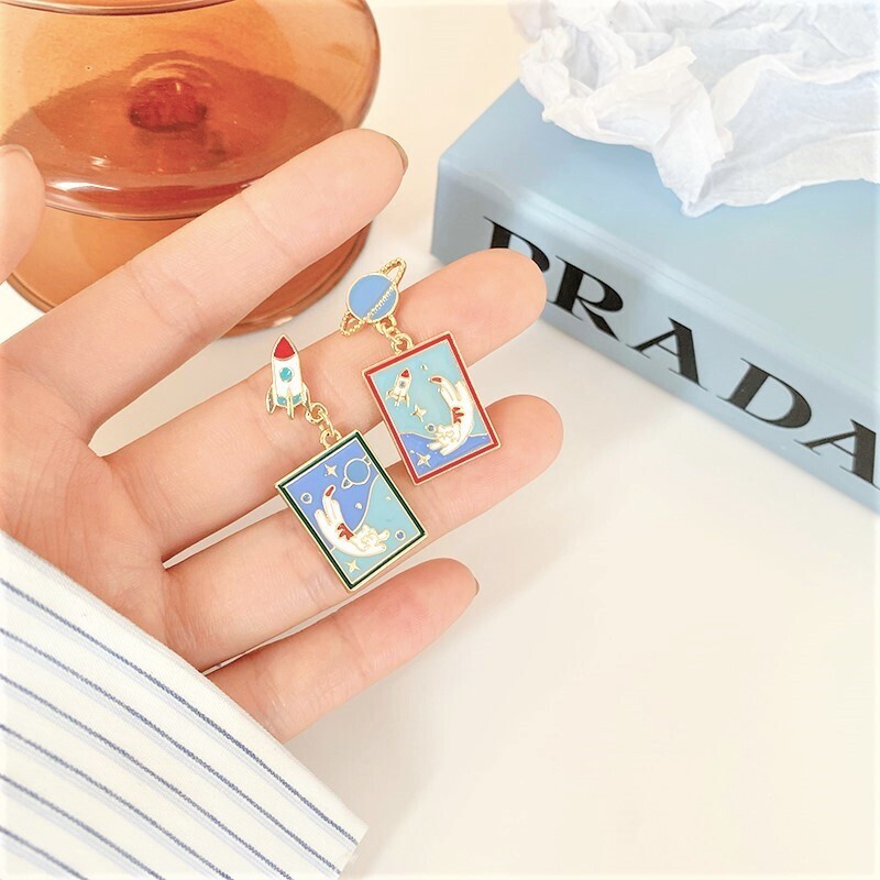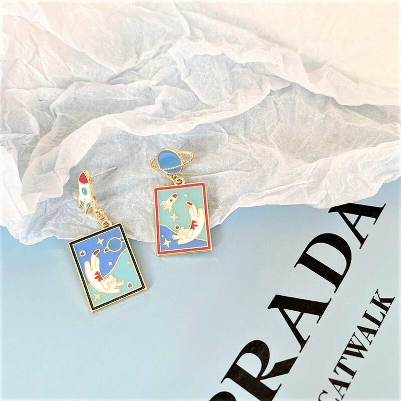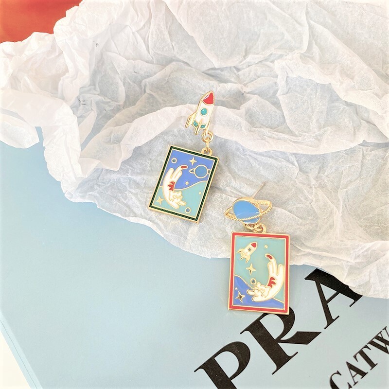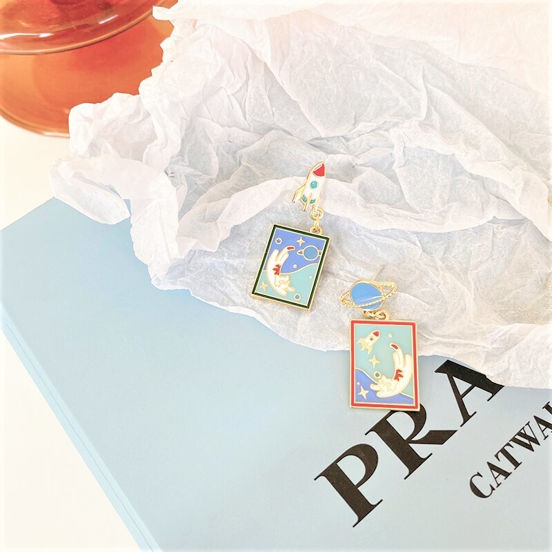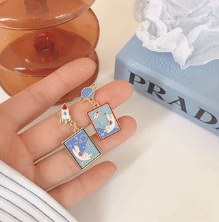 A whimsical journey into space with our Take Care of Earth Kitty Earrings! This playful asymmetrical set features a jet-setting rocket and planet stud, each holding a vivid enamel scene of a floating cat surrounded by stars. Lightweight and full of character, these earrings are perfect for space lovers and those who adore quirky, illustrated jewelry.