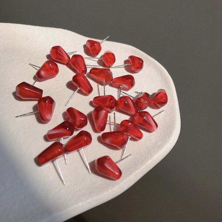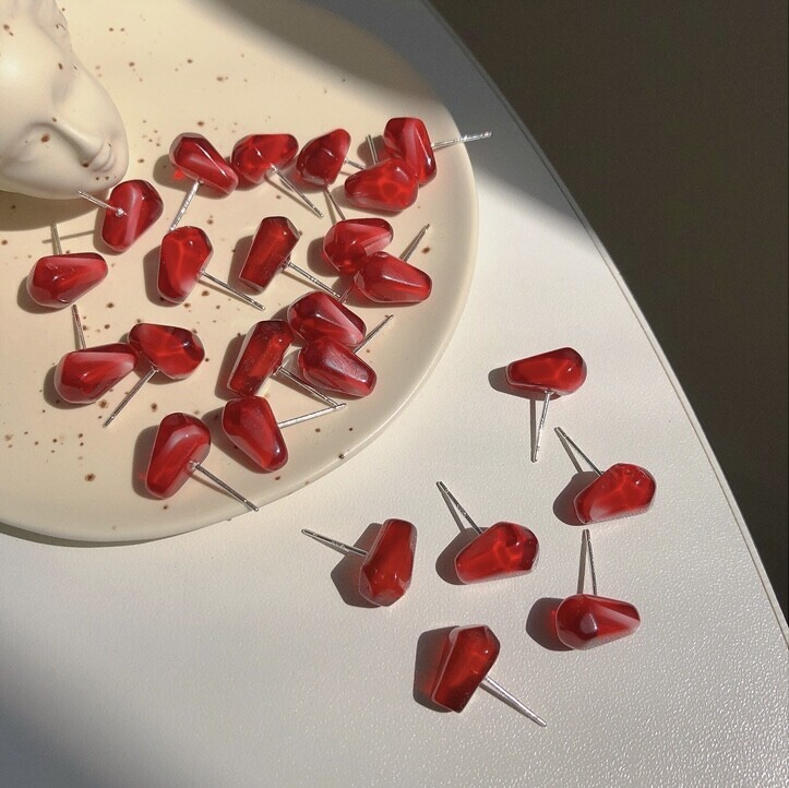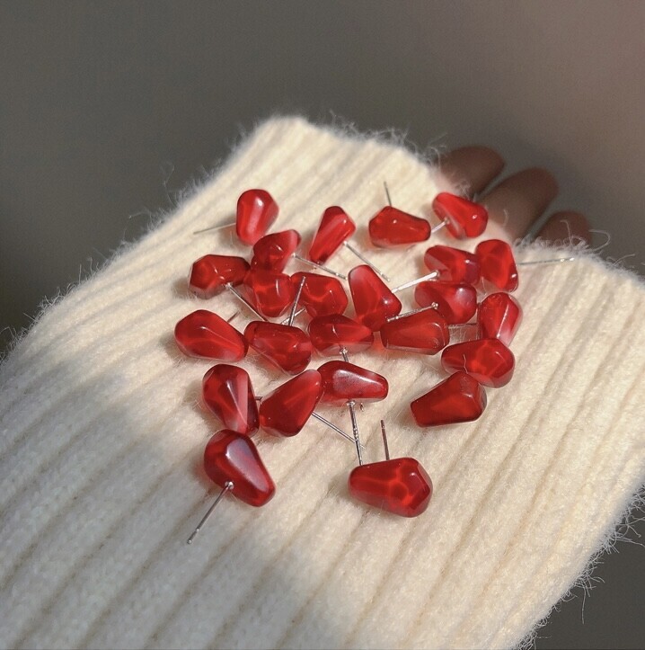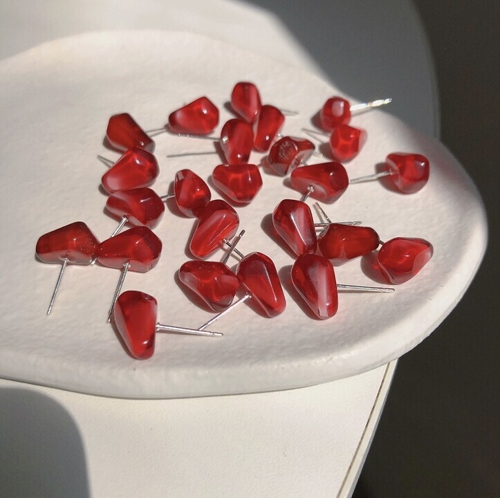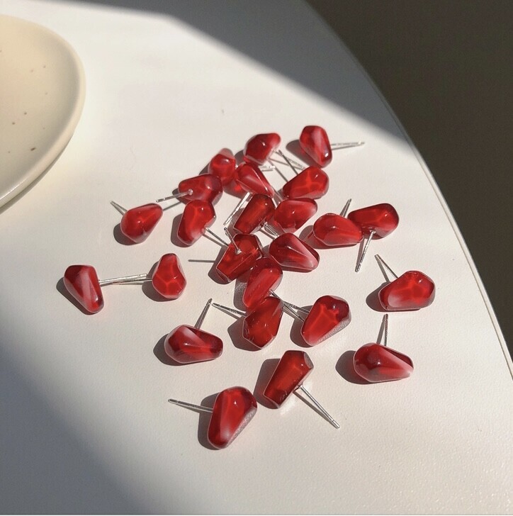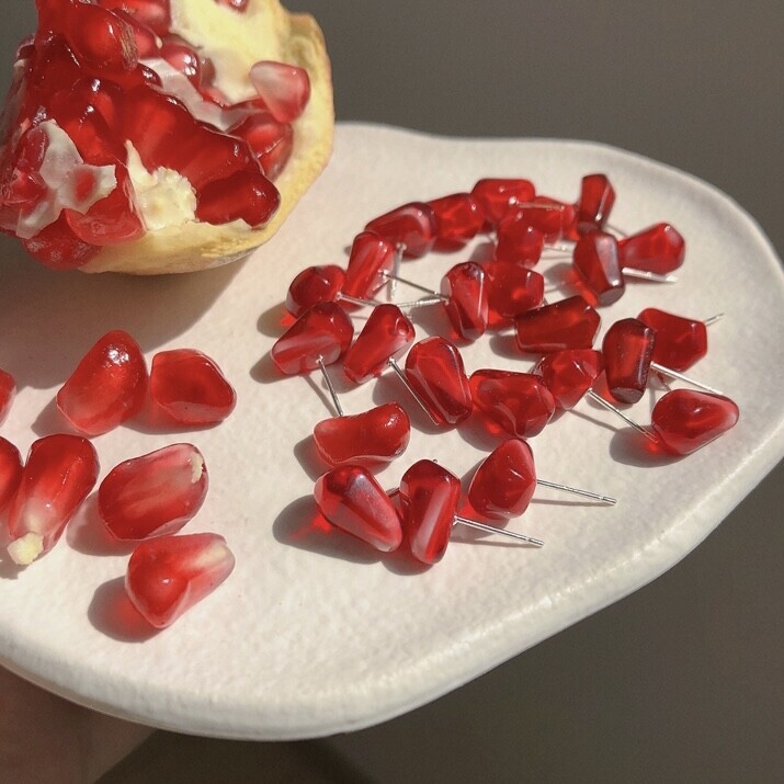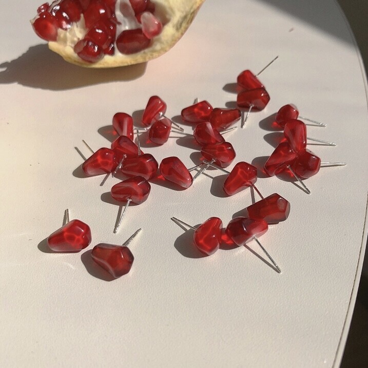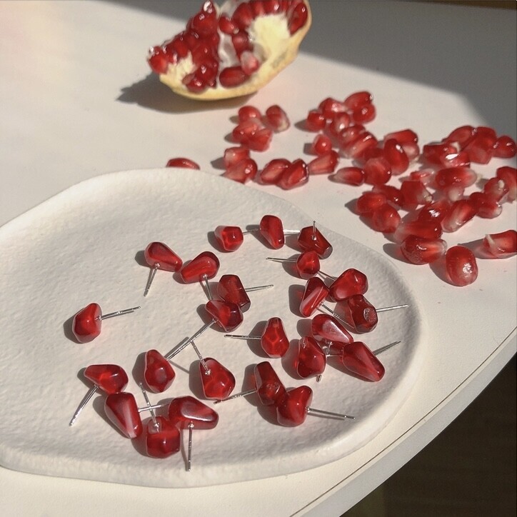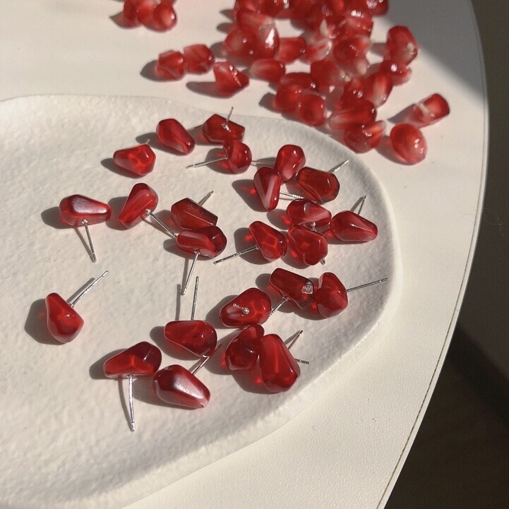 Tiny but bold –The Two Pomegranate Seeds earrings are inspired by the juicy, ruby-red sparkle of fresh pomegranate seeds.Their natural, irregular shapes and rich red hue add a minimalist yet playful accent to your everyday look.