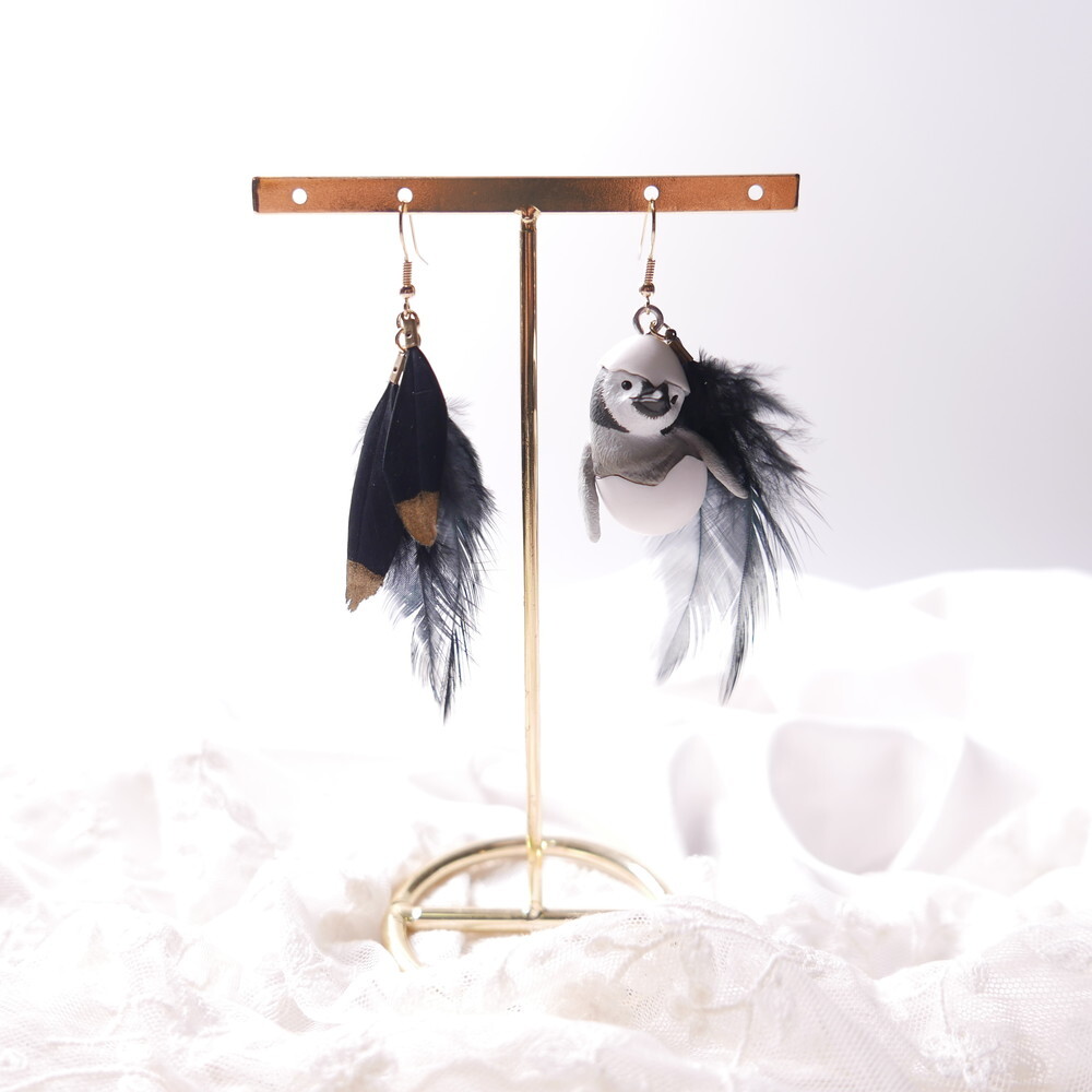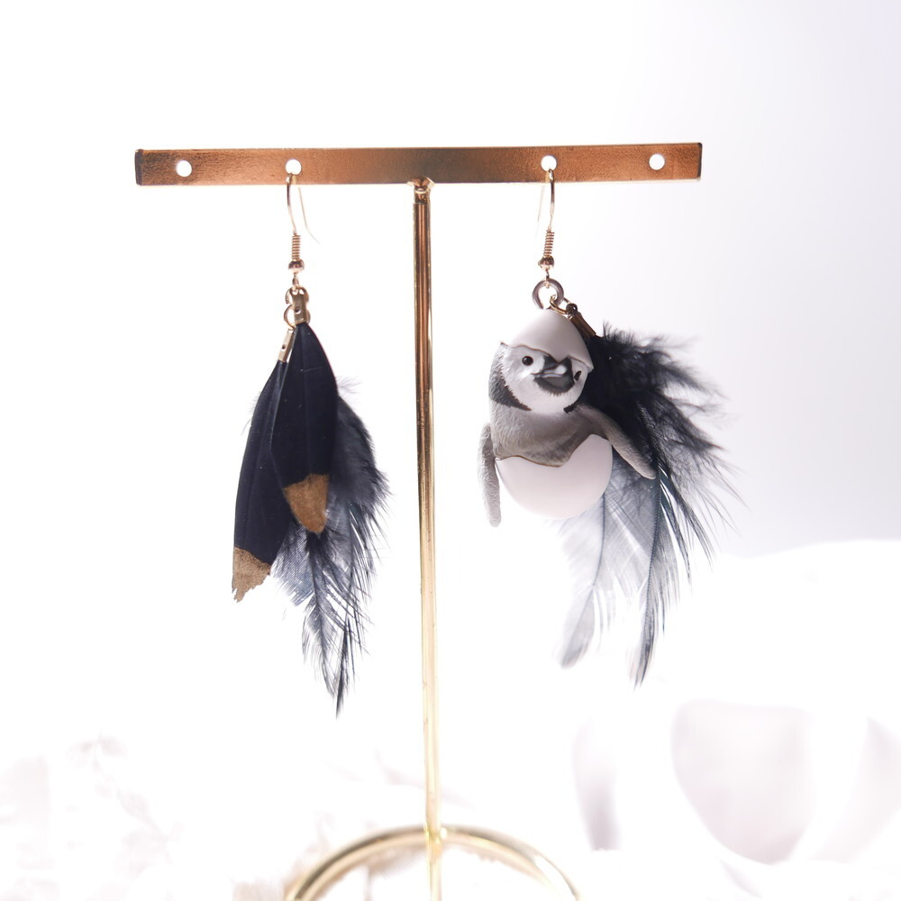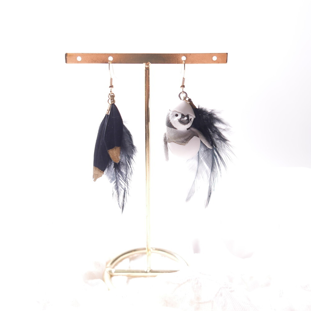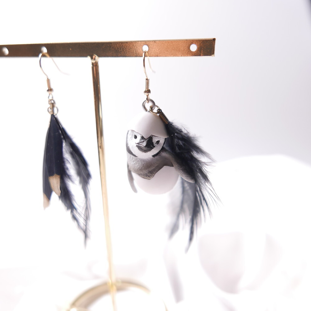 These whimsical asymmetrical earrings feature the charming character Koupenchan — a little penguin with a delightfully sulky expression — nestled inside a half egg and accented with rich black feathers dipped in gold.