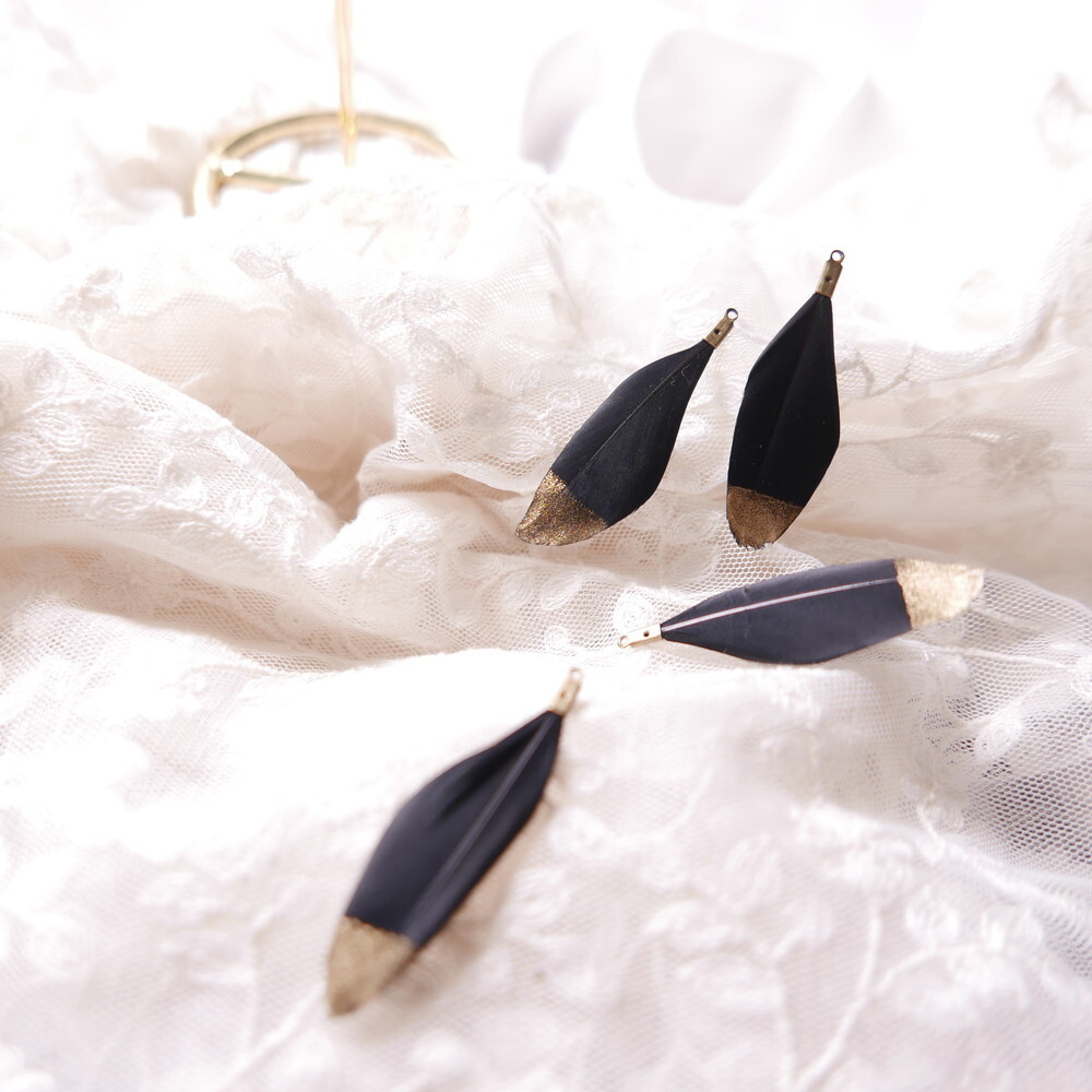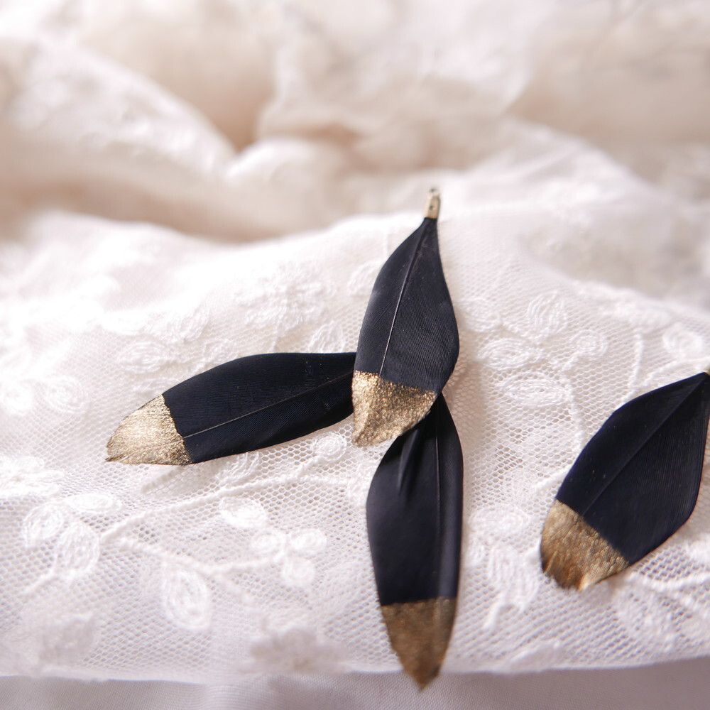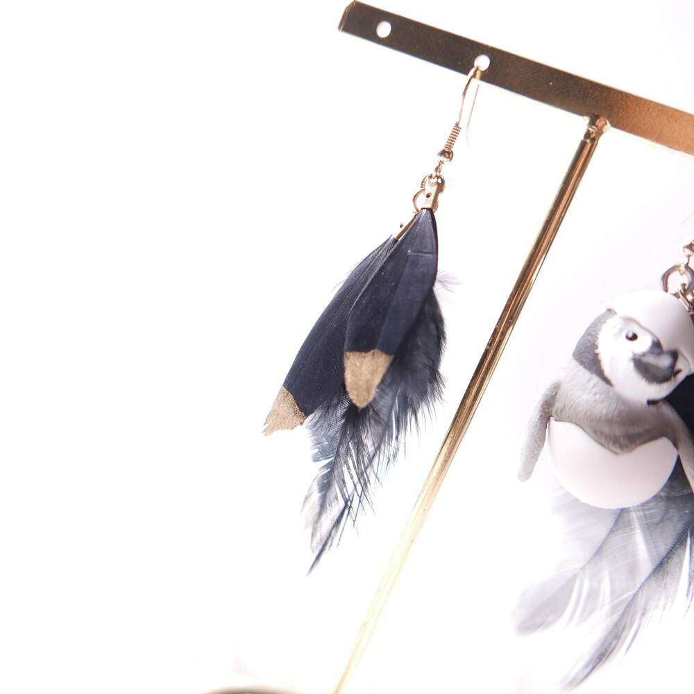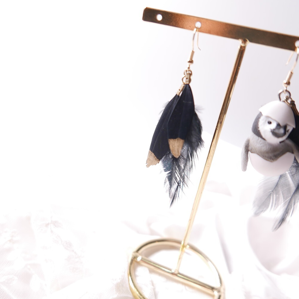 These whimsical asymmetrical earrings feature the charming character Koupenchan — a little penguin with a delightfully sulky expression — nestled inside a half egg and accented with rich black feathers dipped in gold.