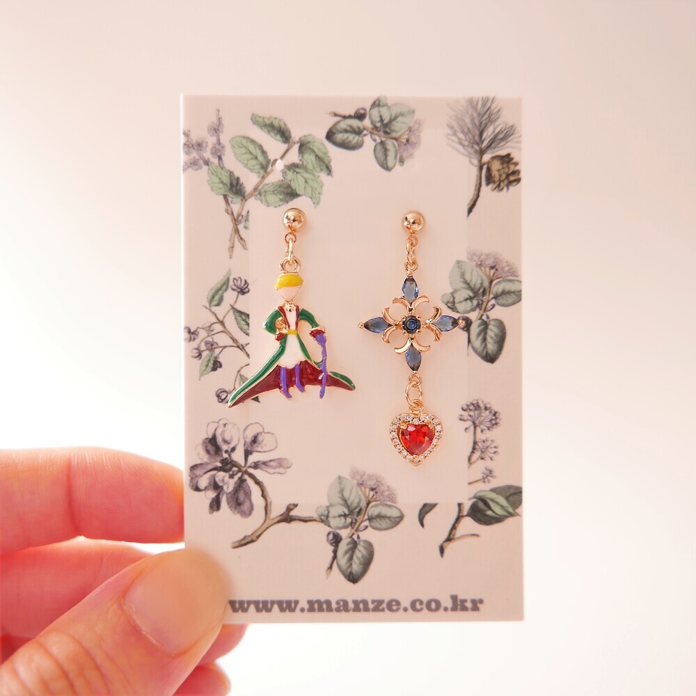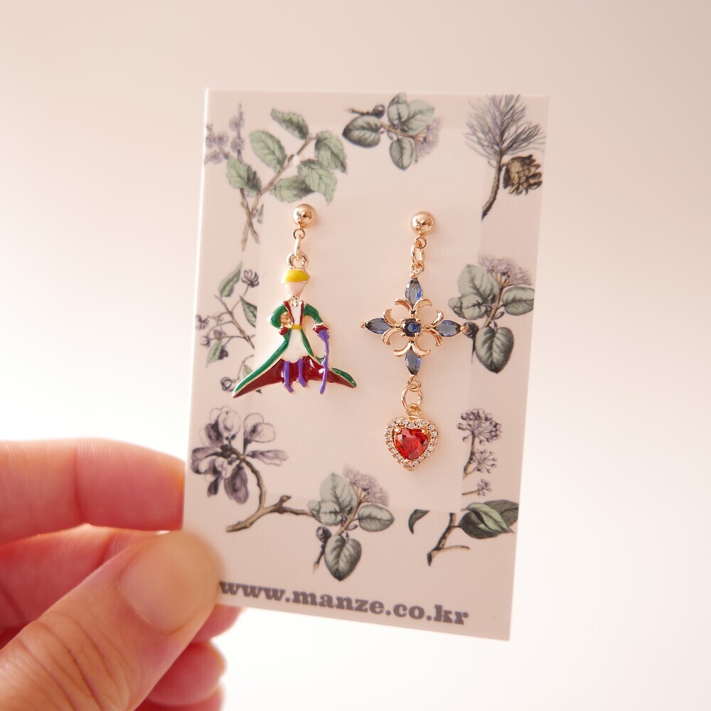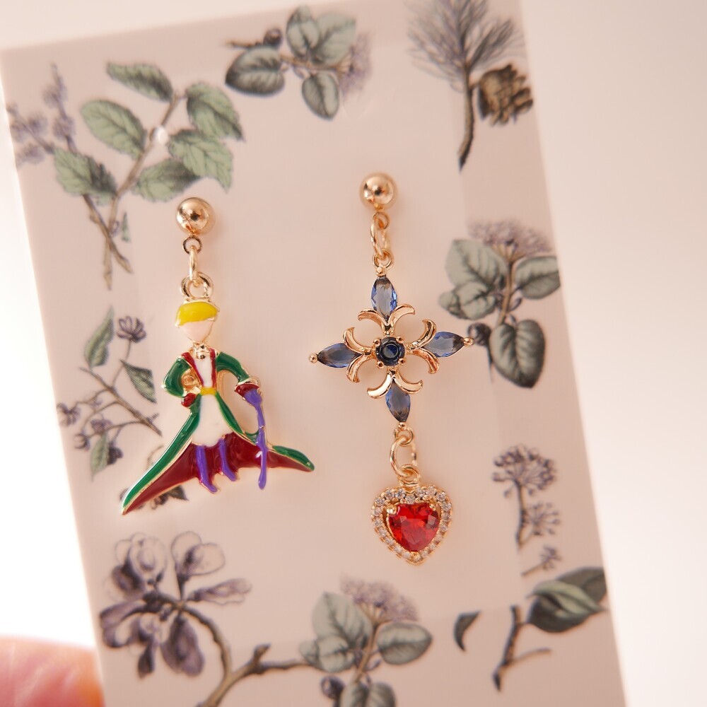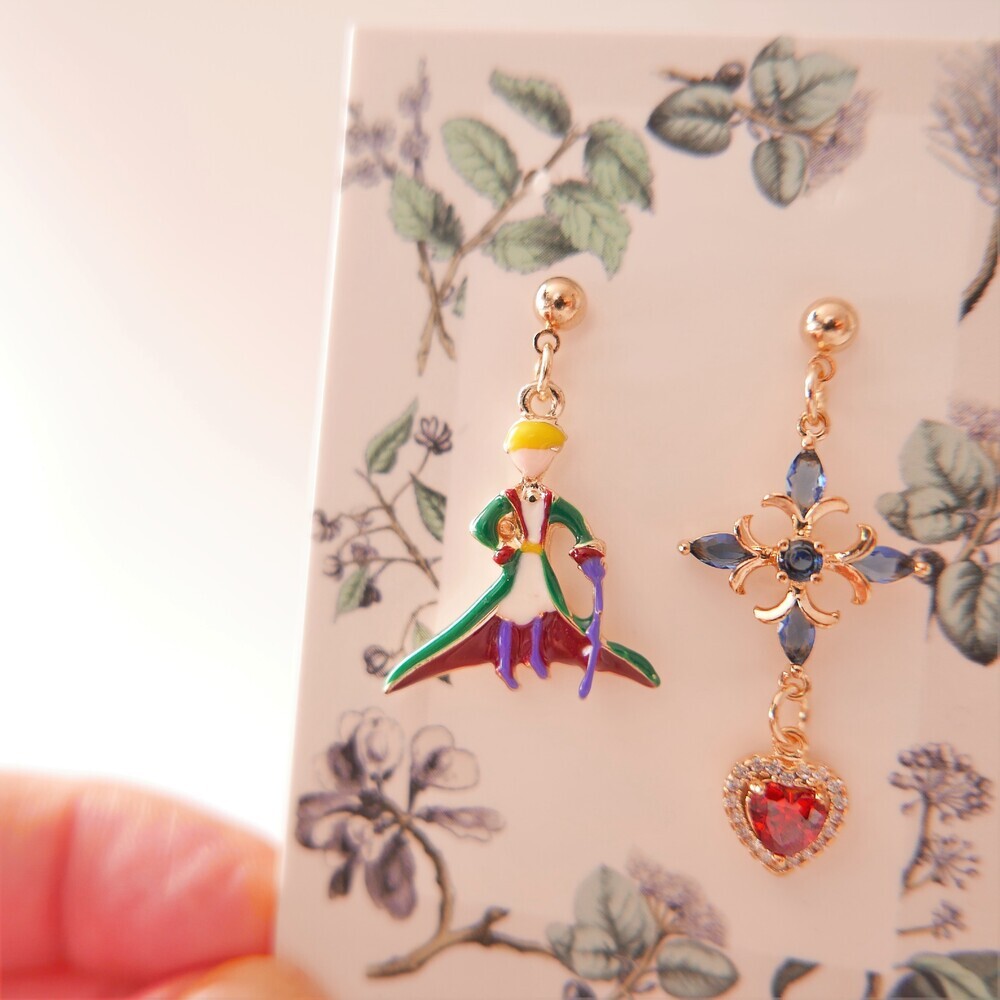 Inspired by the beloved tale, these earrings feature a miniature figure of the Little Prince in his green coat, paired with a charming floral crystal motif and a red heart gem. The asymmetrical design adds a unique, whimsical touch to your everyday style.