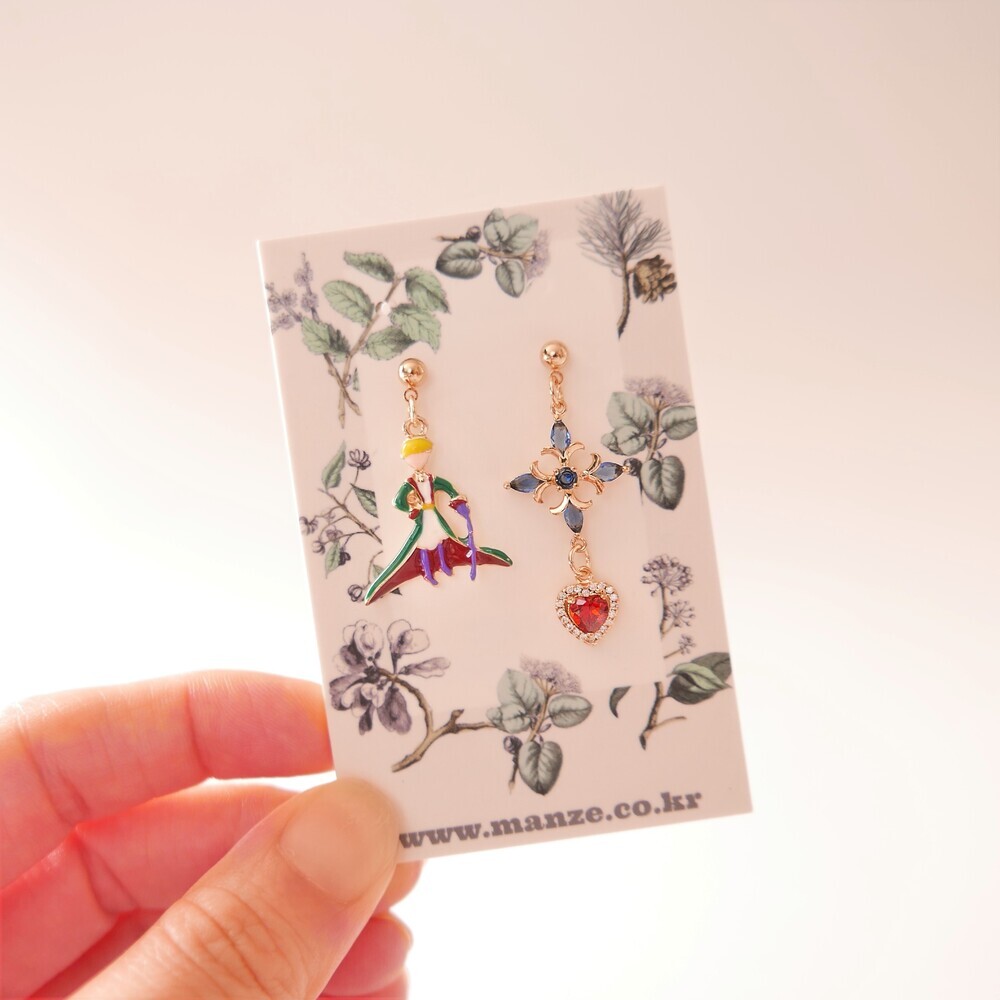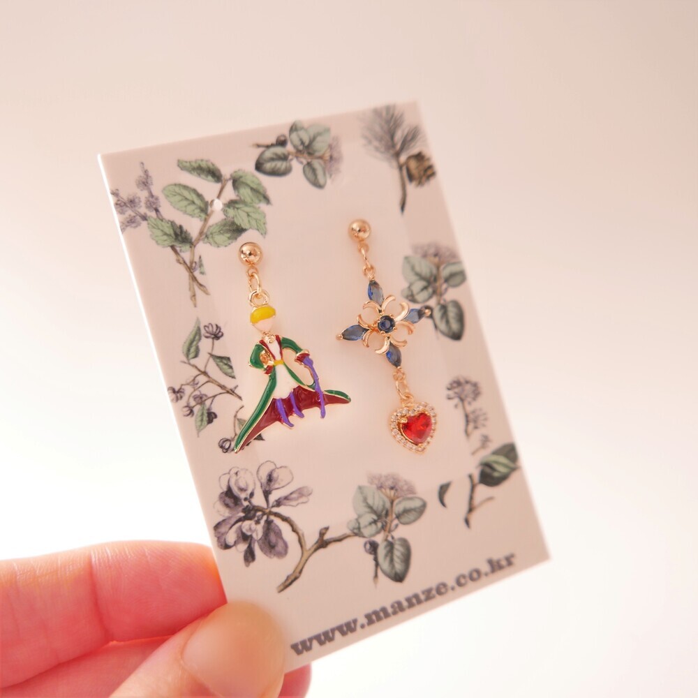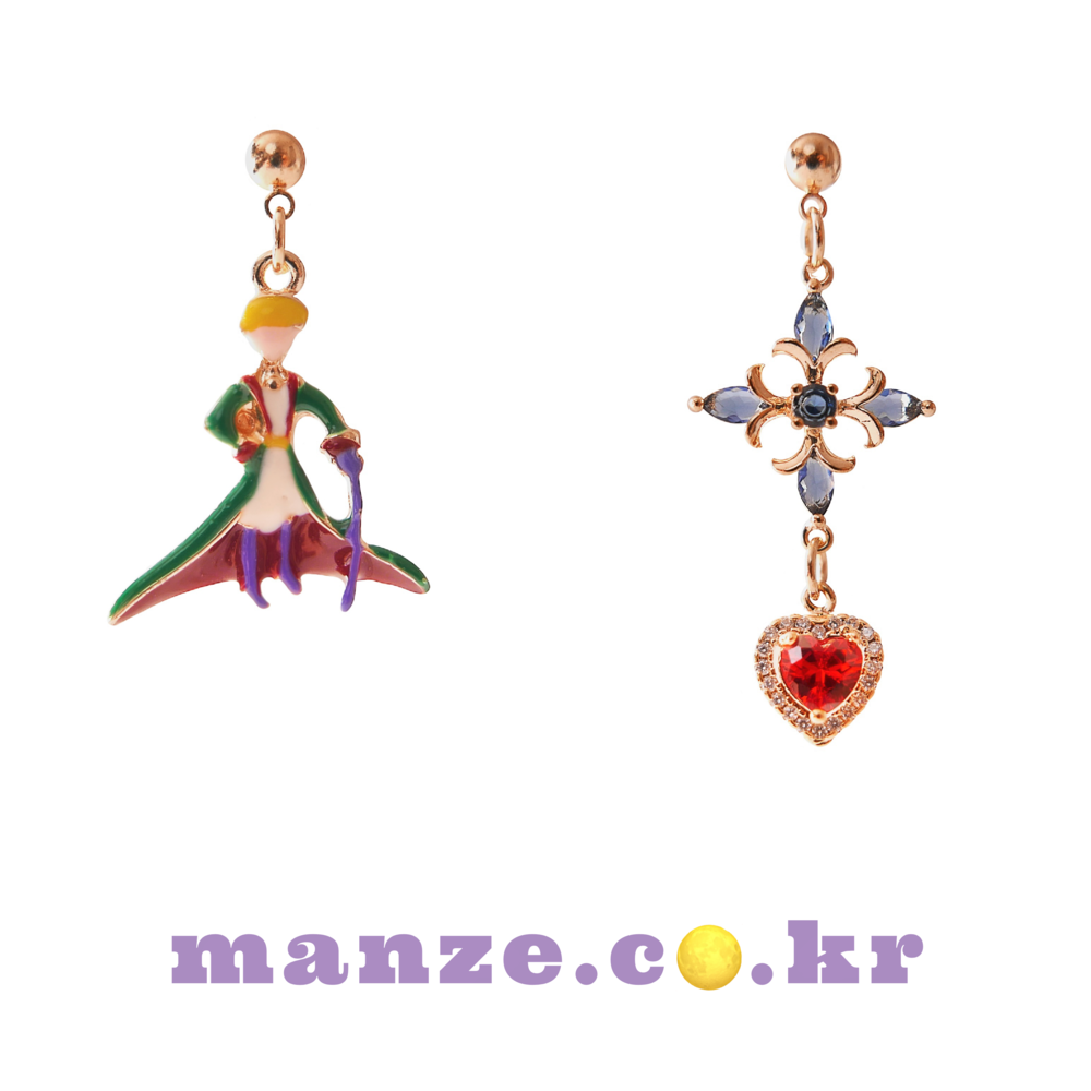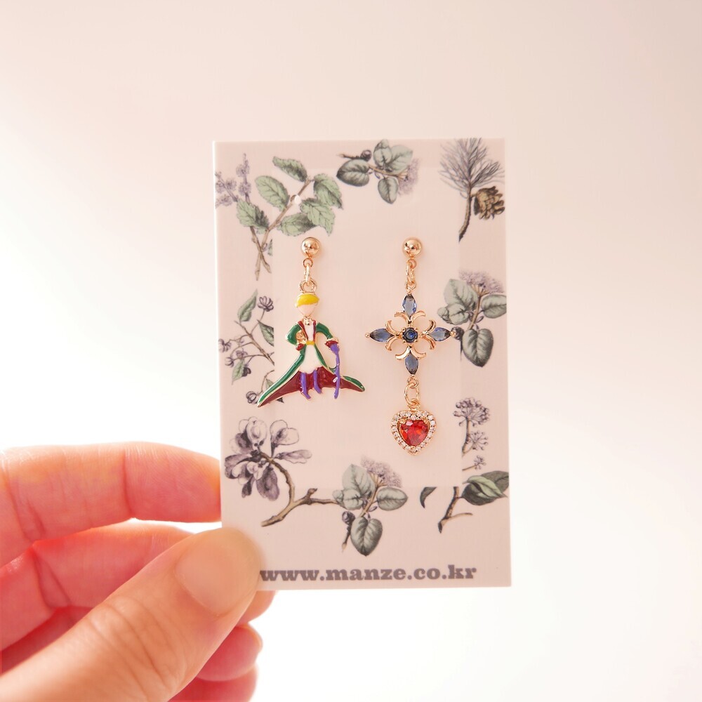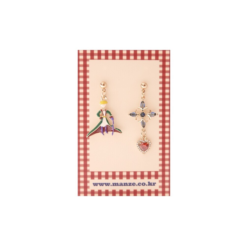Inspired by the beloved tale, these earrings feature a miniature figure of the Little Prince in his green coat, paired with a charming floral crystal motif and a red heart gem. The asymmetrical design adds a unique, whimsical touch to your everyday style.