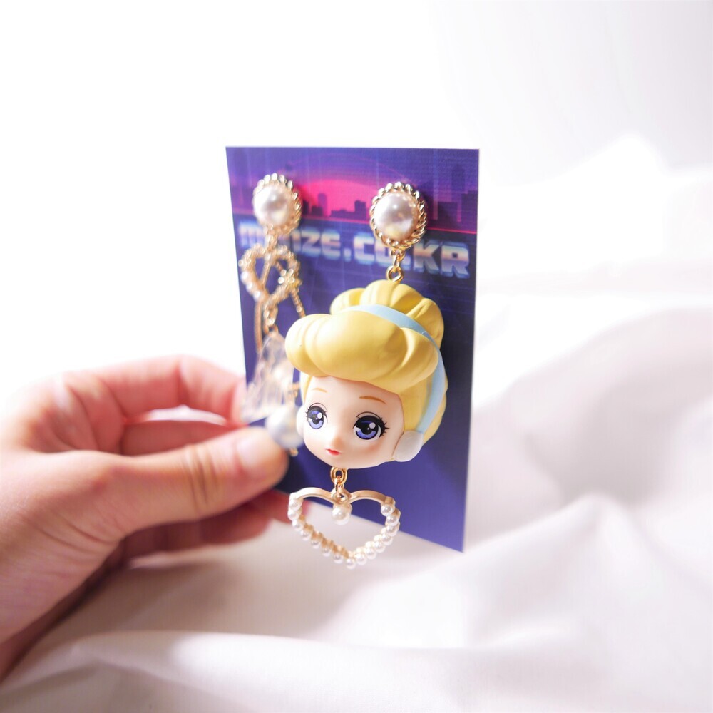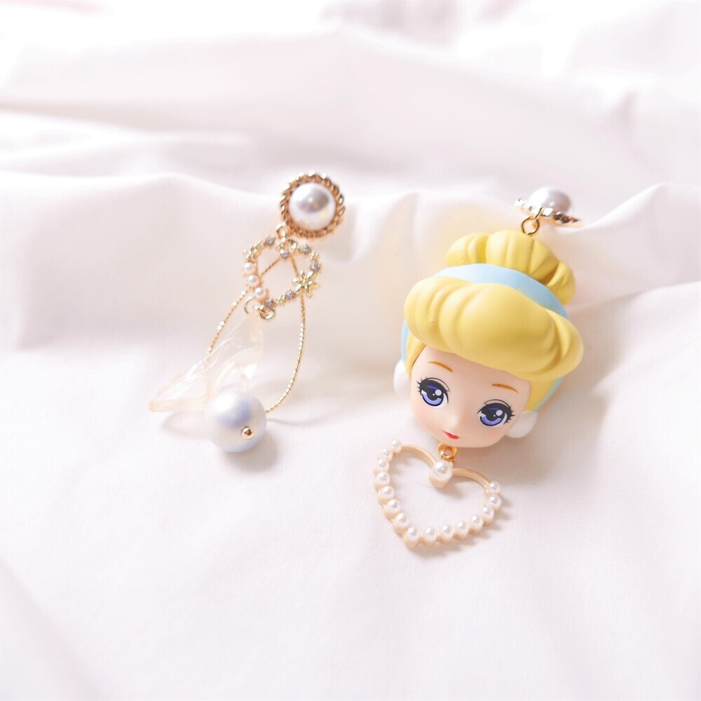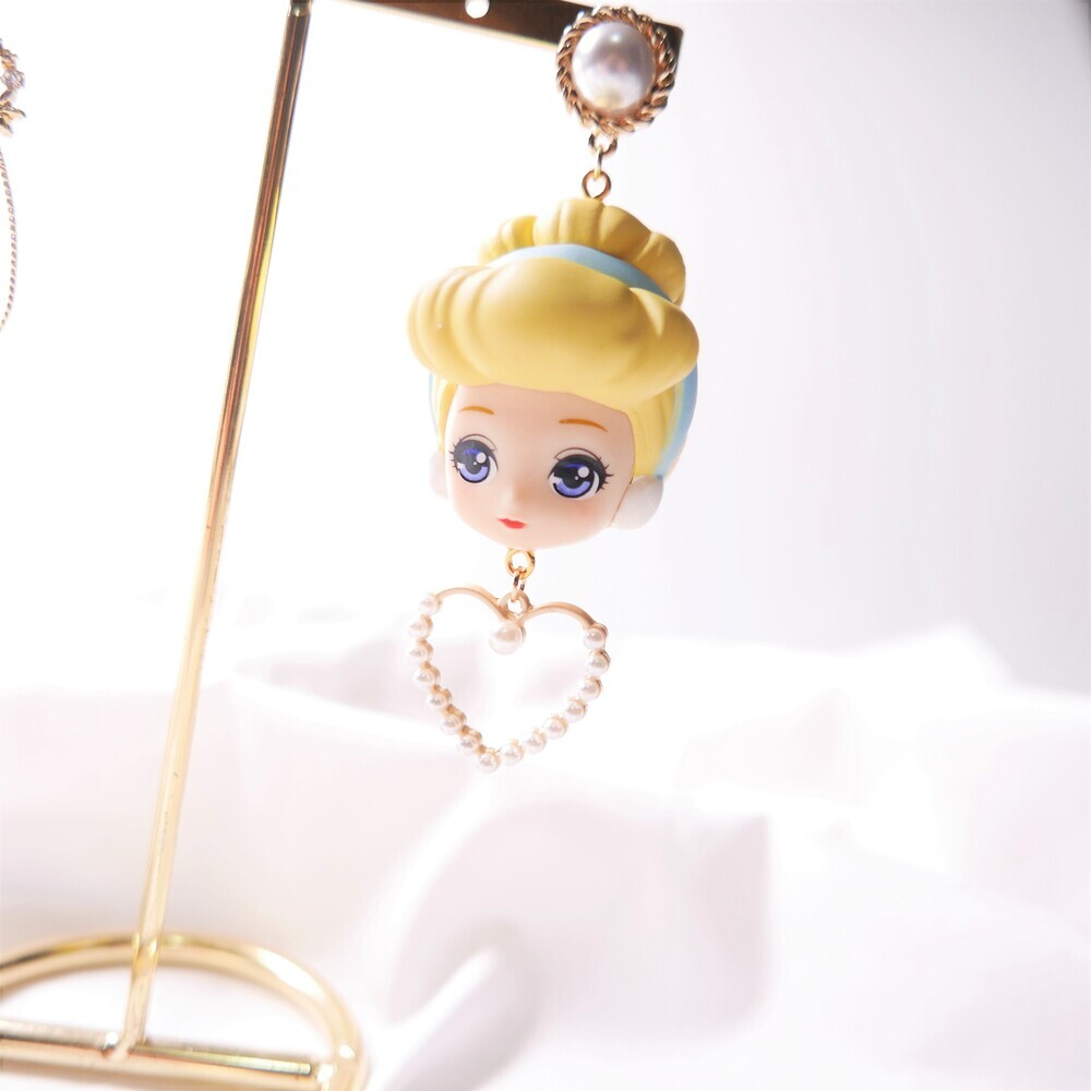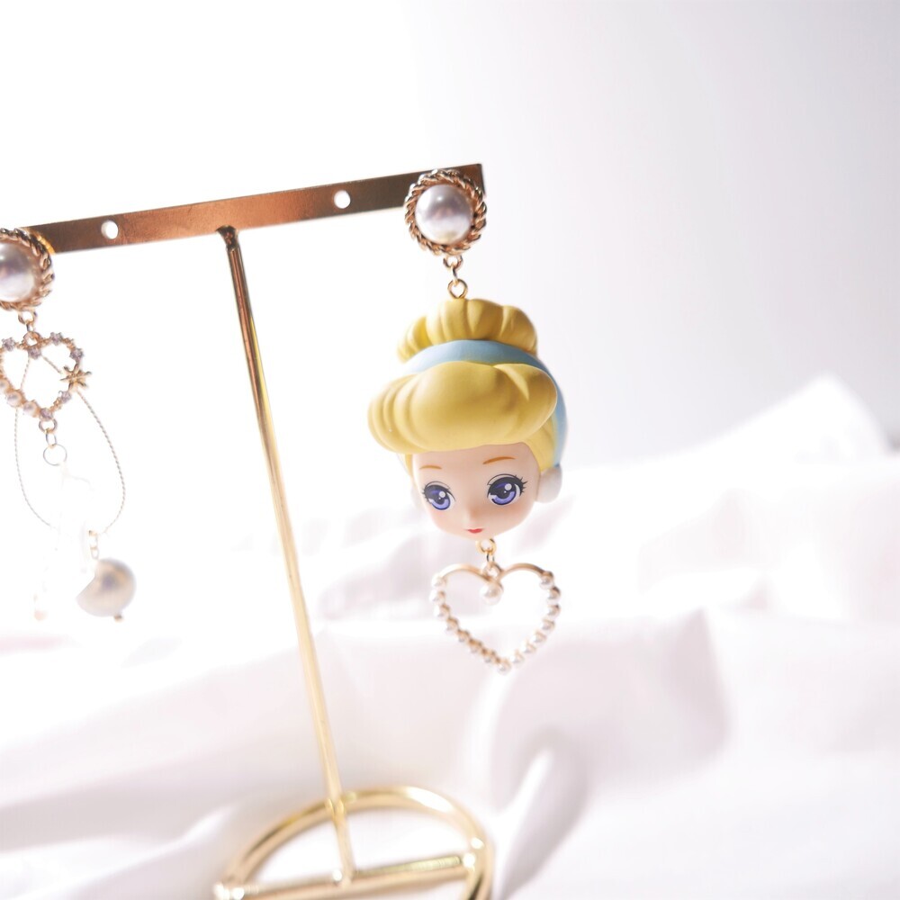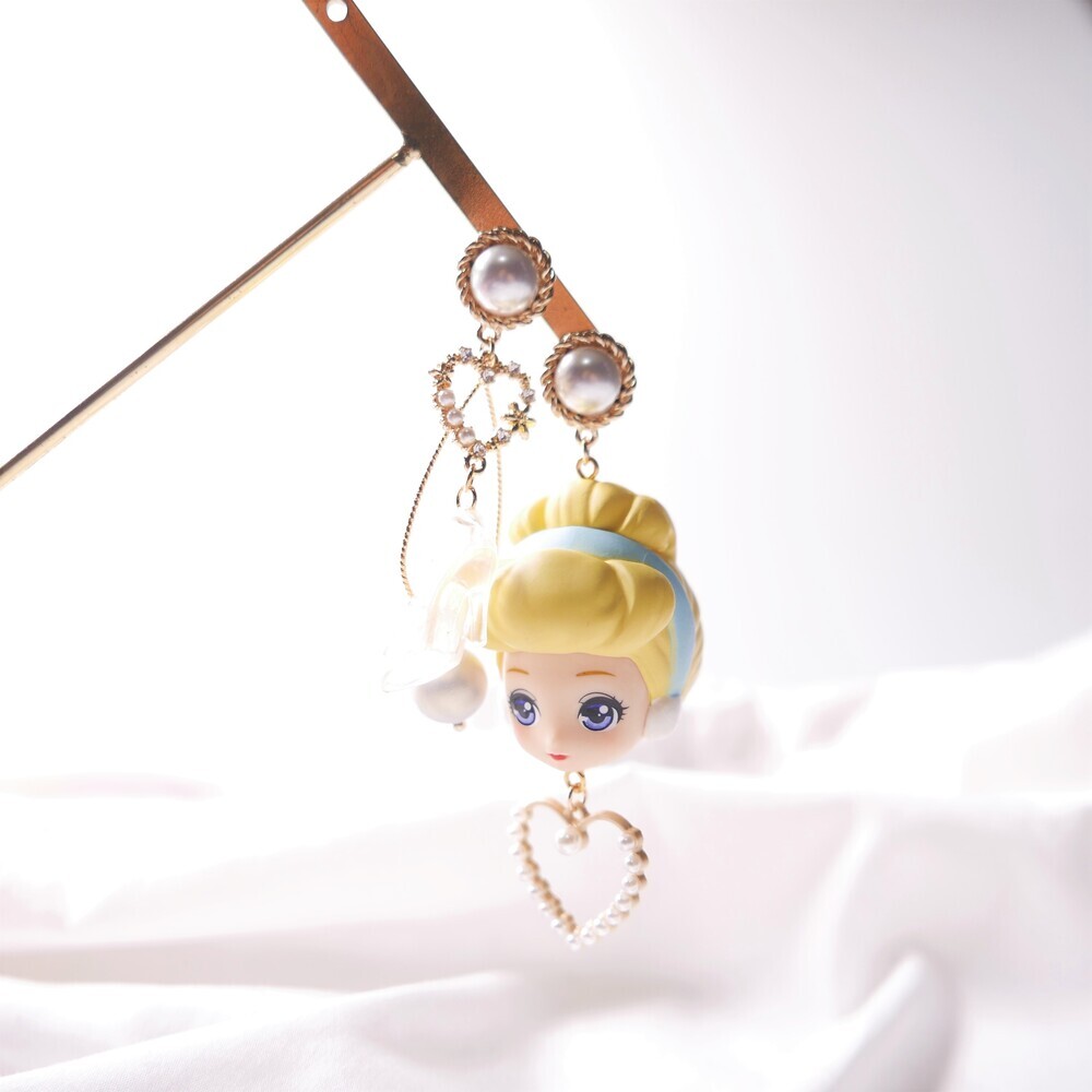 Step into a fairytale with our Cinderella Bebe Earrings. Featuring an adorable chibi-style Cinderella with her iconic blonde updo, paired with a shimmering glass slipper and elegant pearl accents. This asymmetrical set is a dreamy tribute to the classic princess, perfect for fans of storybook magic and whimsical elegance.