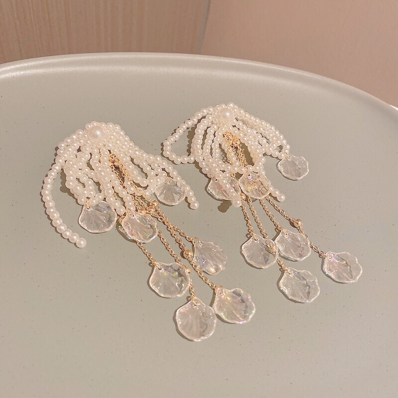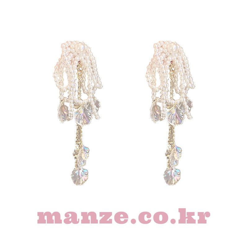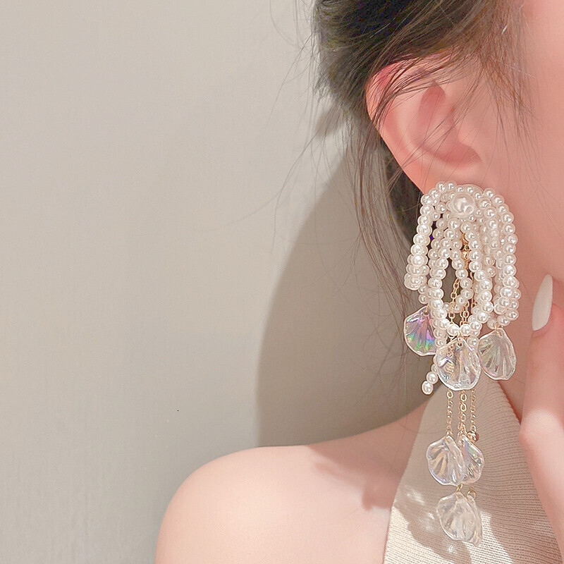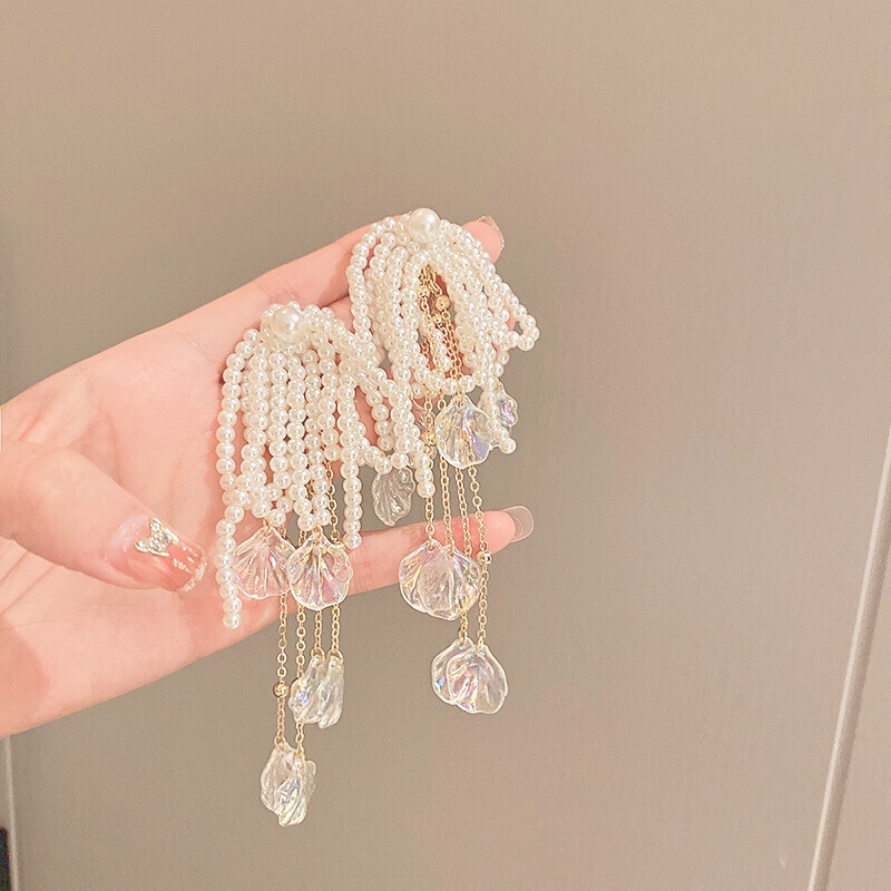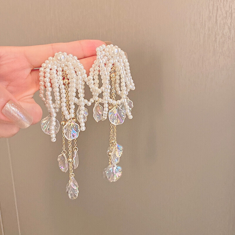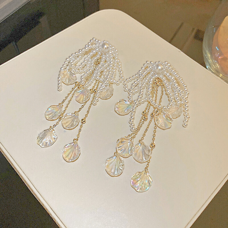Pearl Beads Shellfish Long Drop Earrings