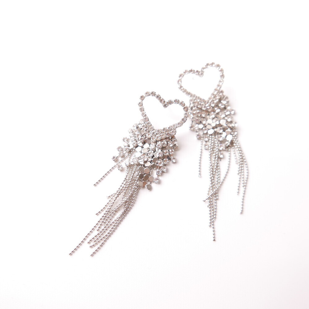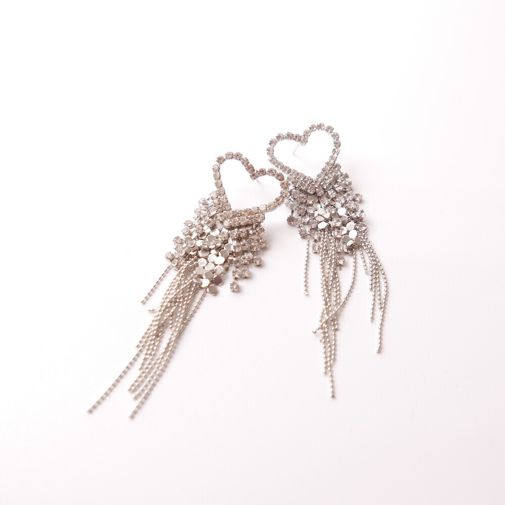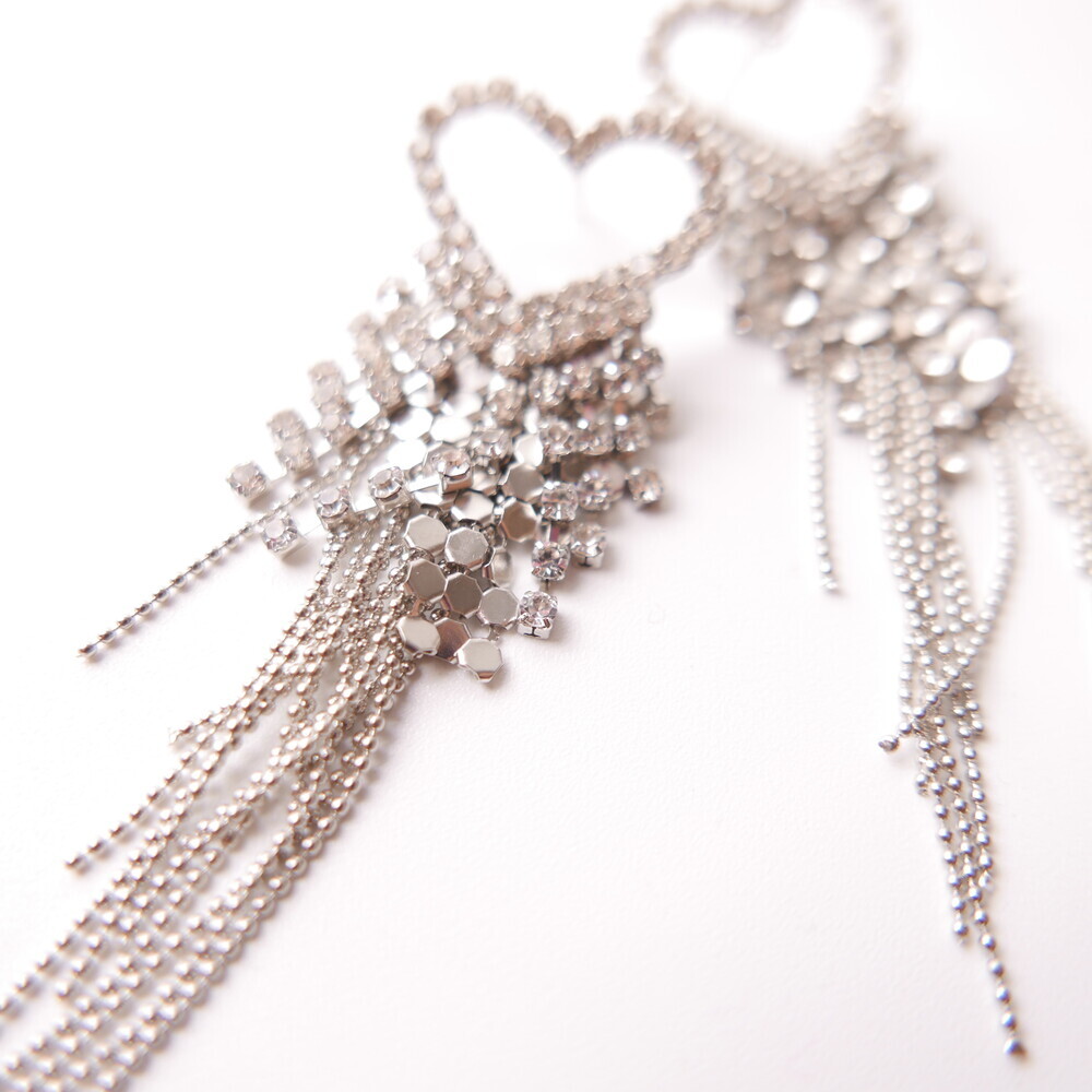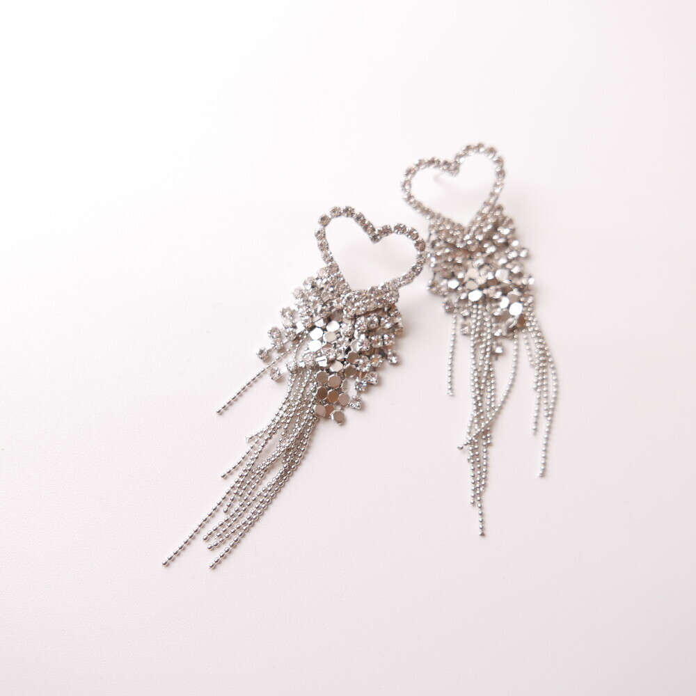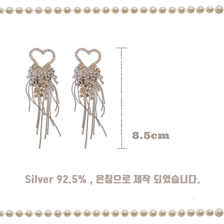 These dazzling earrings are crafted to capture attention. Featuring a sparkling heart-shaped top and cascading chains, this glamorous pair was worn by LIGHTSUM’s Nayoung and Miss Korea Global Park Naun. Made with 92.5% silver posts, they're perfect for adding flair to any look.