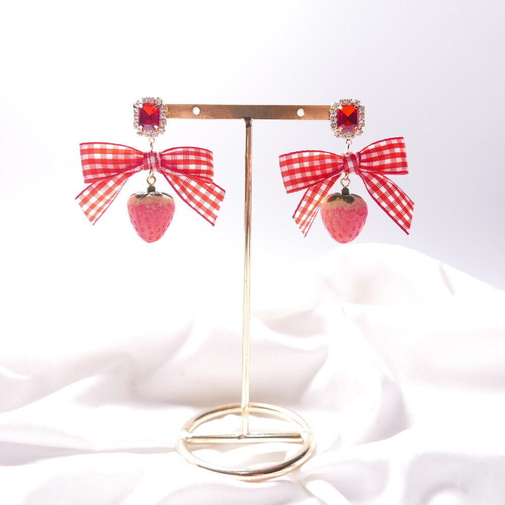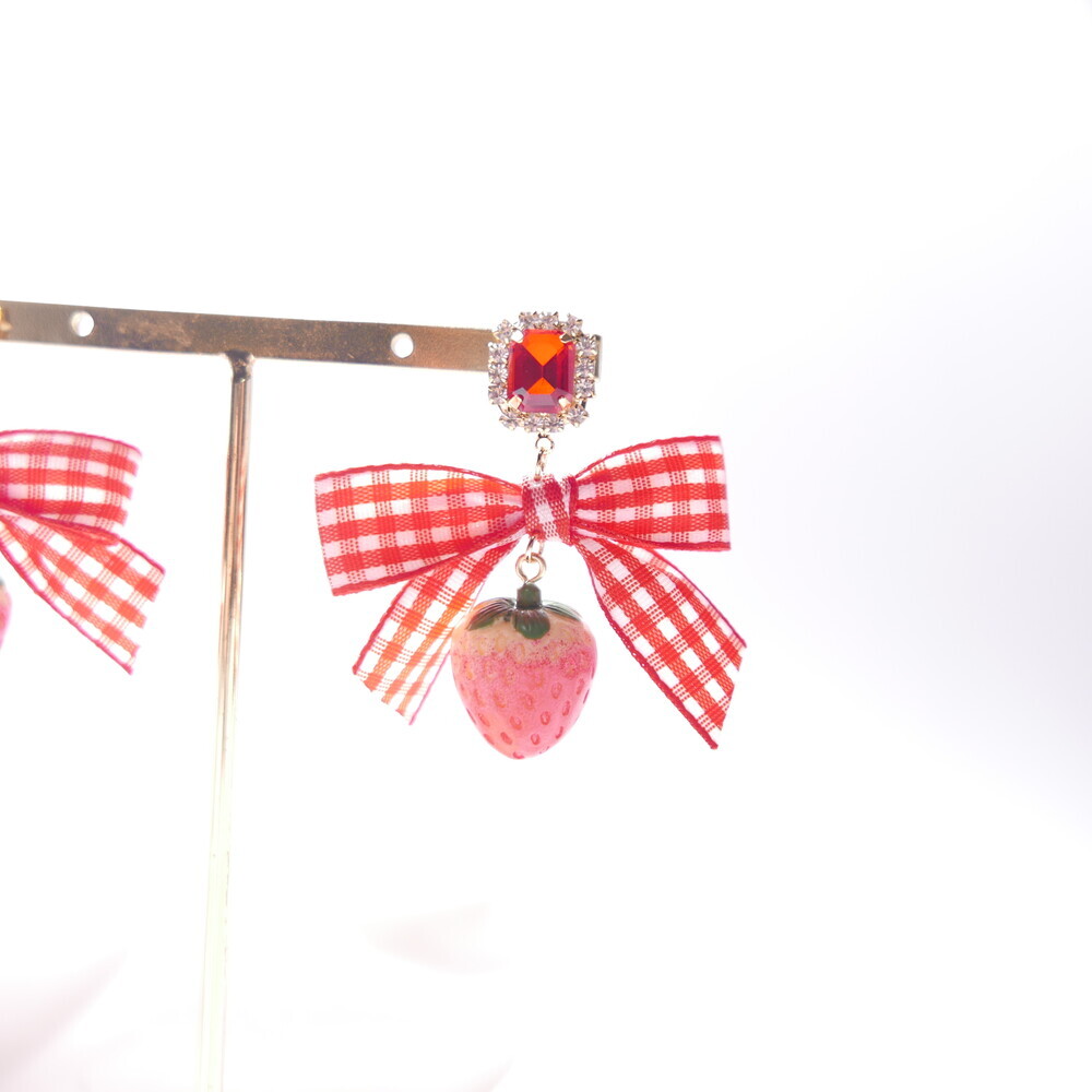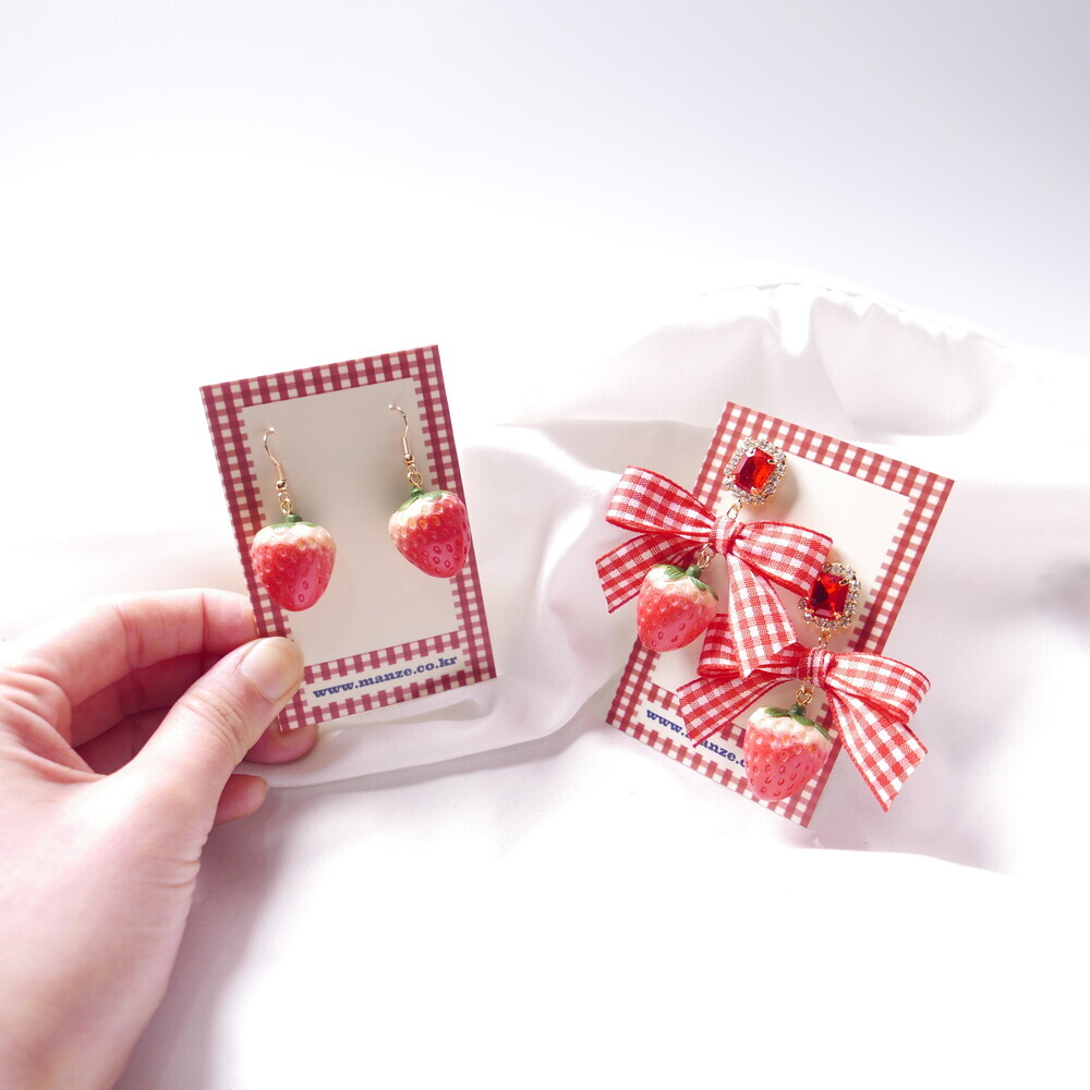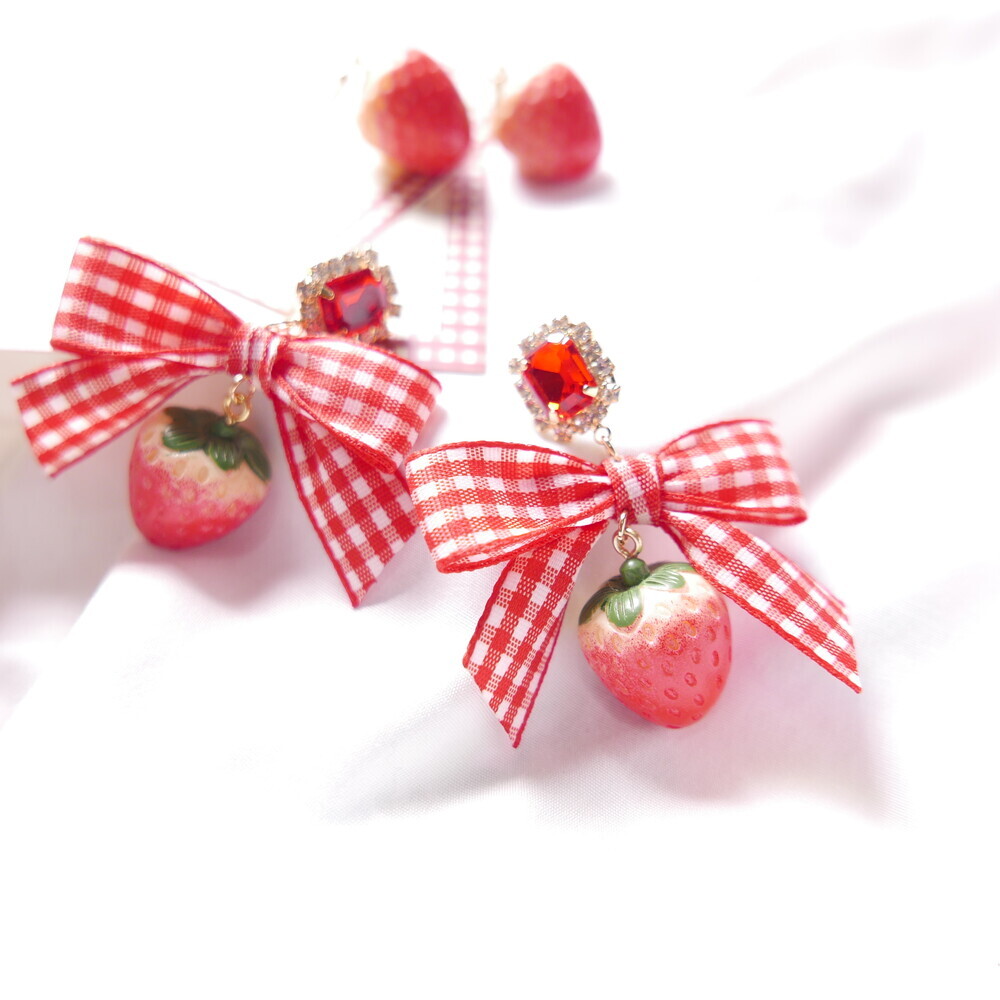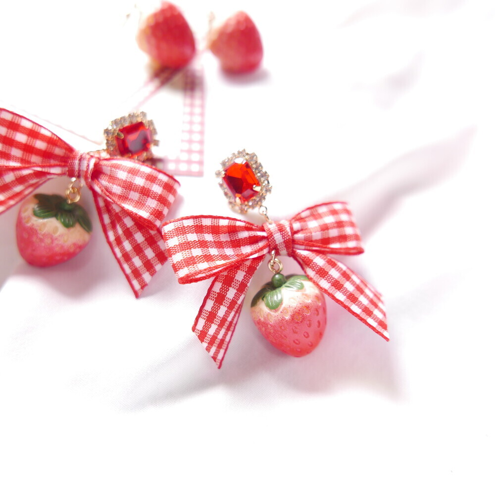 Bring a juicy pop of color to your outfit with these Real Strawberry earrings. Available in two styles: a bold gingham bow version or a clean single strawberry dangle. The glossy finish and 3D realism of the strawberries make them truly stand out. Loved by idols including Rocket Punch's Sohee and aespa's Karina, these earrings are perfect for adding a cute, standout touch to your everyday or special occasion looks.