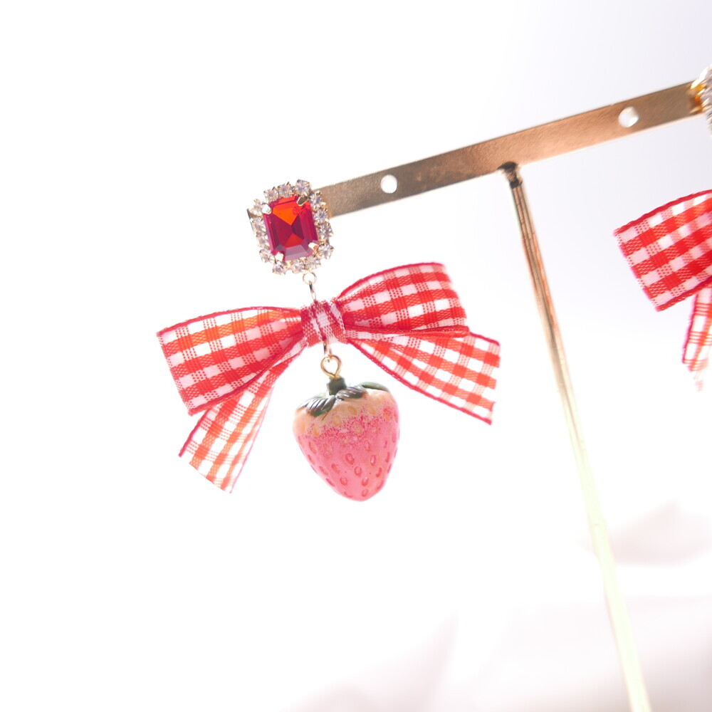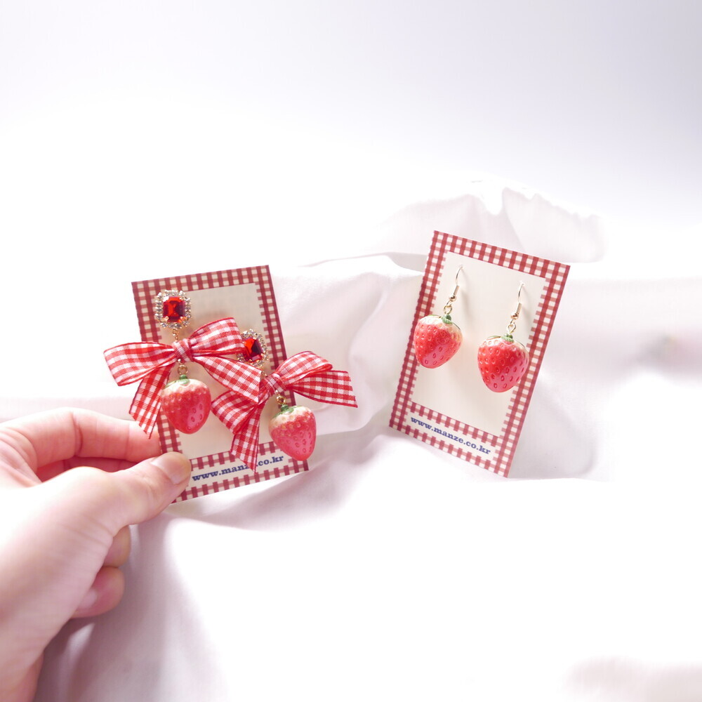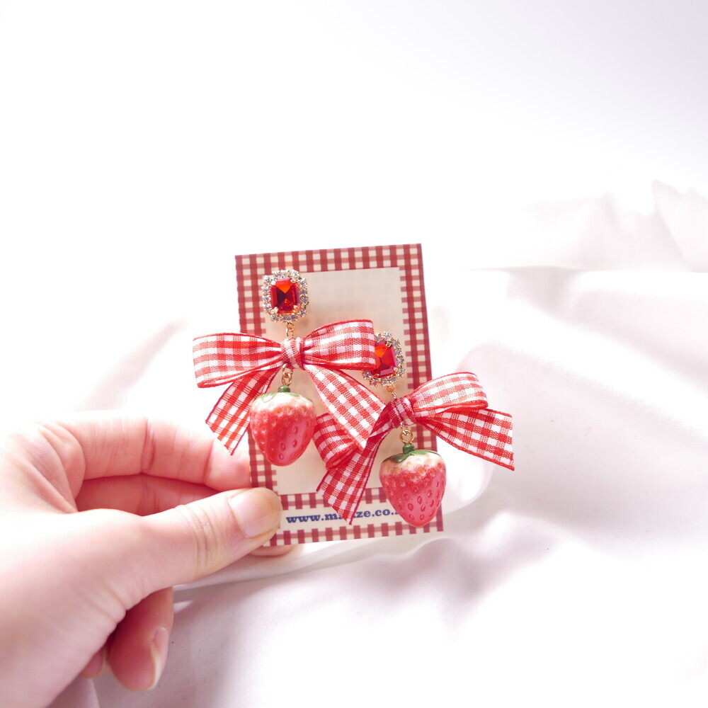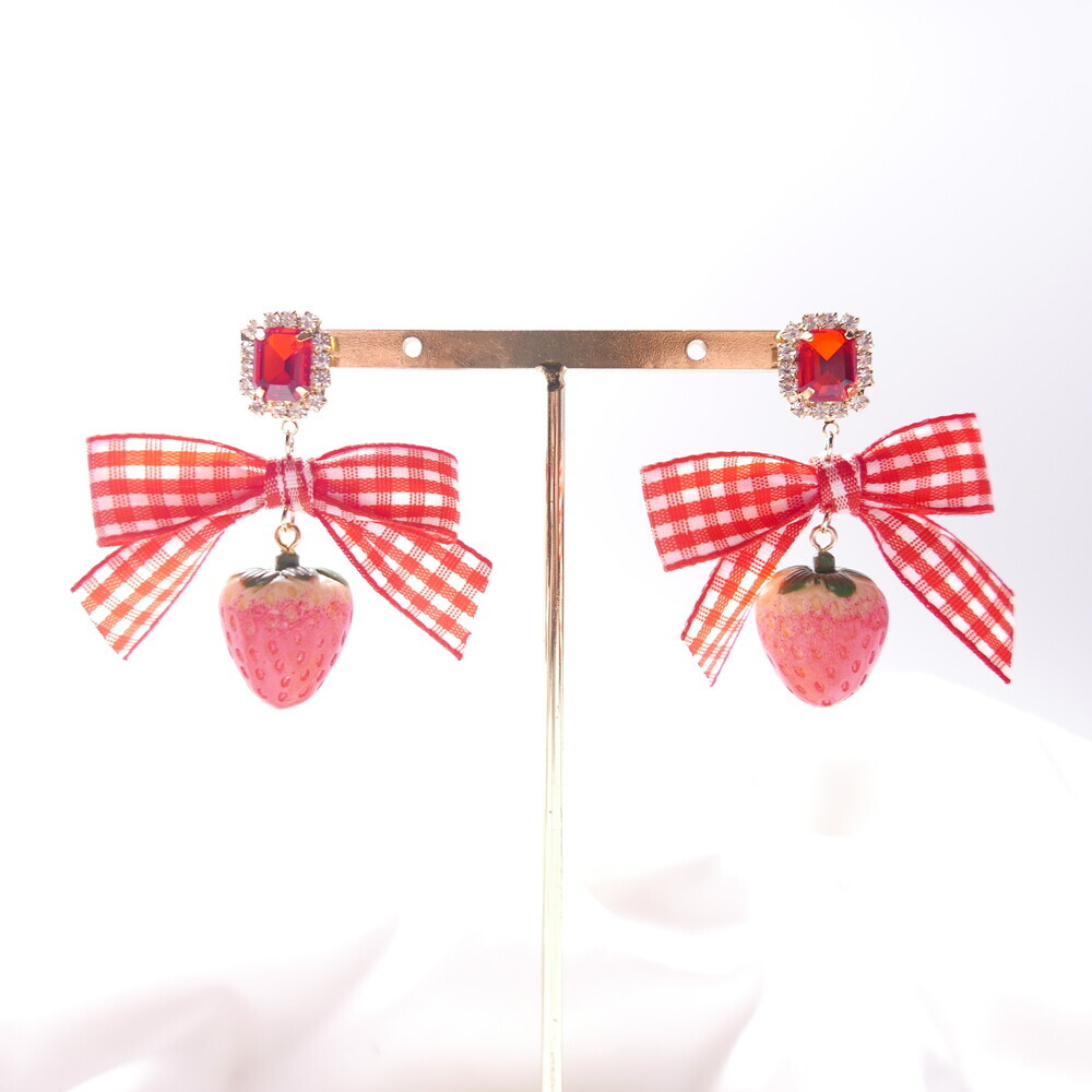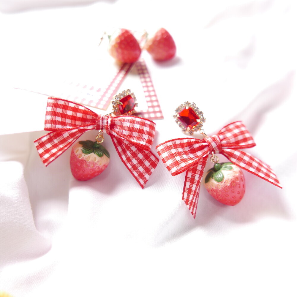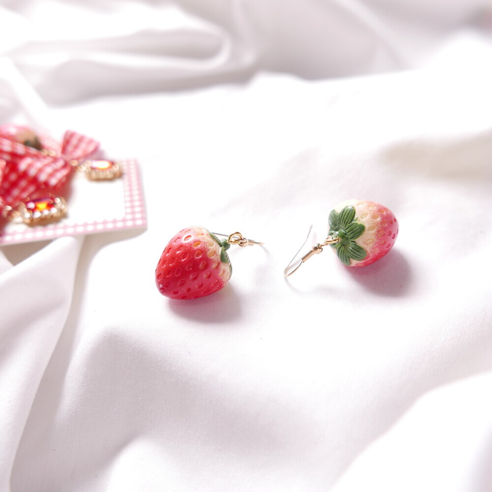 Bring a juicy pop of color to your outfit with these Real Strawberry earrings. Available in two styles: a bold gingham bow version or a clean single strawberry dangle. The glossy finish and 3D realism of the strawberries make them truly stand out. Loved by idols including Rocket Punch's Sohee and aespa's Karina, these earrings are perfect for adding a cute, standout touch to your everyday or special occasion looks.