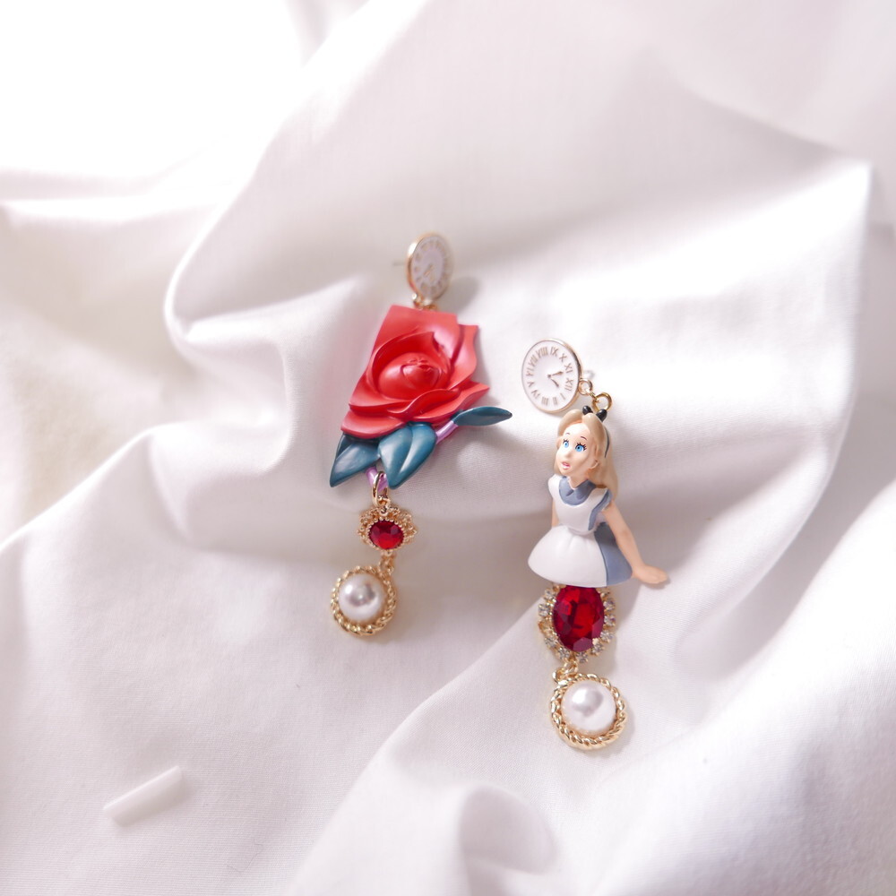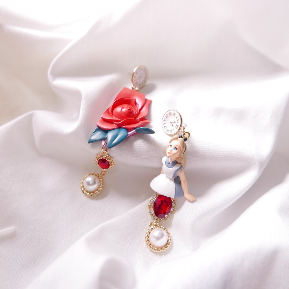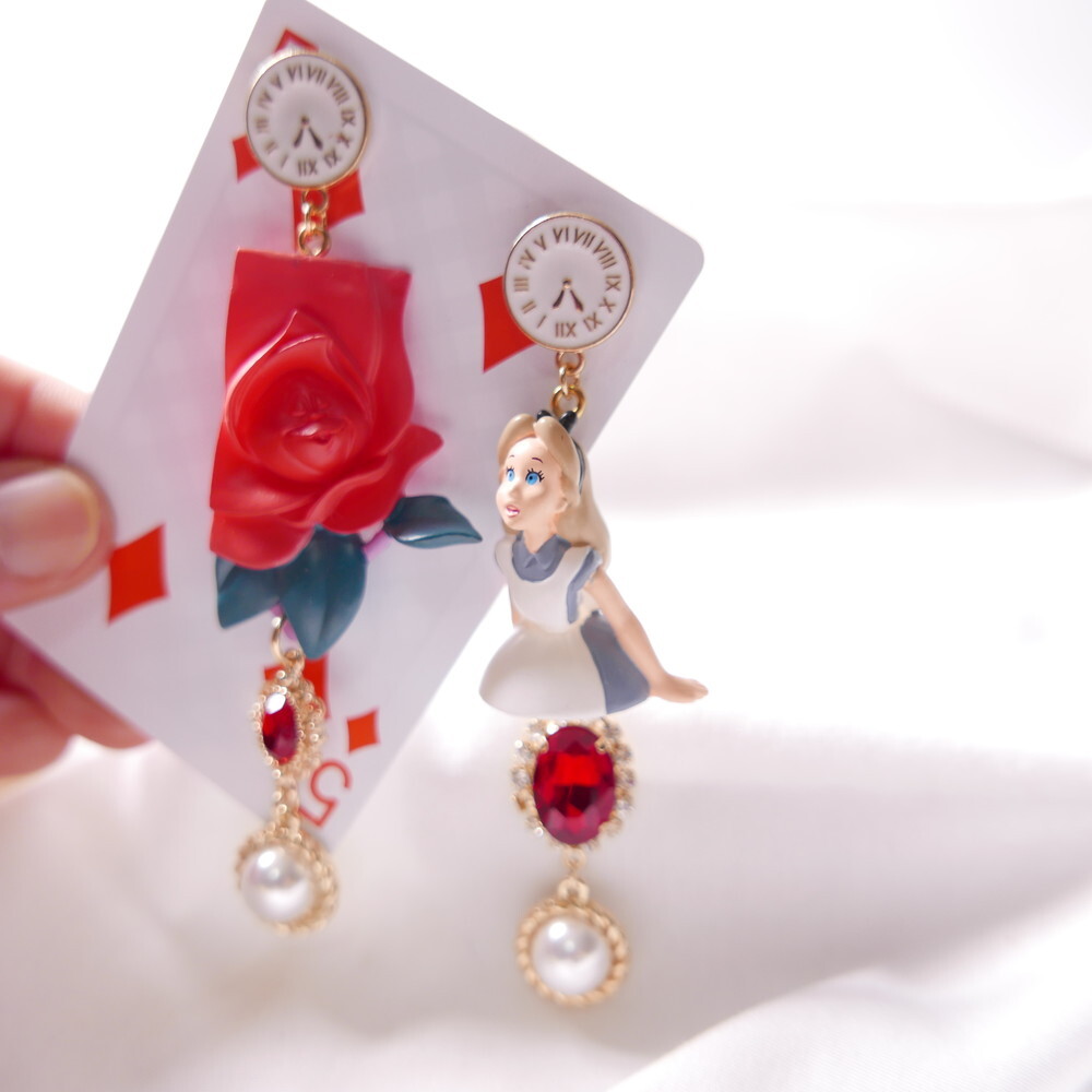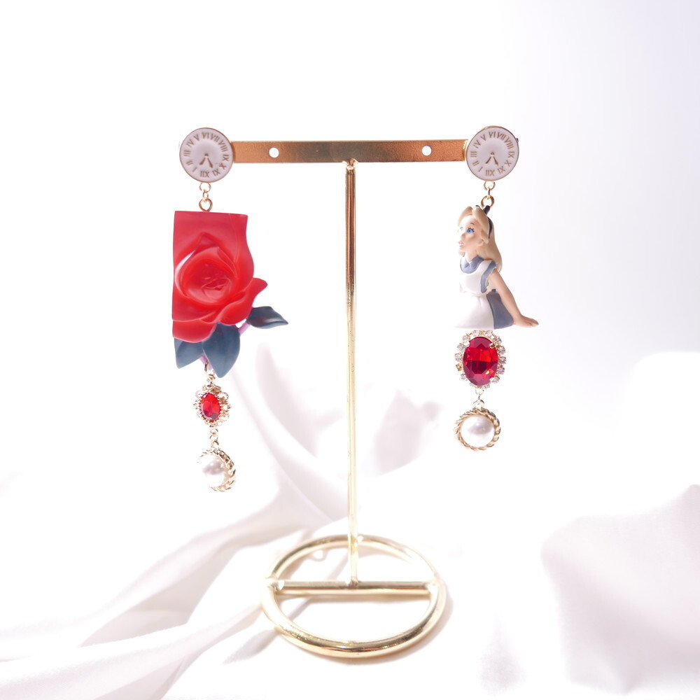 Inspired by the magical world of Alice in Wonderland, these Alice in the Rose Garden earrings recreate a storybook moment with a startled Alice figure and a deep red sculpted rose. Finished with antique-style clock studs, crimson jewels, and pearl dangles, this pair is a whimsical yet elegant statement piece. Made using rare vintage toys for ultra-limited production.