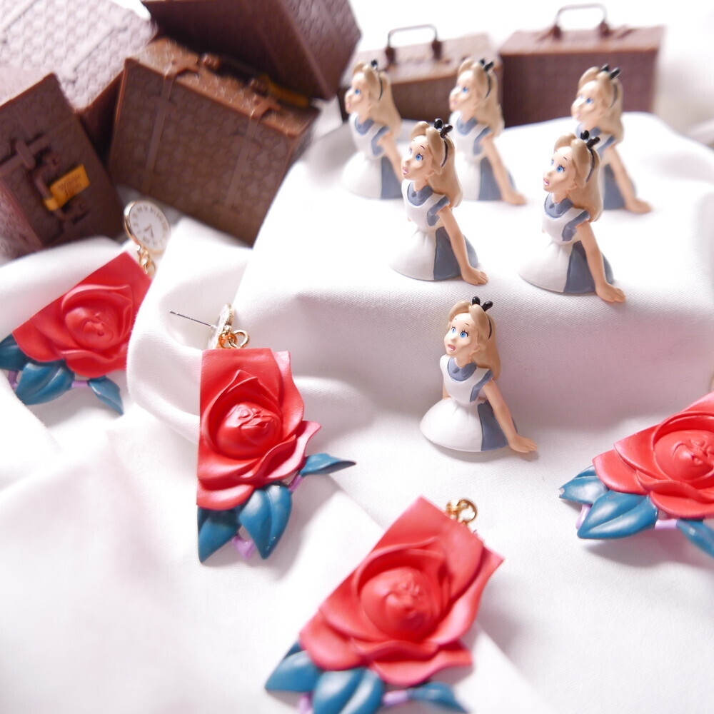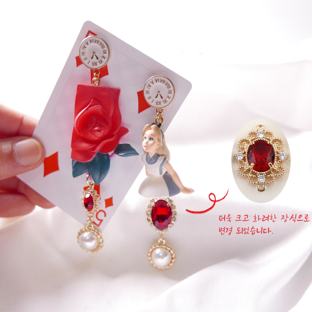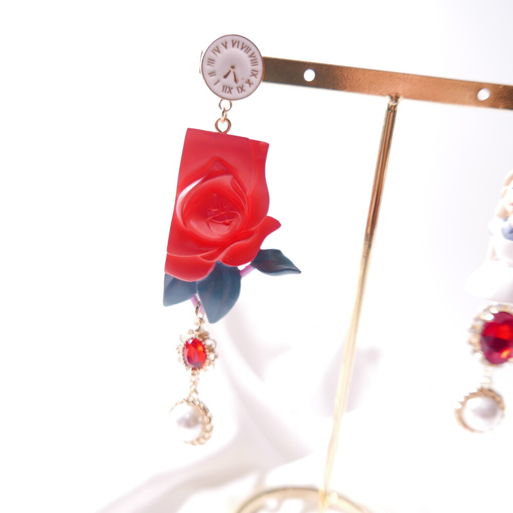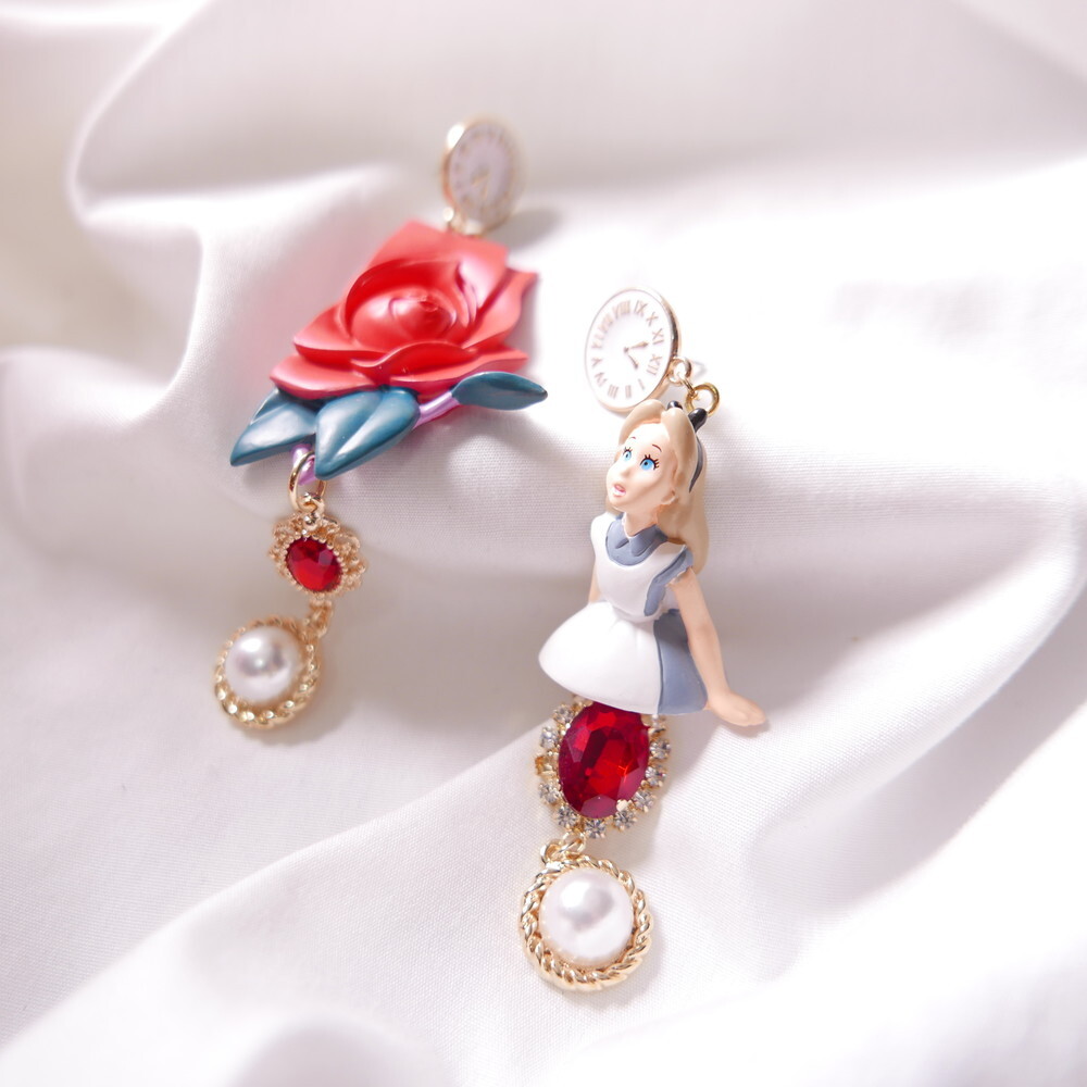 Inspired by the magical world of Alice in Wonderland, these Alice in the Rose Garden earrings recreate a storybook moment with a startled Alice figure and a deep red sculpted rose. Finished with antique-style clock studs, crimson jewels, and pearl dangles, this pair is a whimsical yet elegant statement piece. Made using rare vintage toys for ultra-limited production.