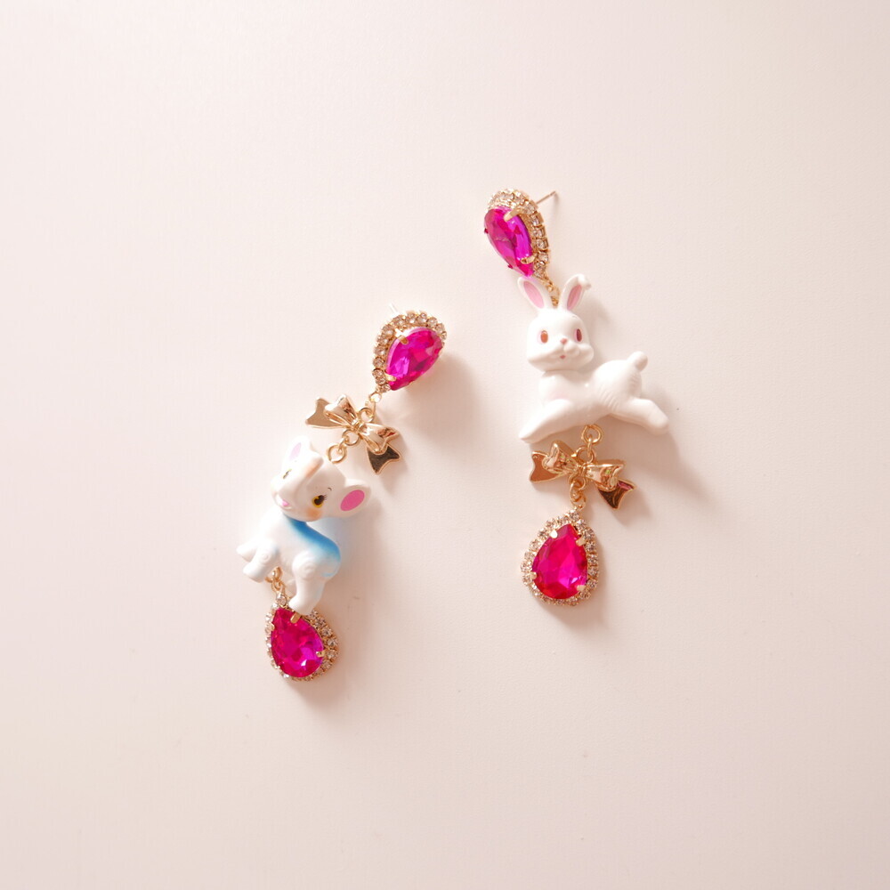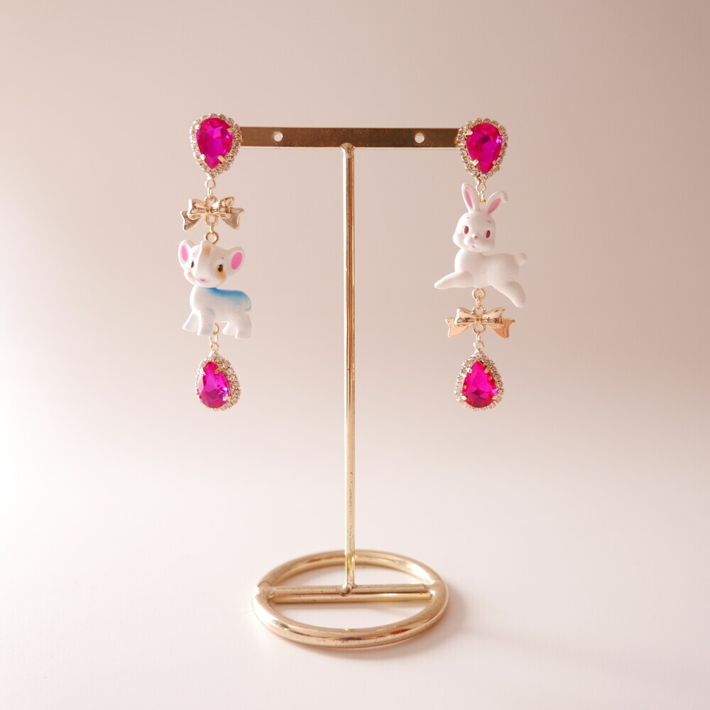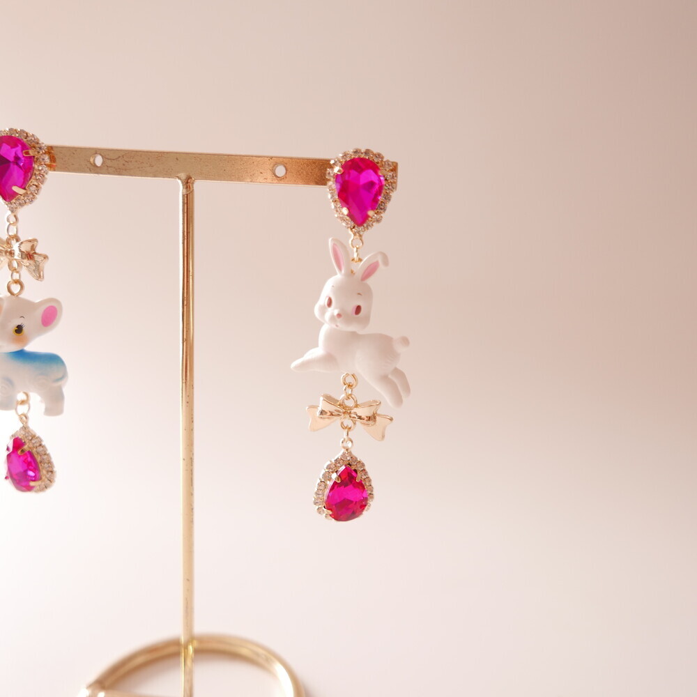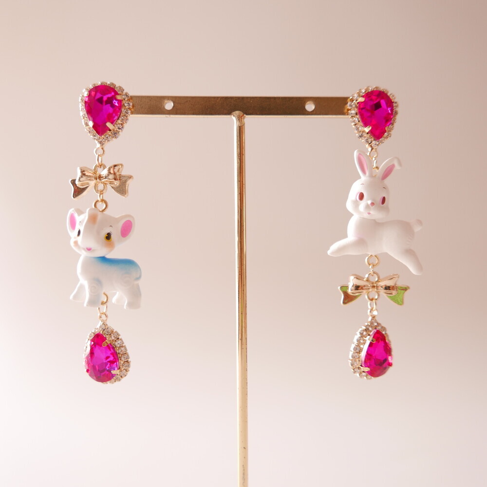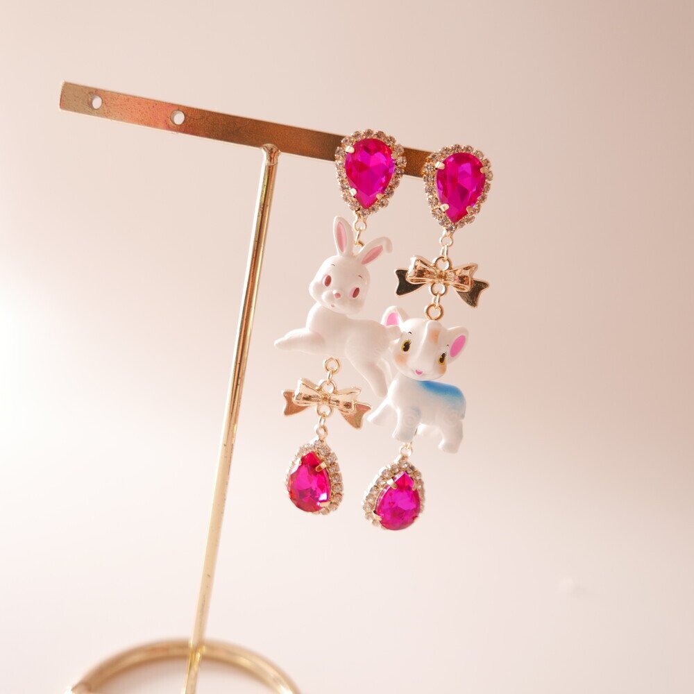 These charming Cocory & Toto earrings feature a playful bunny and puppy duo, paired with sparkly teardrop crystals and mini gold bows for extra sweetness. The vibrant pink tones and whimsical characters make this pair a statement piece for lovers of dreamy, fairytale fashion. Made with hypoallergenic silver 92.5% posts, these are perfect for sensitive ears too!