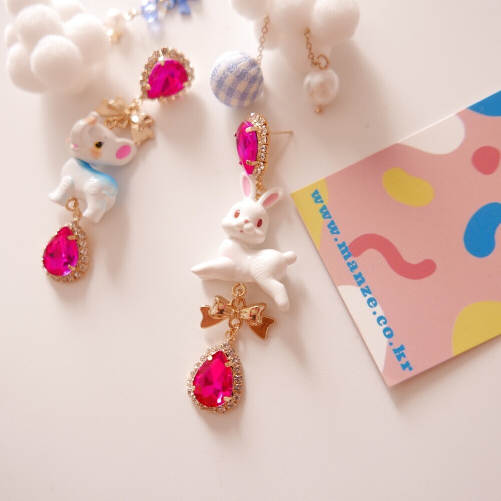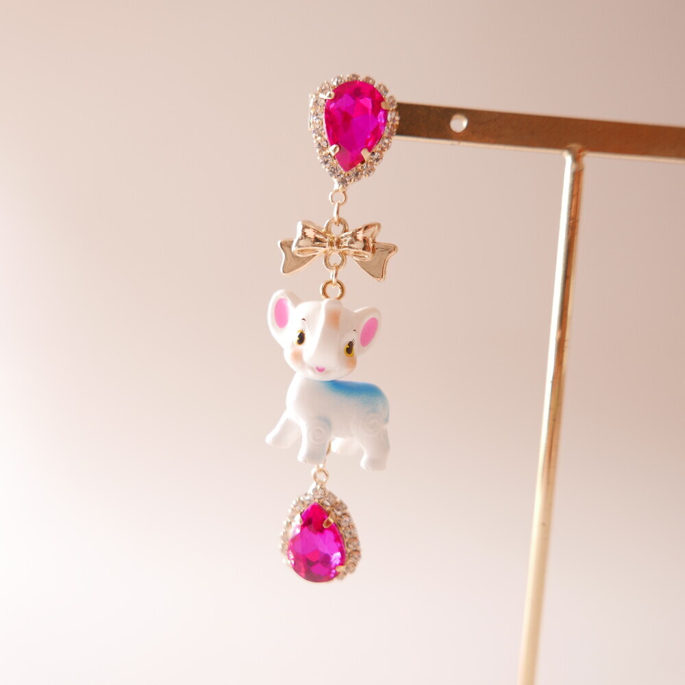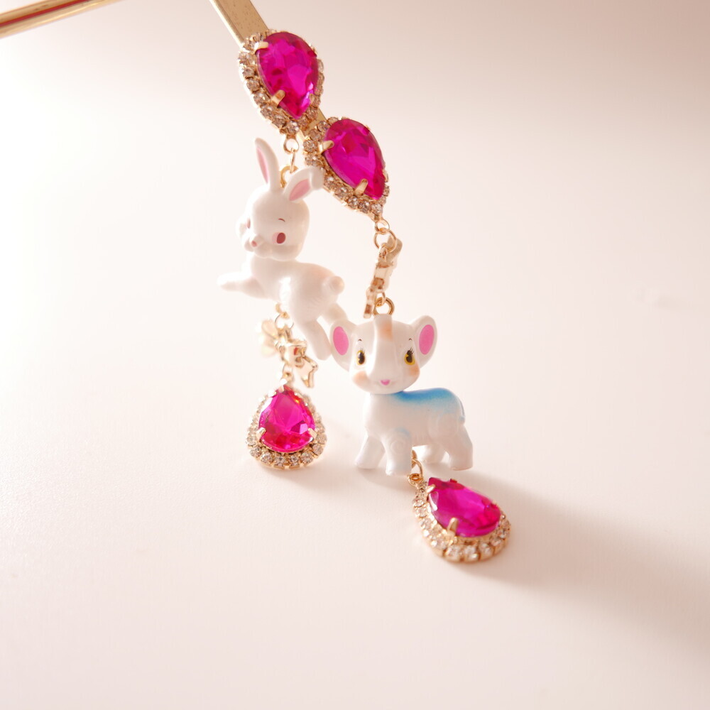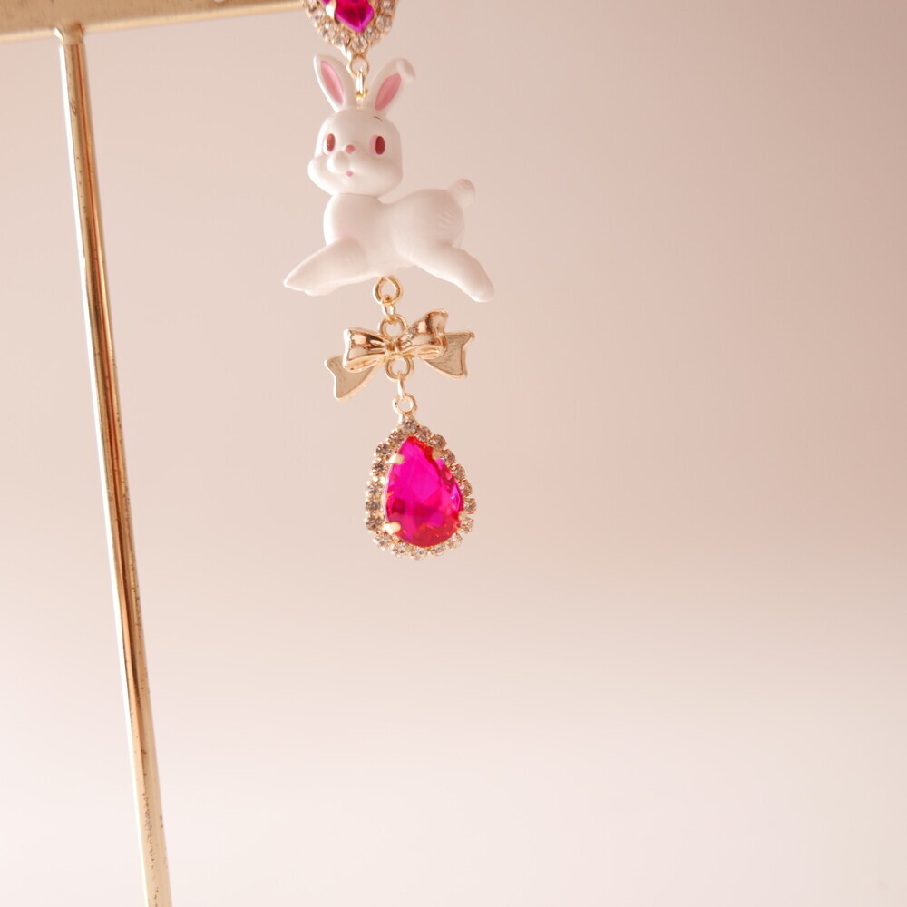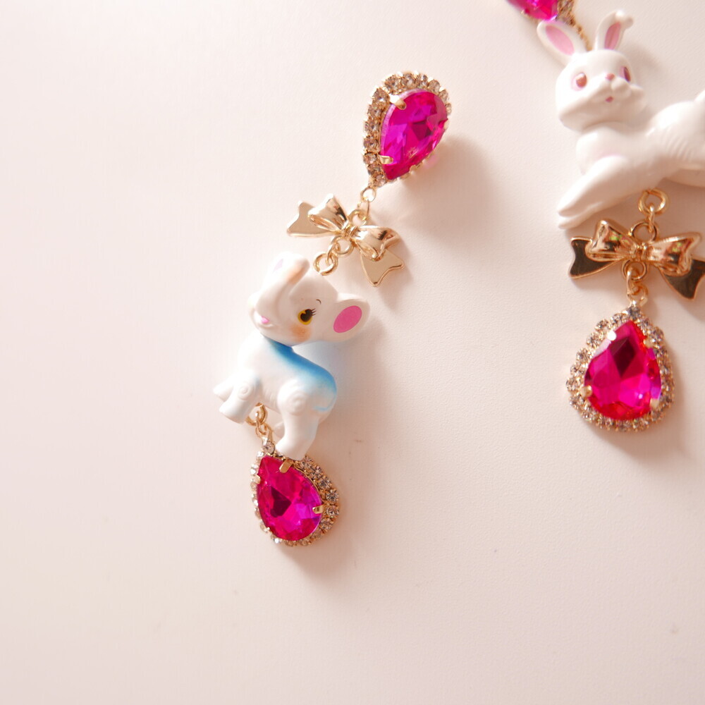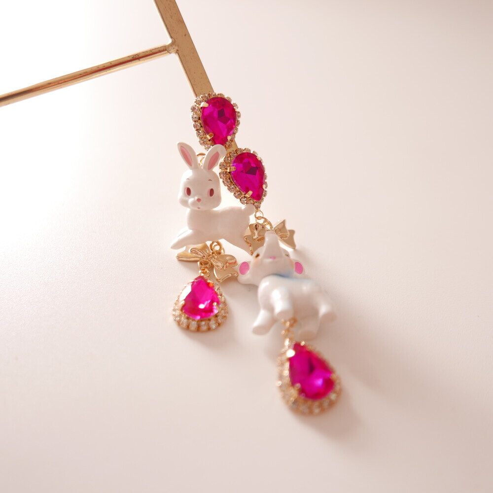 These charming Cocory & Toto earrings feature a playful bunny and puppy duo, paired with sparkly teardrop crystals and mini gold bows for extra sweetness. The vibrant pink tones and whimsical characters make this pair a statement piece for lovers of dreamy, fairytale fashion. Made with hypoallergenic silver 92.5% posts, these are perfect for sensitive ears too!