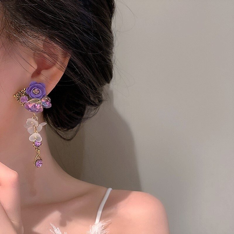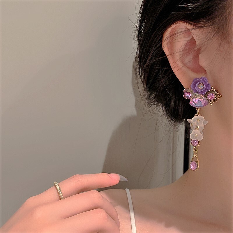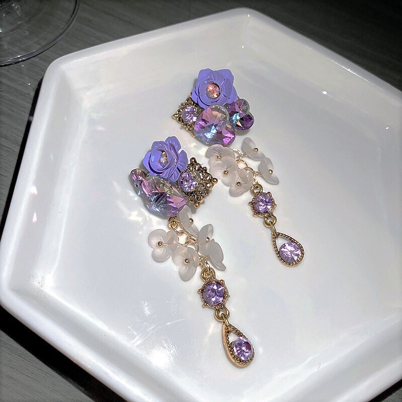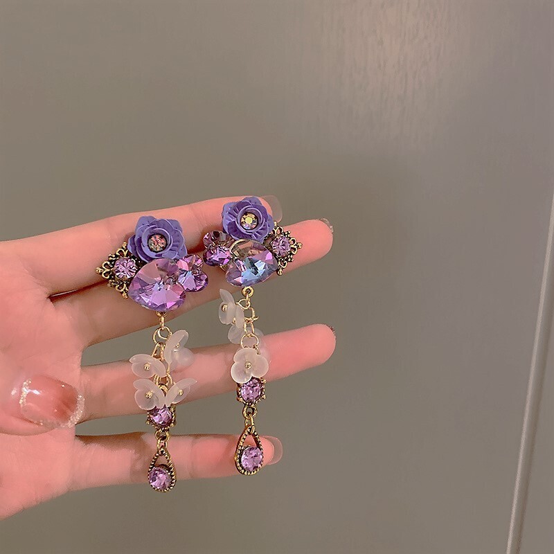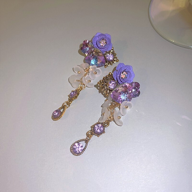 Step into a world of romantic elegance with our Antique Violet Earrings. These beautifully detailed earrings feature intricate violet-toned florals, white flower clusters, and sparkling crystal drops, all set in a vintage gold-tone setting. The 7.5cm length adds graceful movement, while the 92.5% silver posts provide comfort for sensitive ears.