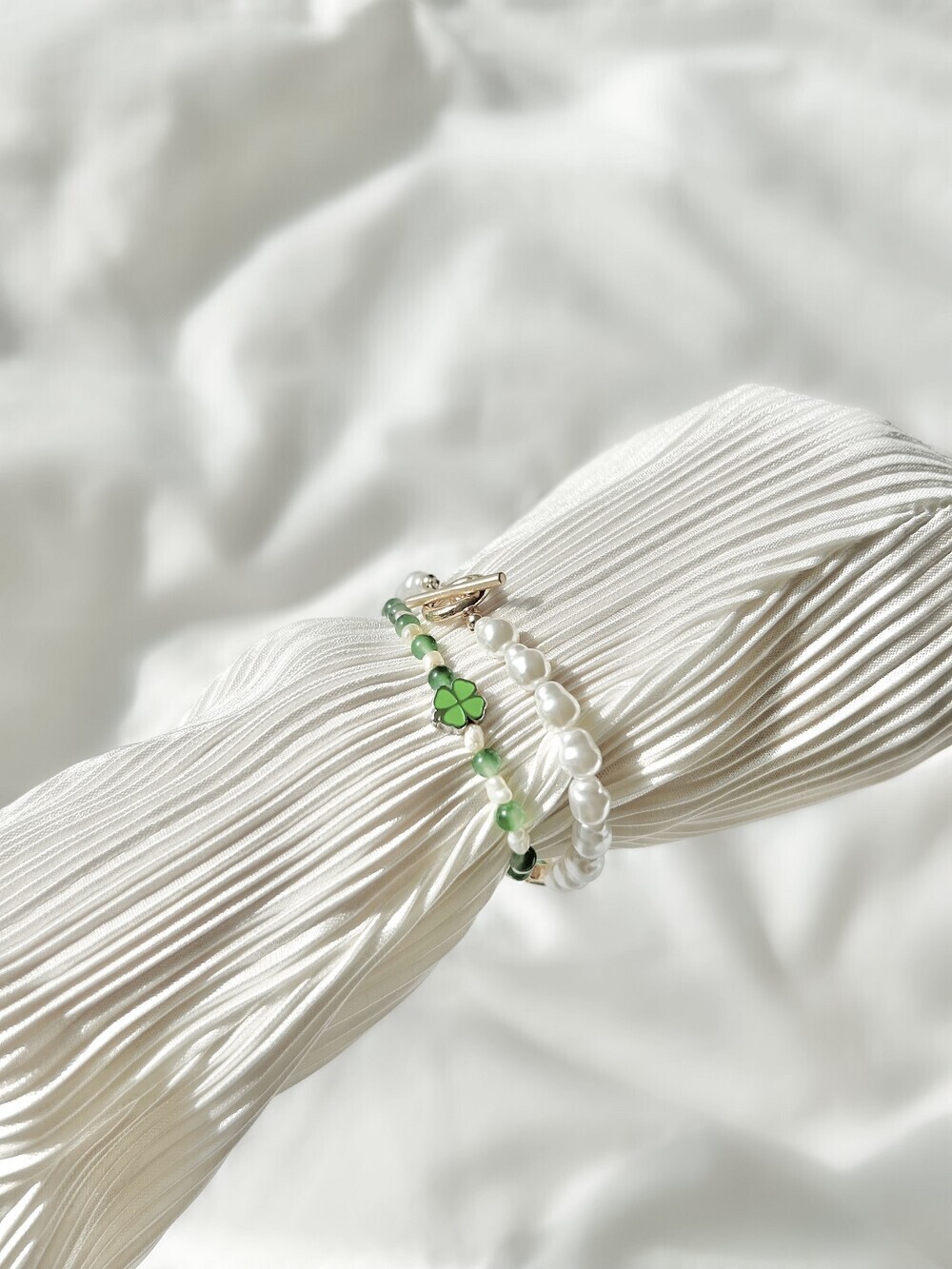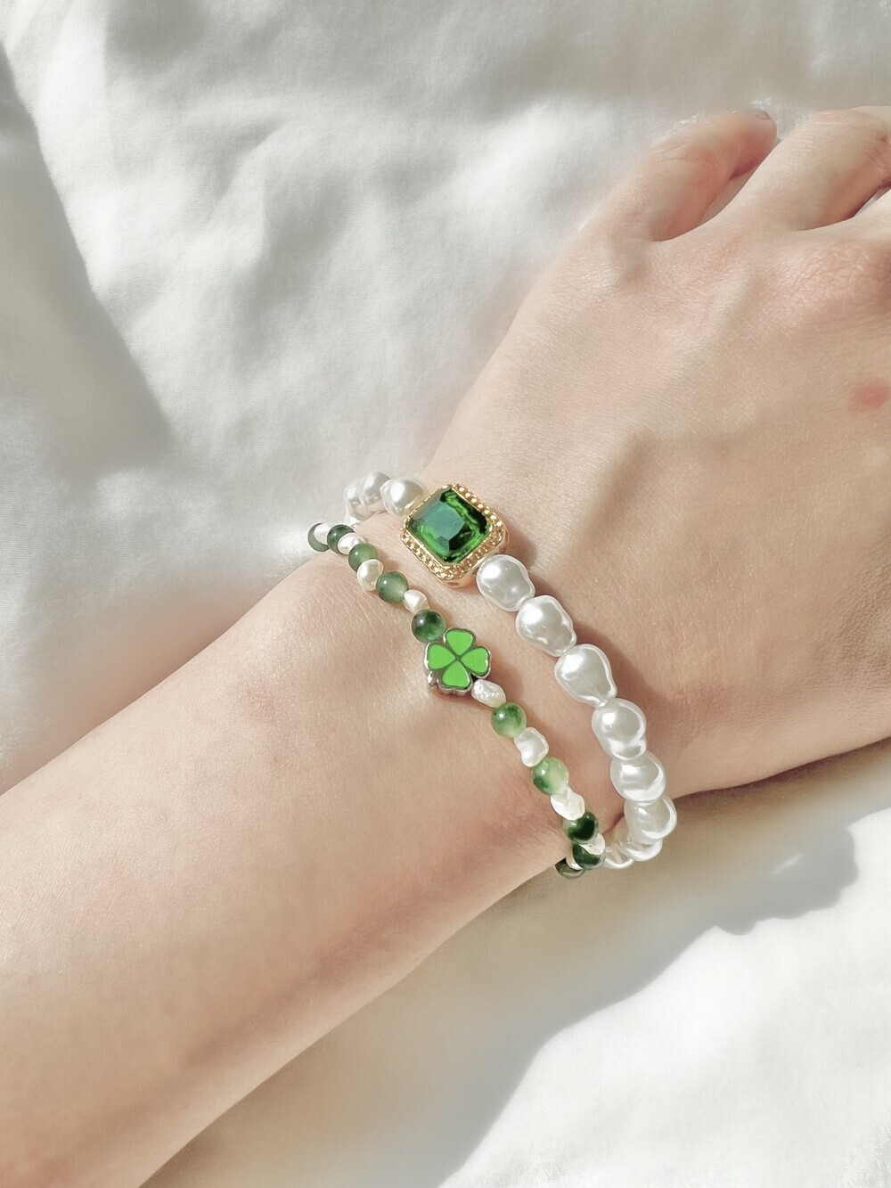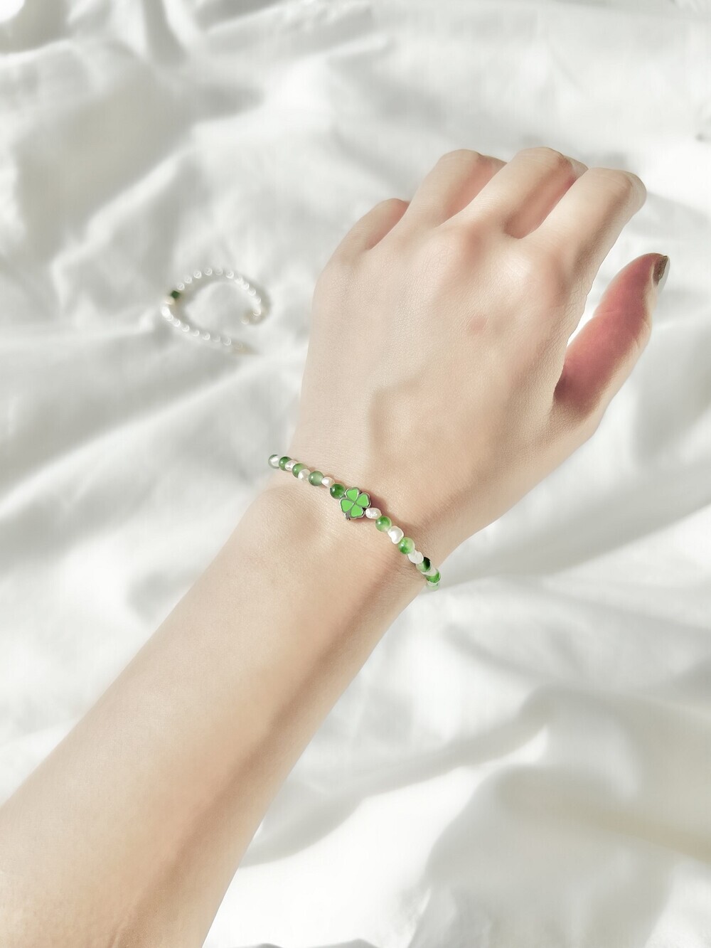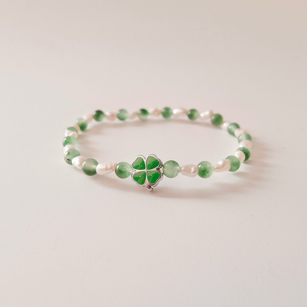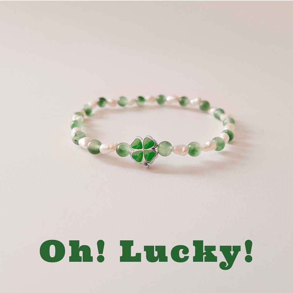 The Oh! Lucky! Bracelet combines luminous freshwater pearls with soft natural jade beads in a soothing palette. At the center sits a four-leaf clover for a charming, lucky finish. Comfortable and elastic, this piece is easy to wear and comes in multiple sizes. Ideal for stacking or wearing on its own for a subtle pop of color.