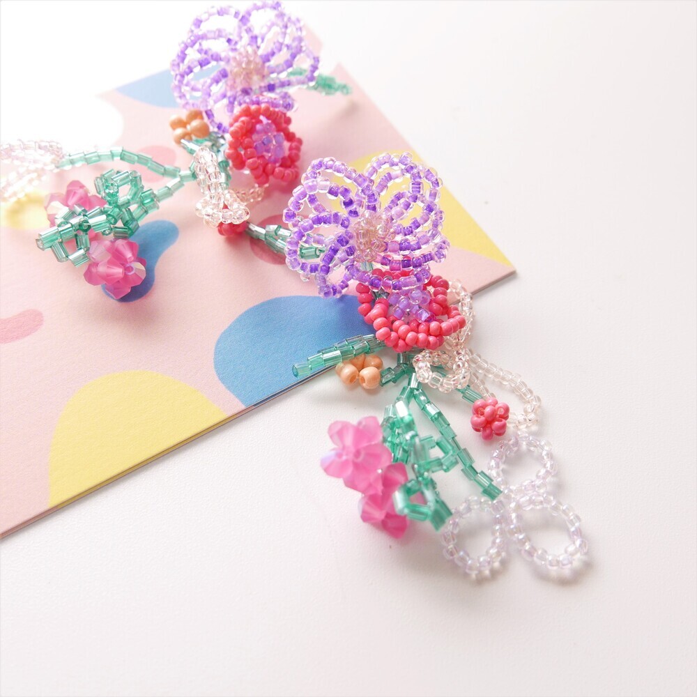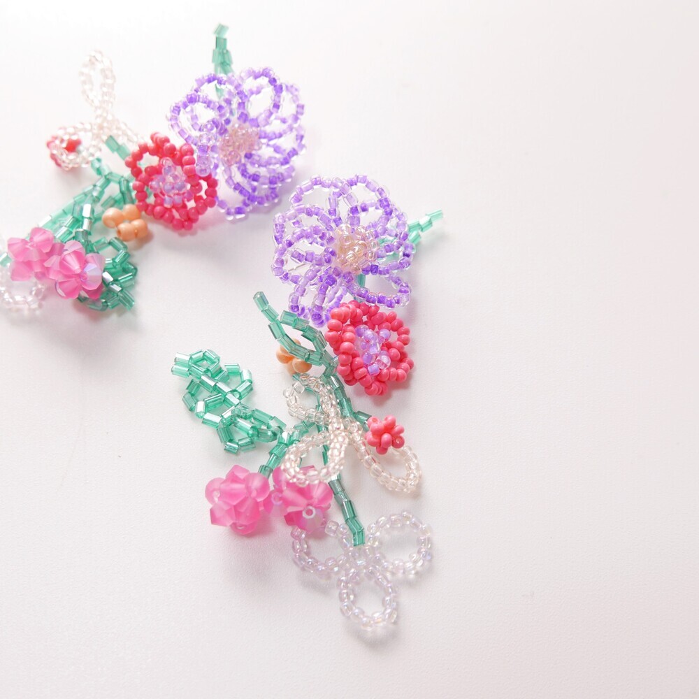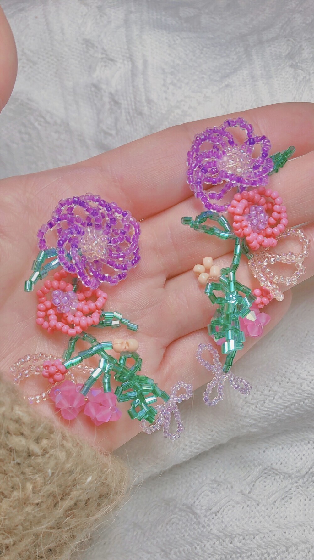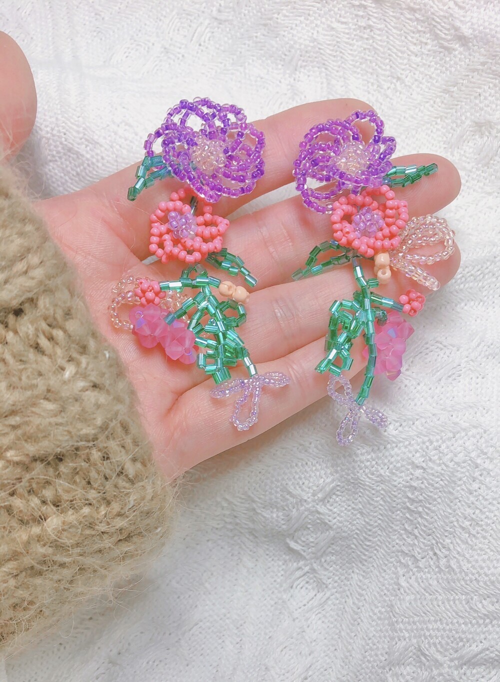 A vibrant celebration of spring in full bloom. These floral earrings are delicately handcrafted using neon-colored seed beads and crystal-like elements. Featuring violet, coral, and blush blossoms with glistening green stems, each earring is a miniature garden. Light, colorful, and eye-catching — ideal for artistic, playful styles. Made with silver 92.5% posts.