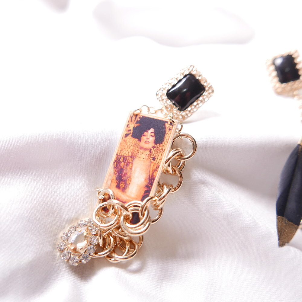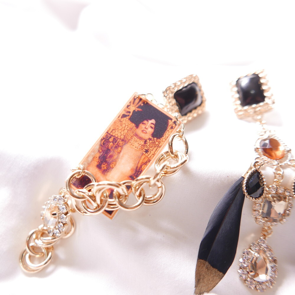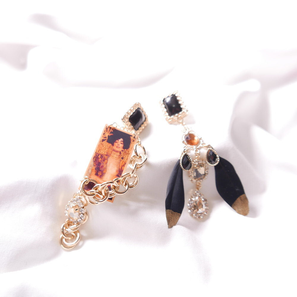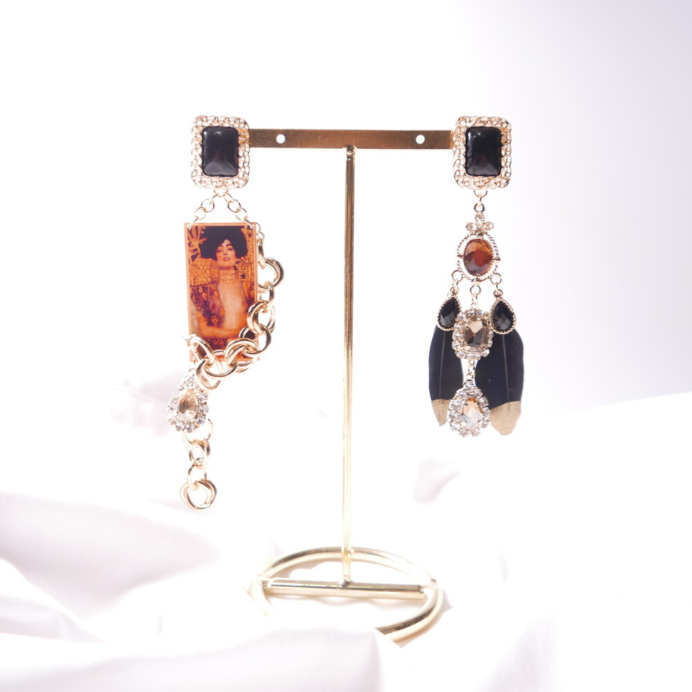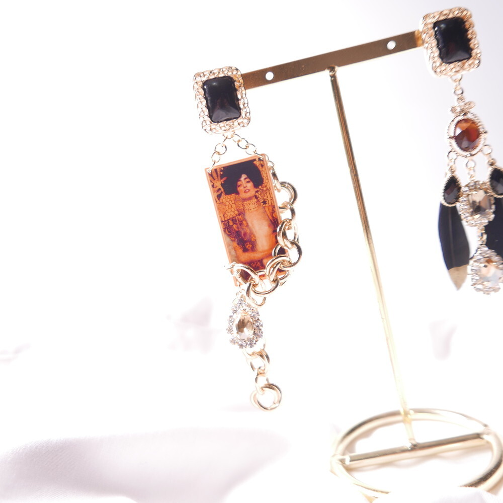 Inspired by the masterpiece Judith I by Gustav Klimt, these earrings celebrate one of the most iconic and seductive figures in art history. Bold, luxurious, and intricately mismatched, each earring is a small work of art—featuring a printed panel of the painting and jewel-embellished feather accents.