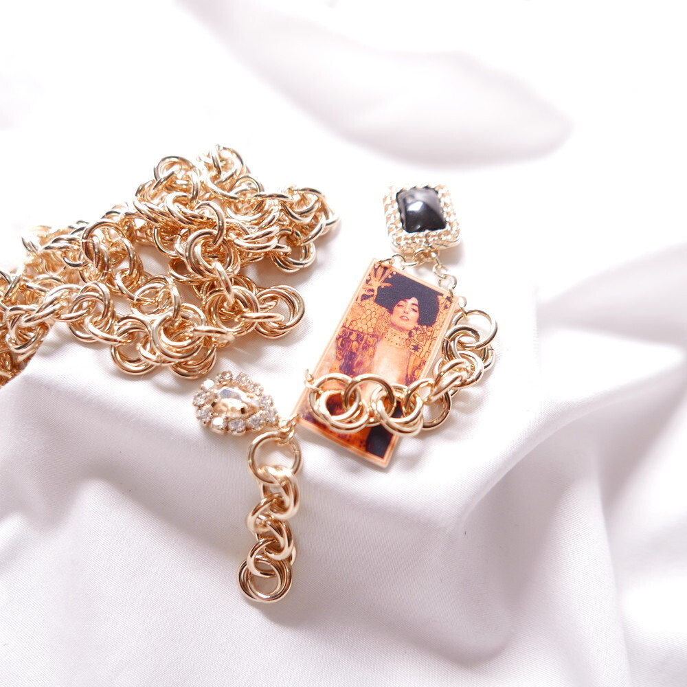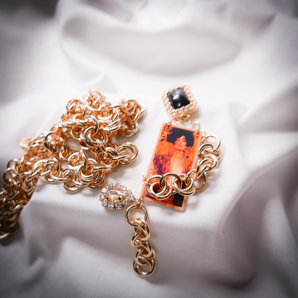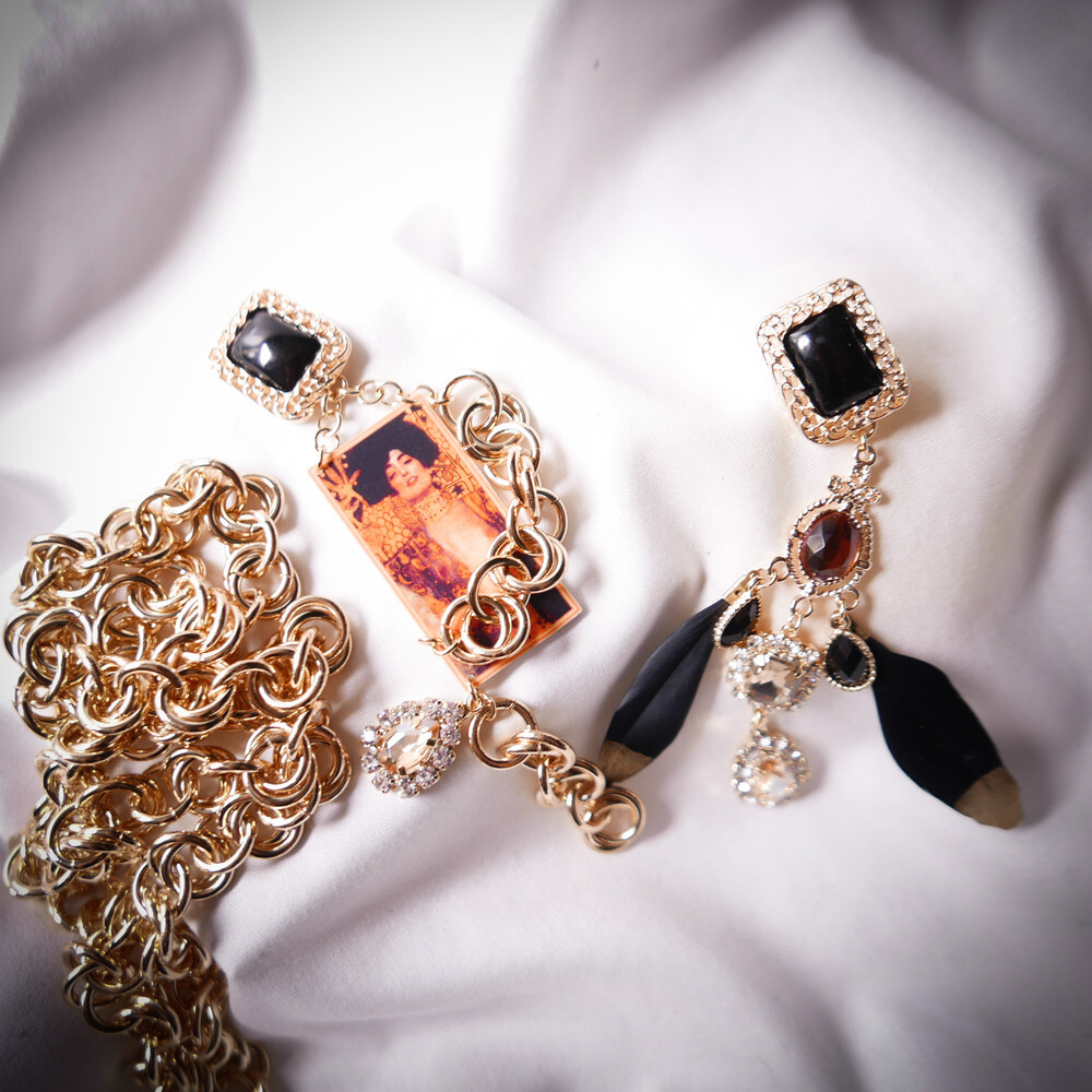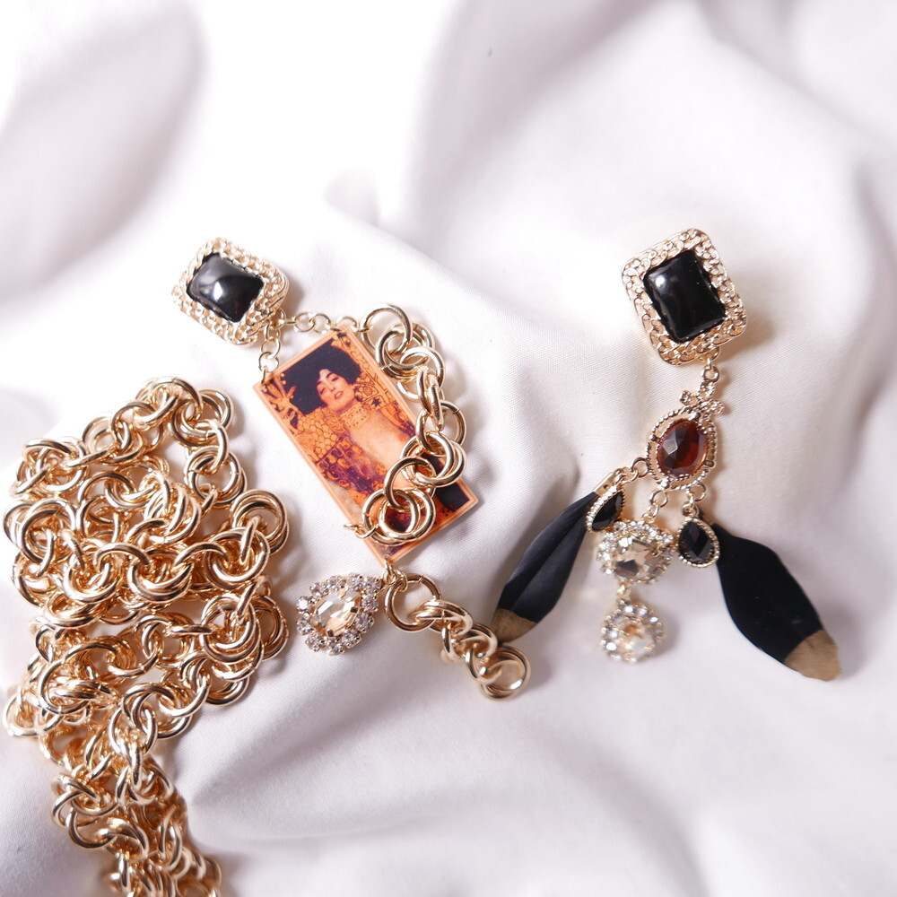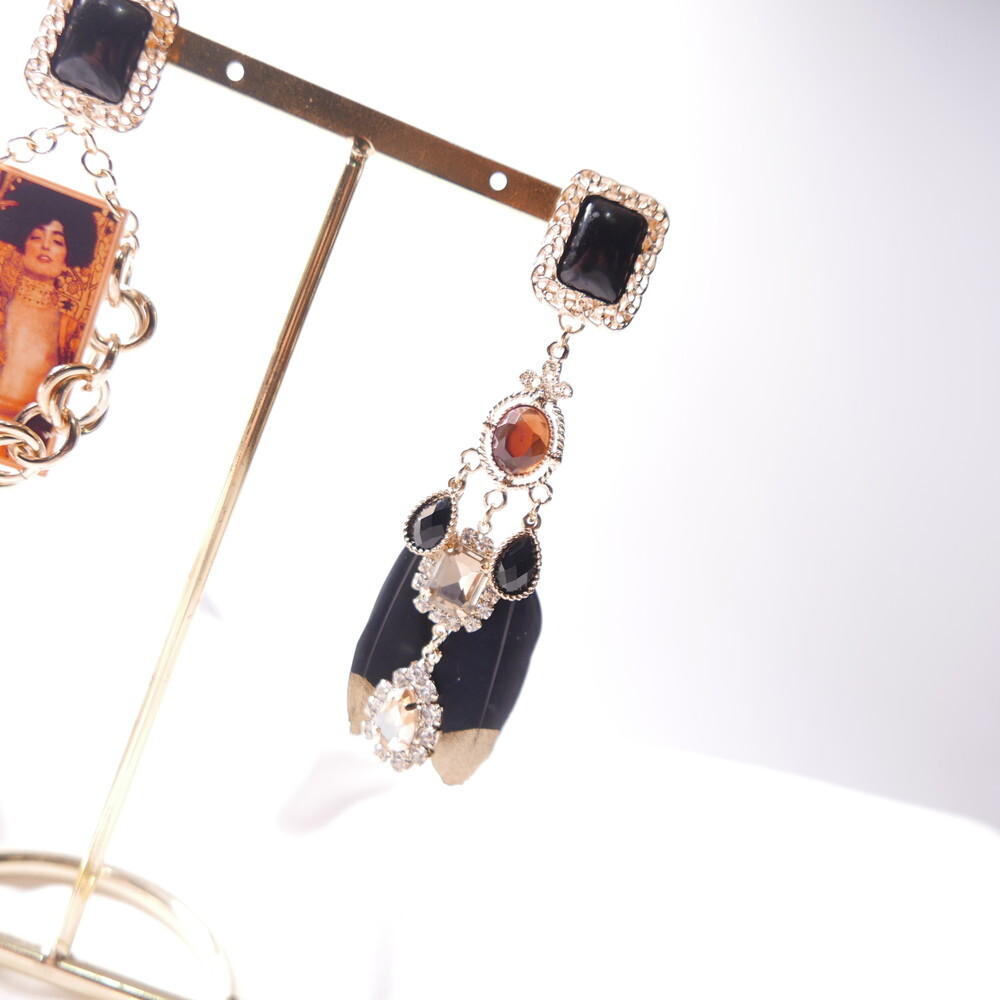 Inspired by the masterpiece Judith I by Gustav Klimt, these earrings celebrate one of the most iconic and seductive figures in art history. Bold, luxurious, and intricately mismatched, each earring is a small work of art—featuring a printed panel of the painting and jewel-embellished feather accents.