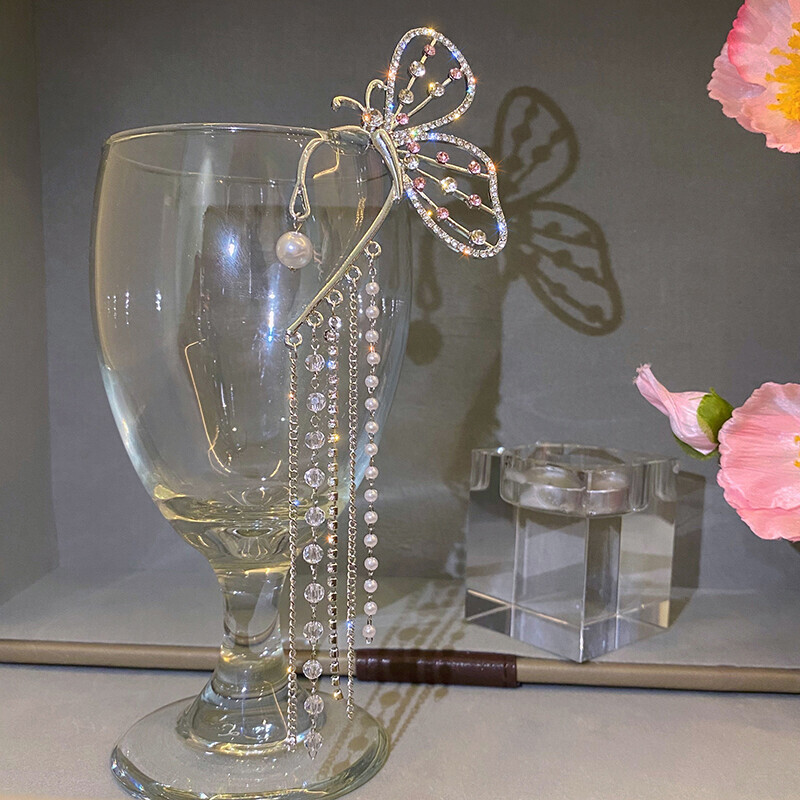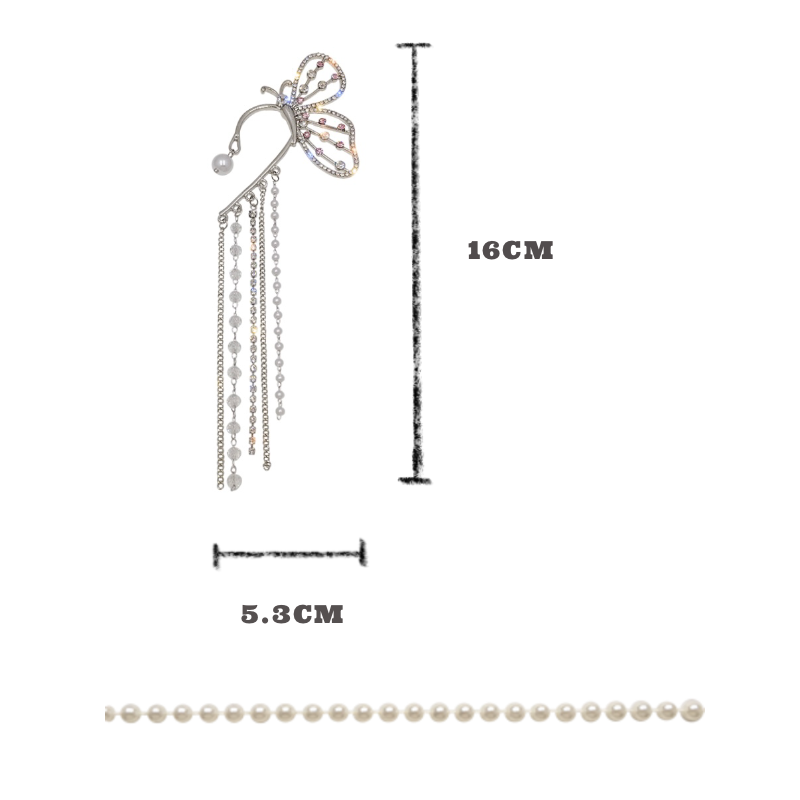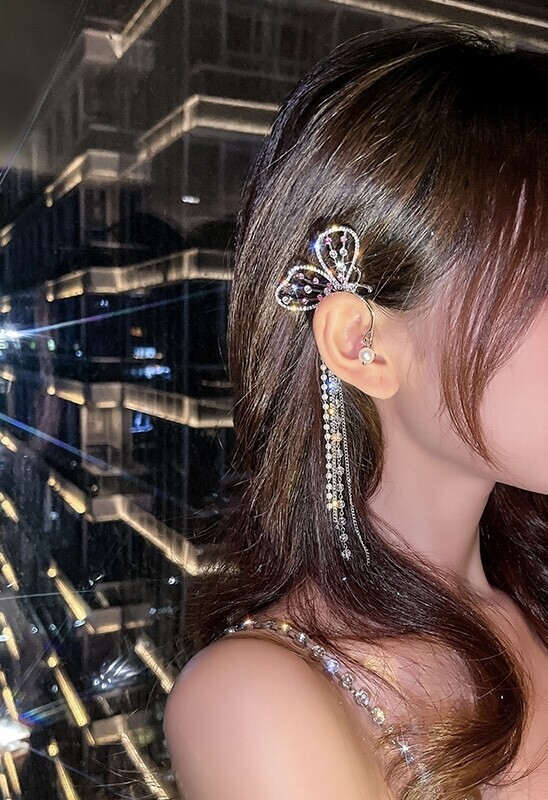 Add a touch of graceful drama with this butterfly-shaped ear cuff designed for a single ear. The shimmering rhinestone wings and cascading chains move with you, catching the light at every turn. This ear cuff hugs the outer ear (no piercing required) and can be gently adjusted for a custom fit. Choose your preferred side: right or left.