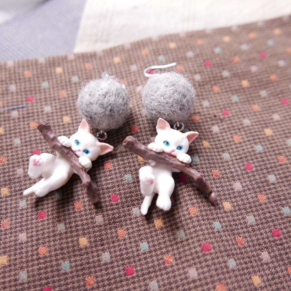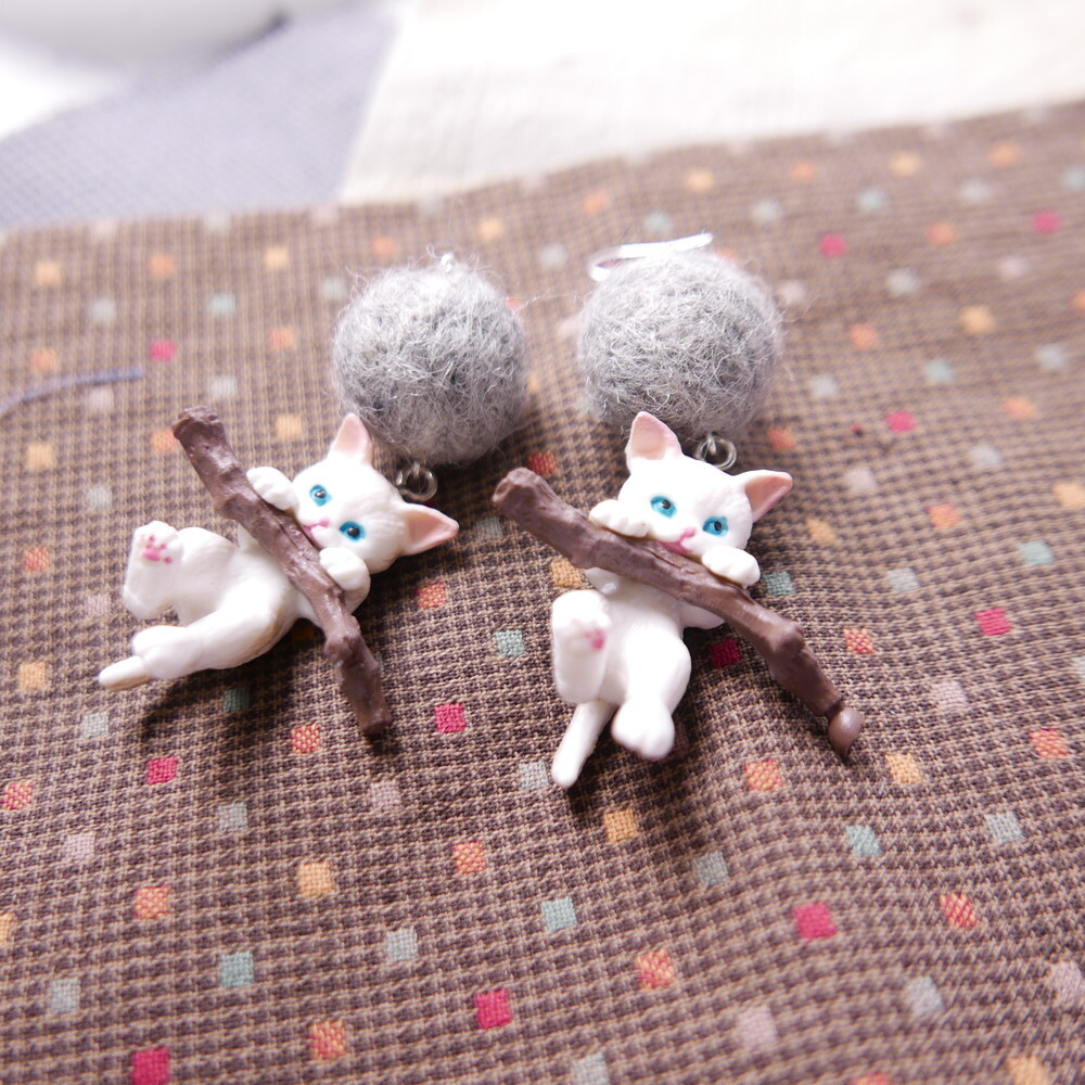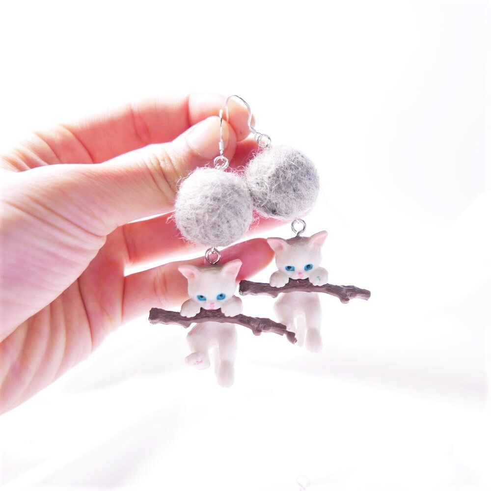 These adorable earrings feature baby kittens with blue eyes hanging from a tree branch, paired with soft wool felt balls. Lightweight and playful, they’re perfect for anyone who loves unique animal-themed accessories with a gentle, handmade touch.