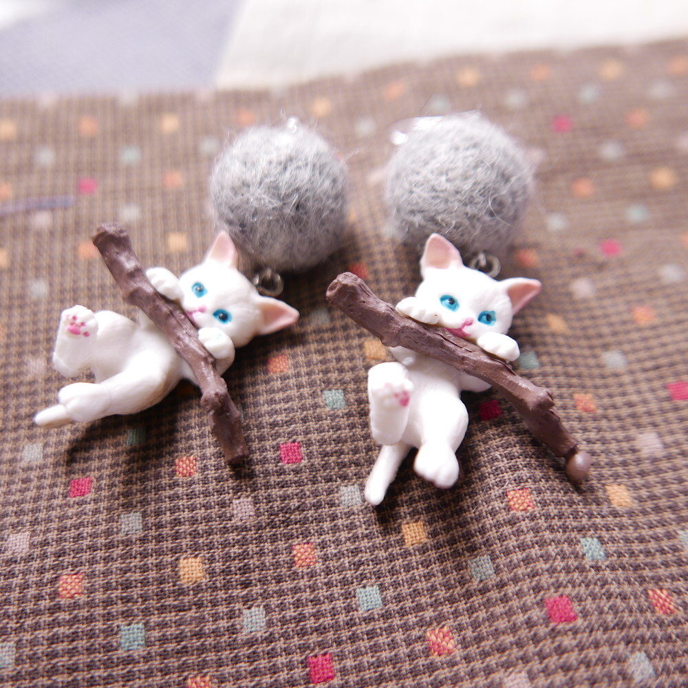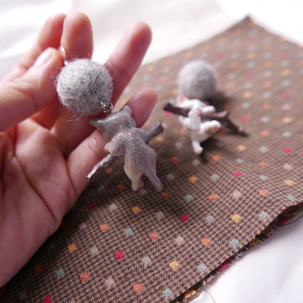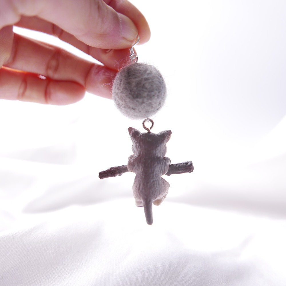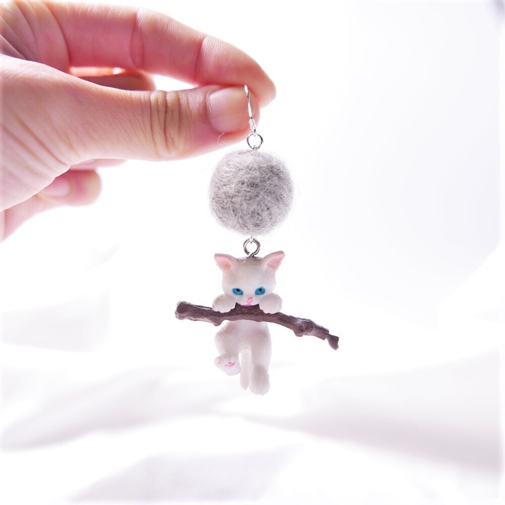 These adorable earrings feature baby kittens with blue eyes hanging from a tree branch, paired with soft wool felt balls. Lightweight and playful, they’re perfect for anyone who loves unique animal-themed accessories with a gentle, handmade touch.