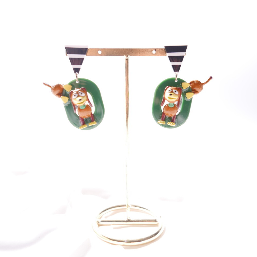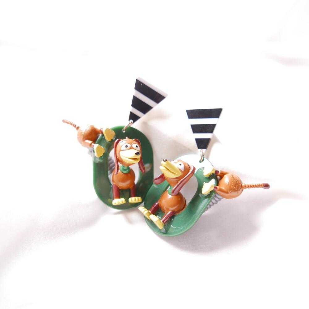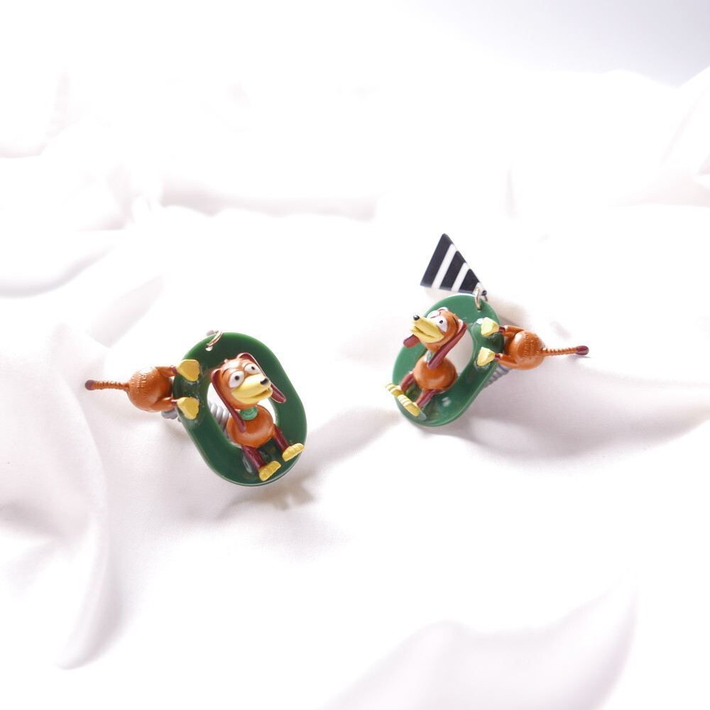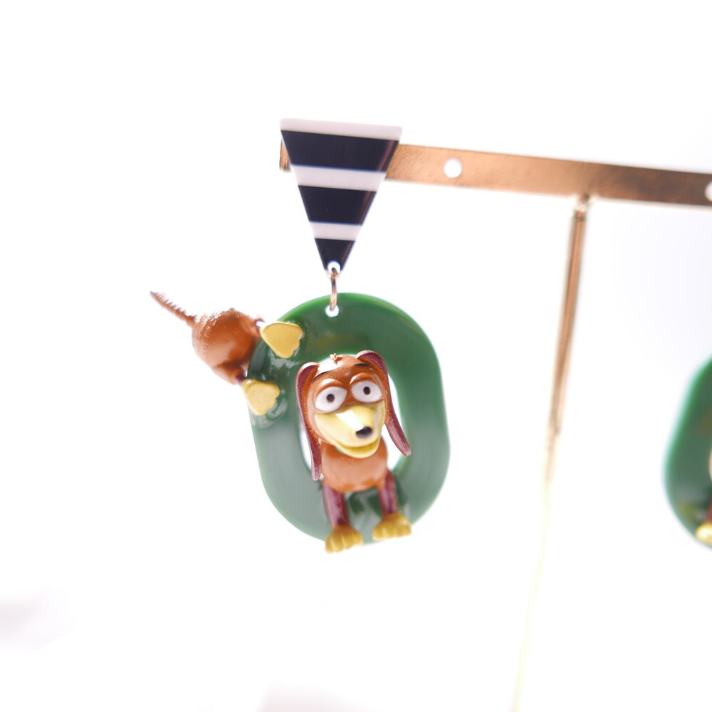 Say hello to the springy, cheerful pup from Toy Story! These earrings feature Slinky Dog with his adorable stretched body, dangling from a bold green frame and finished with a playful striped triangle stud. A quirky blend of black, khaki, and brown tones, this piece captures the fun spirit of animation with a wearable twist!