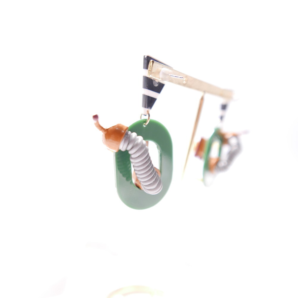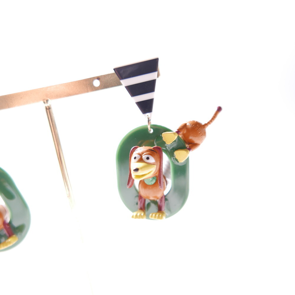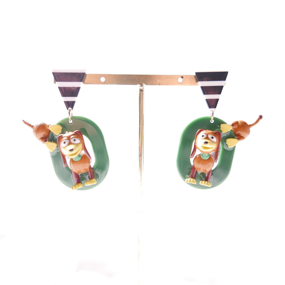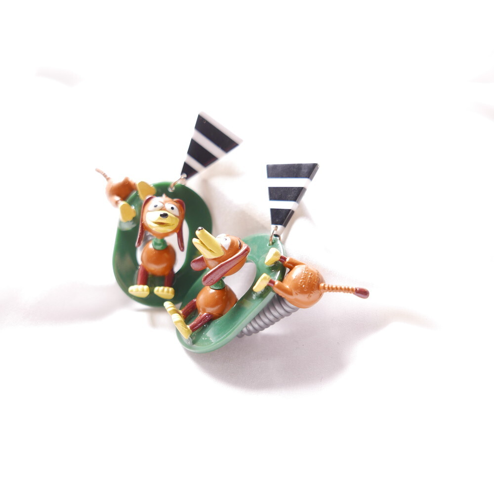 Say hello to the springy, cheerful pup from Toy Story! These earrings feature Slinky Dog with his adorable stretched body, dangling from a bold green frame and finished with a playful striped triangle stud. A quirky blend of black, khaki, and brown tones, this piece captures the fun spirit of animation with a wearable twist!