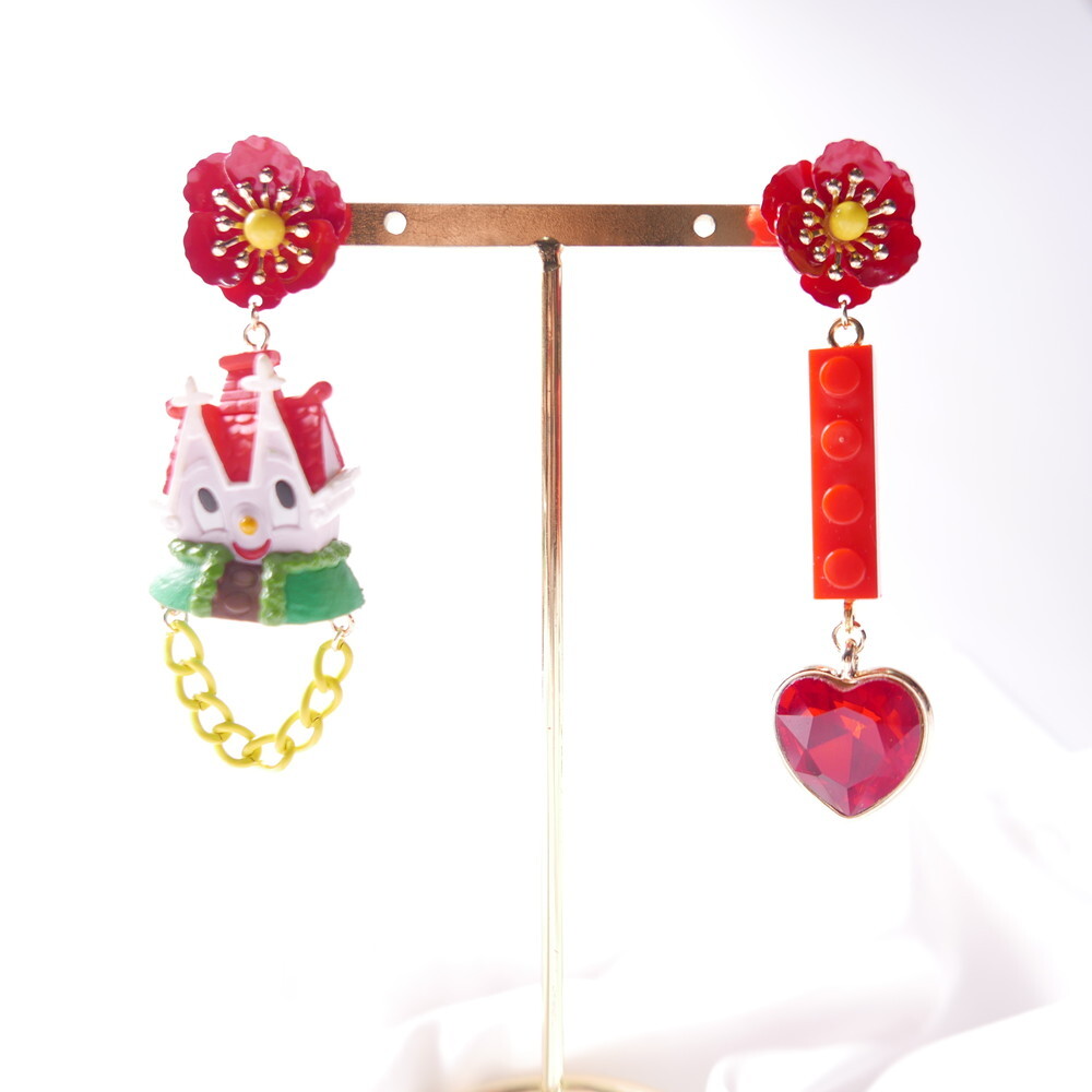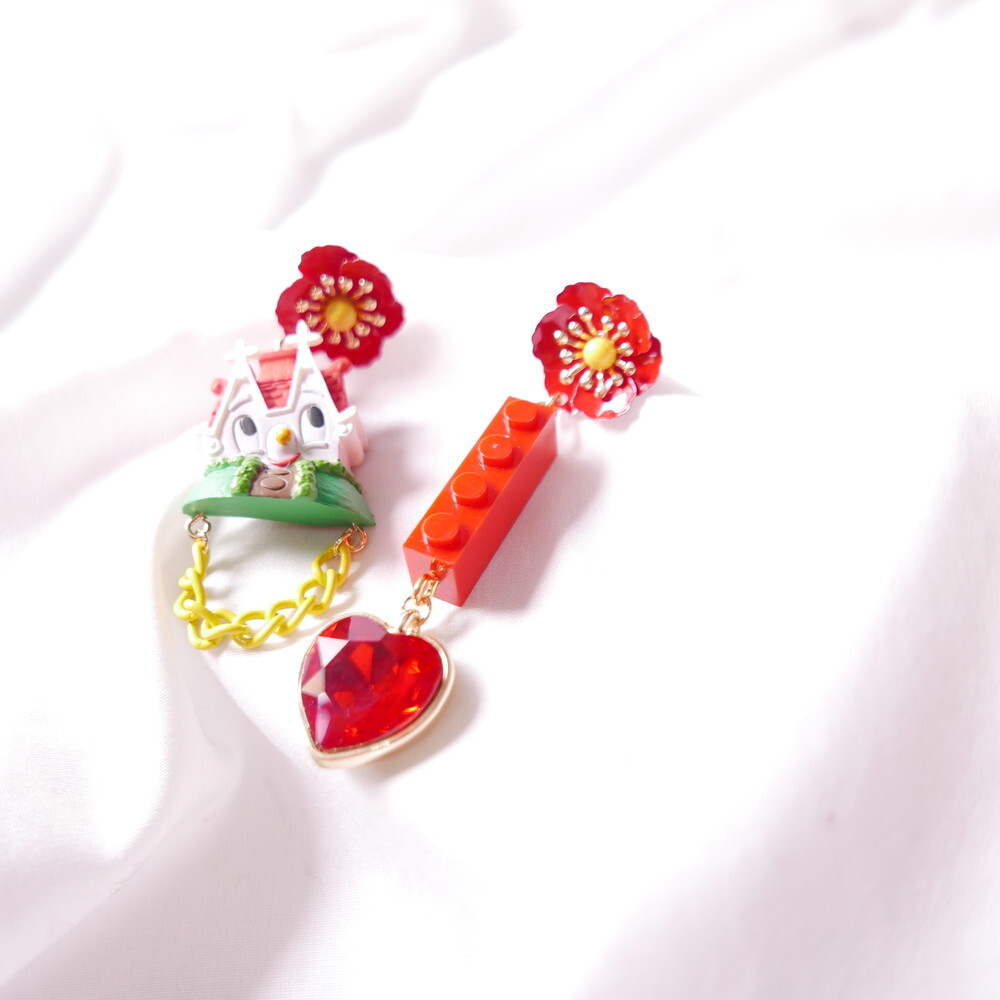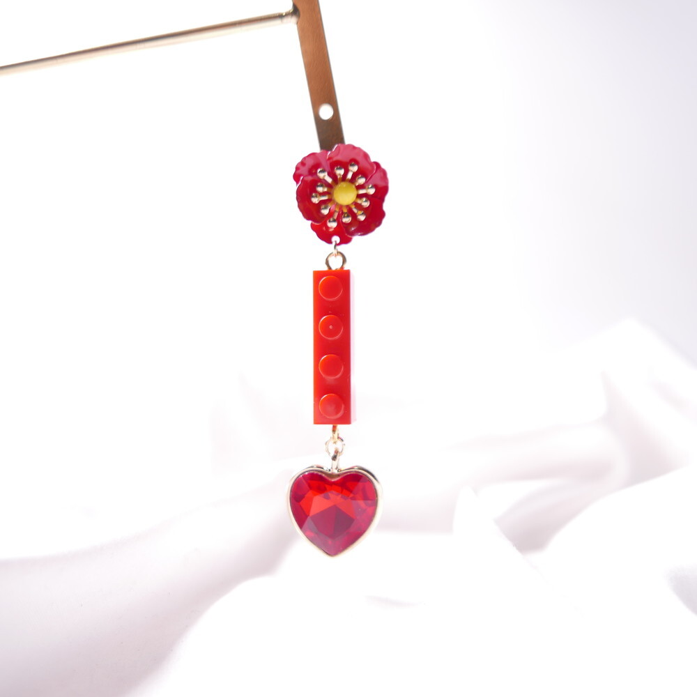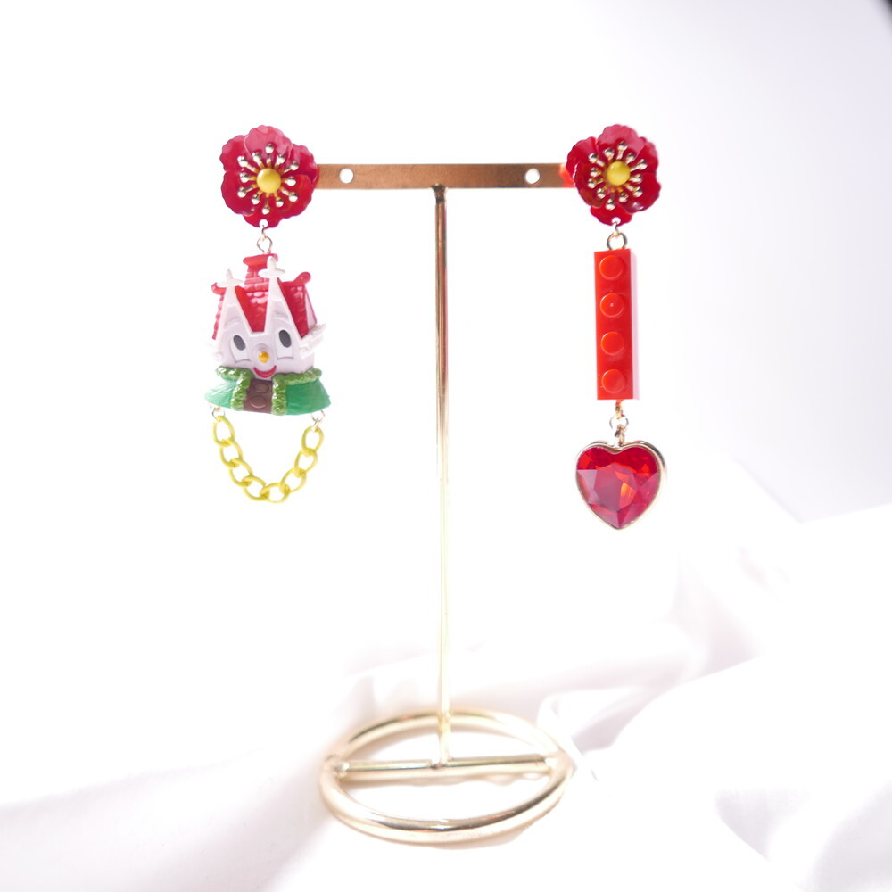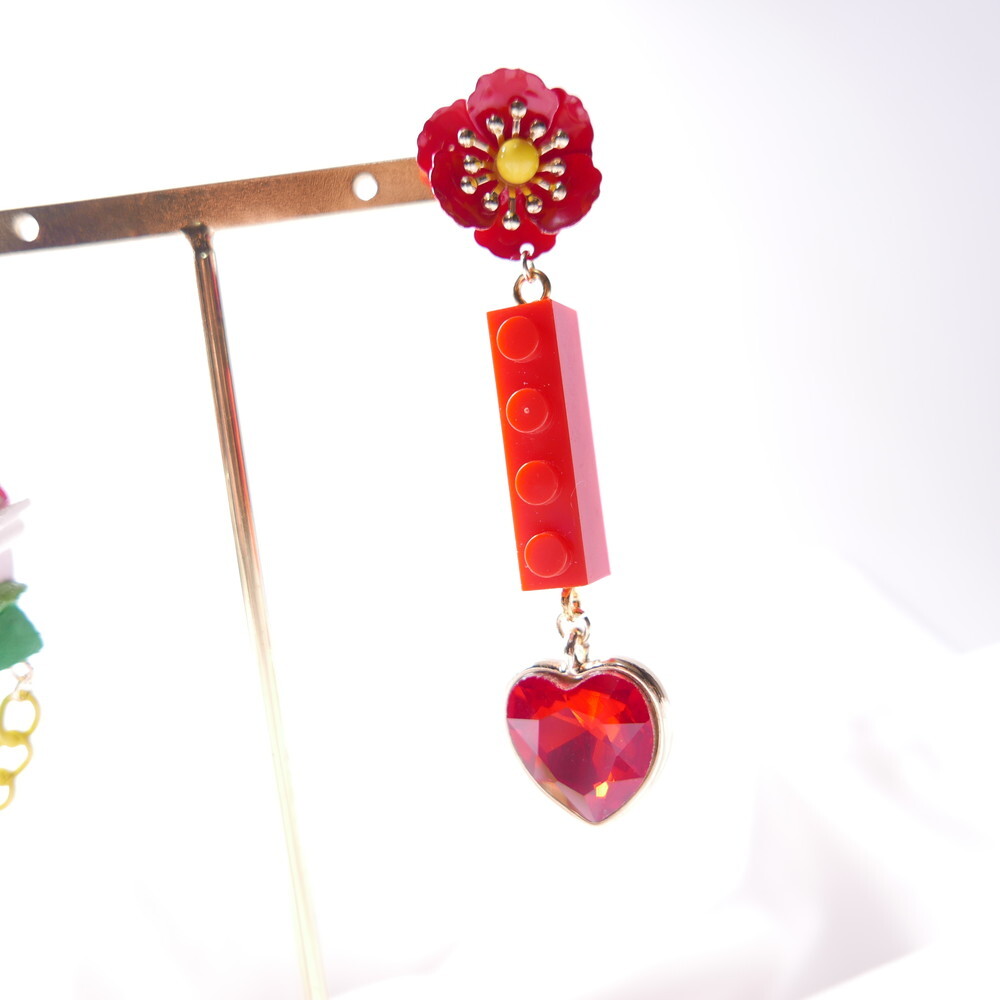 Featuring an unopened limited-edition vintage toy, mismatched styling with a bold red brick charm and heart gem, and vibrant flower studs, this piece is a collector’s dream with a nostalgic twist.