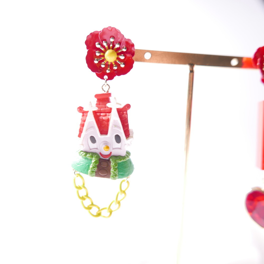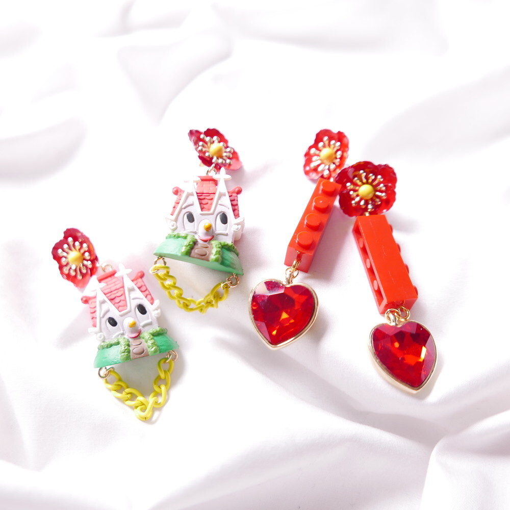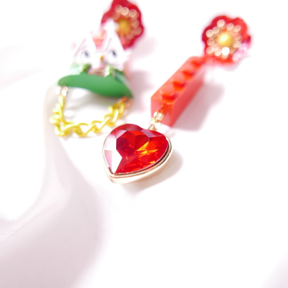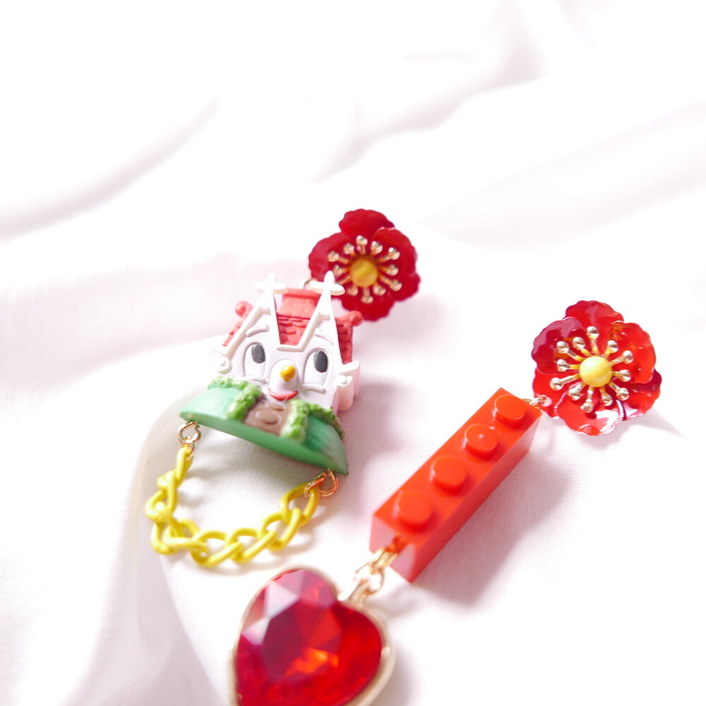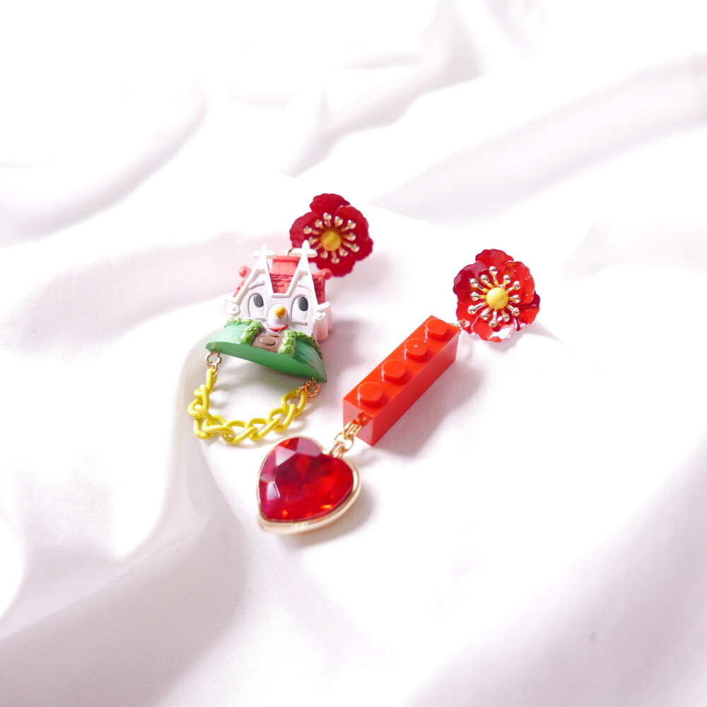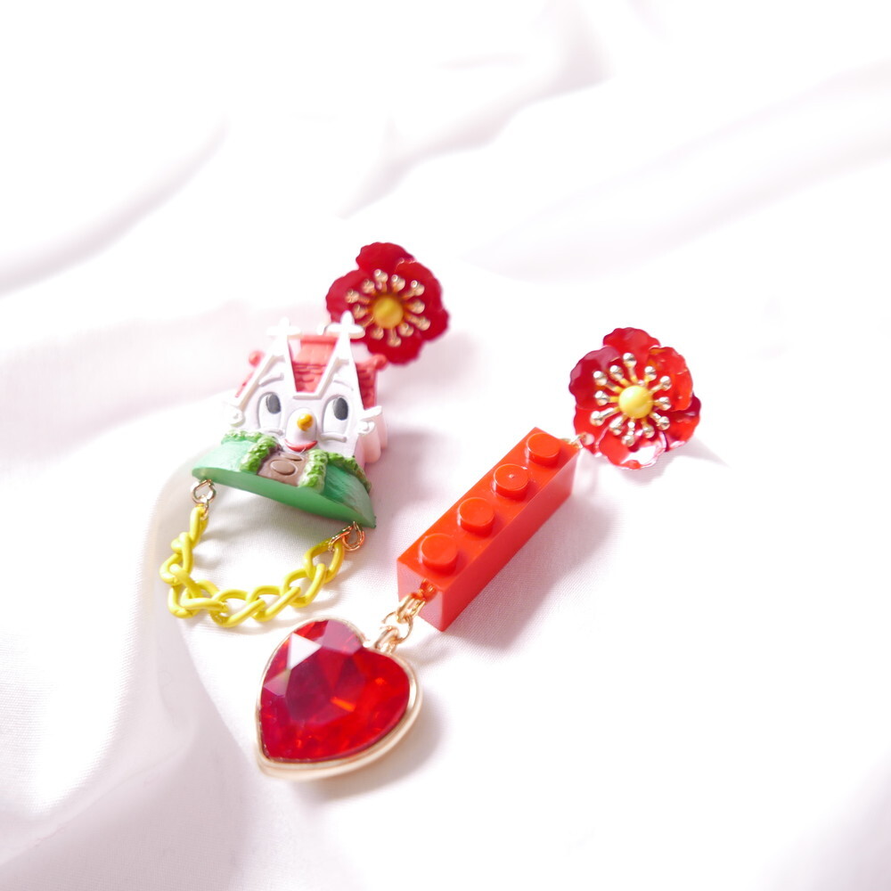 Featuring an unopened limited-edition vintage toy, mismatched styling with a bold red brick charm and heart gem, and vibrant flower studs, this piece is a collector’s dream with a nostalgic twist.