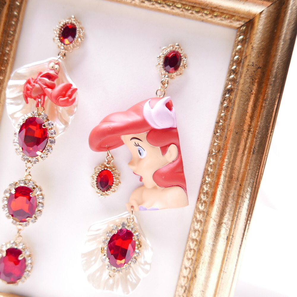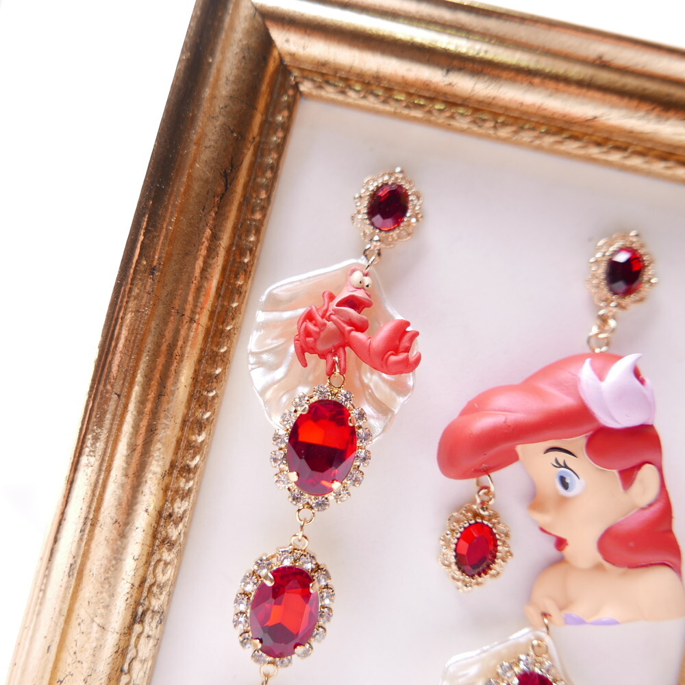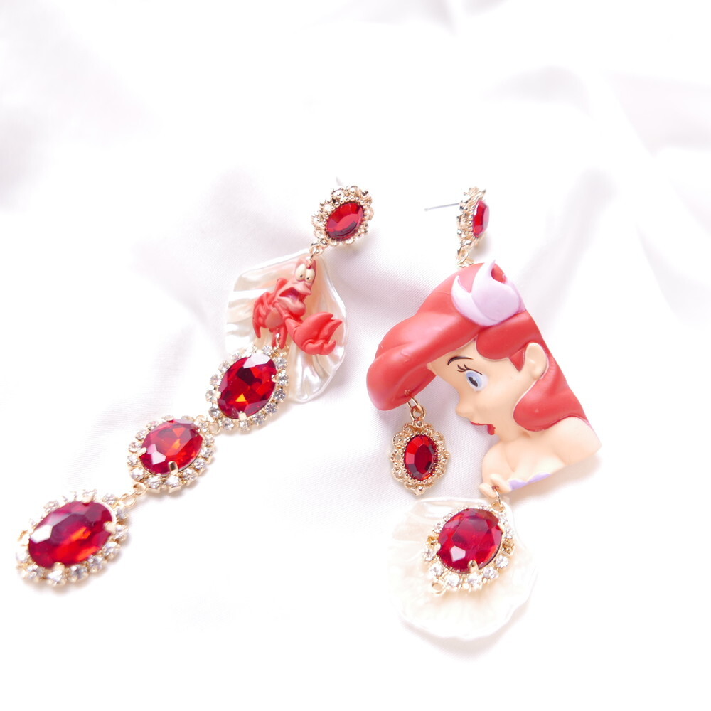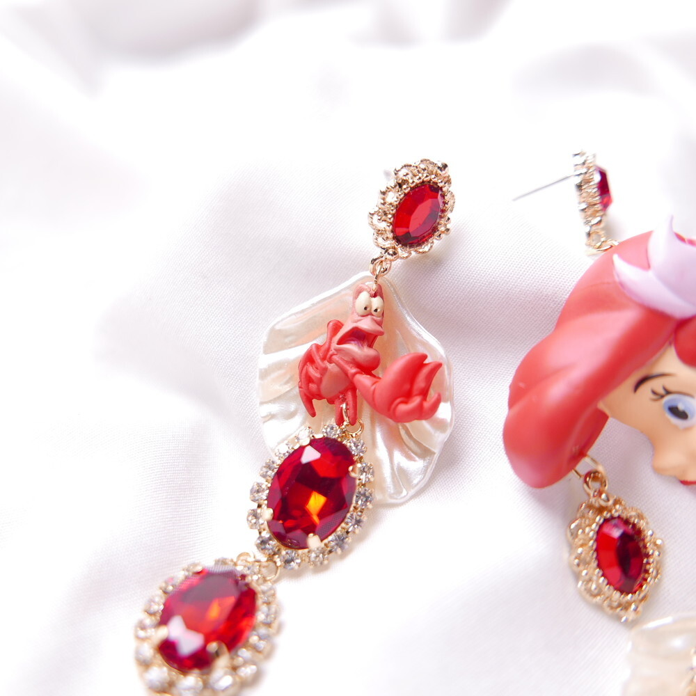 This vivid asymmetrical pair captures the heart of undersea fantasy with a bold twist. One side features Ariel’s iconic profile set against a shimmering shell, while the other showcases Sebastian playfully resting in another pearly shell. Paired with rich ruby-like crystals, this design sparkles with elegance and whimsy.