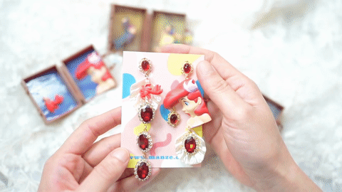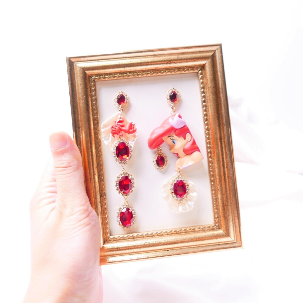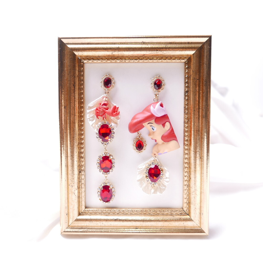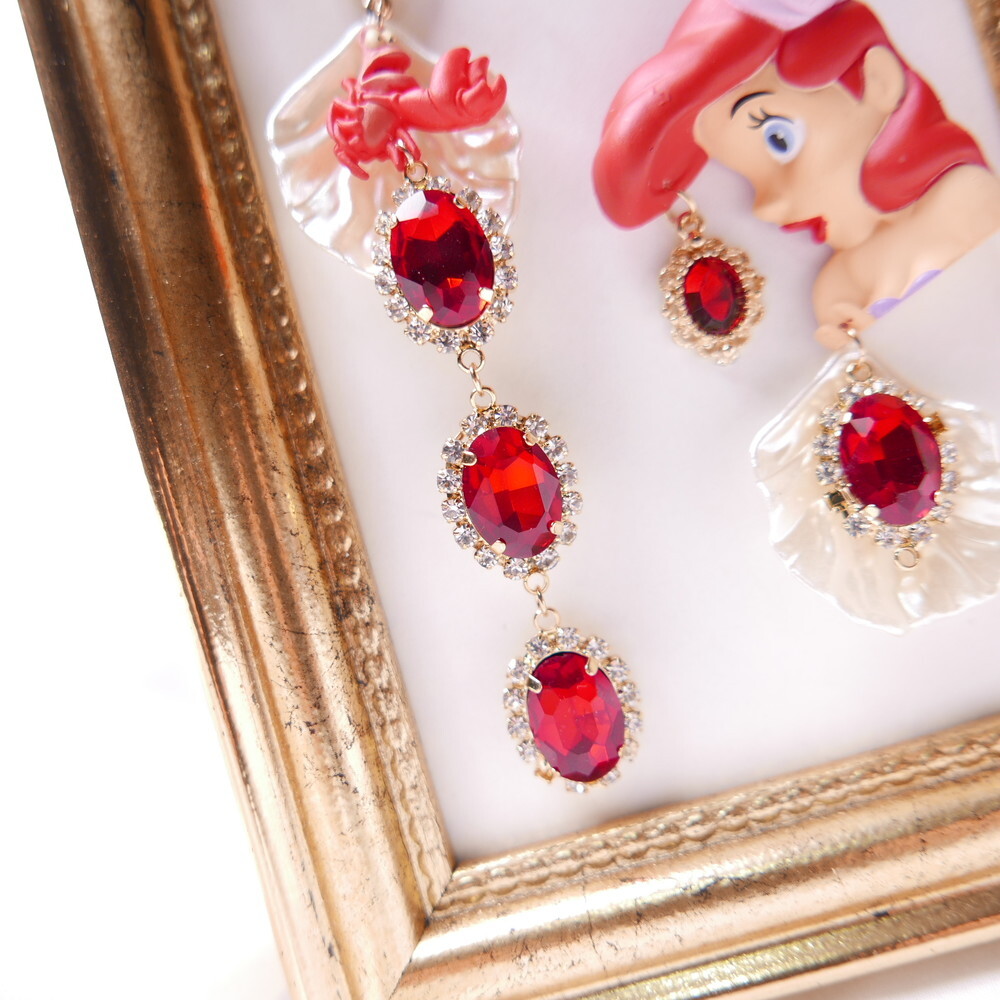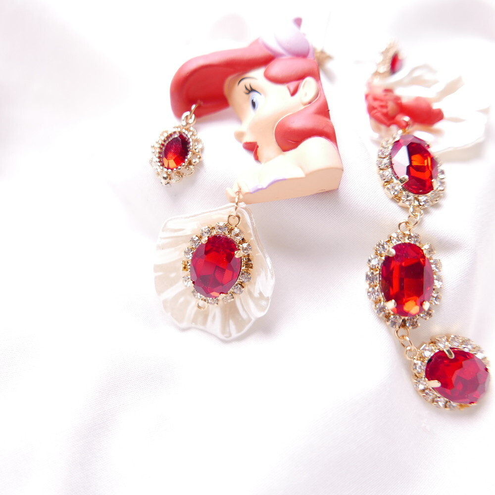 This vivid asymmetrical pair captures the heart of undersea fantasy with a bold twist. One side features Ariel’s iconic profile set against a shimmering shell, while the other showcases Sebastian playfully resting in another pearly shell. Paired with rich ruby-like crystals, this design sparkles with elegance and whimsy.