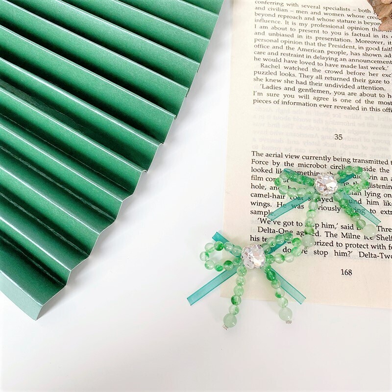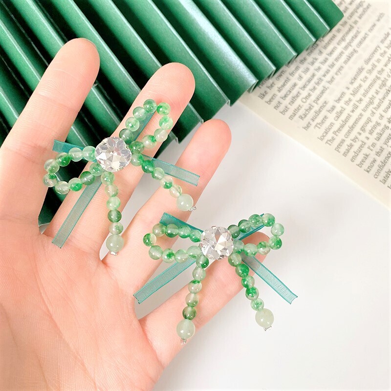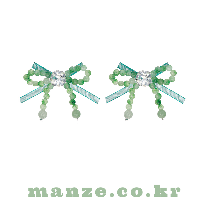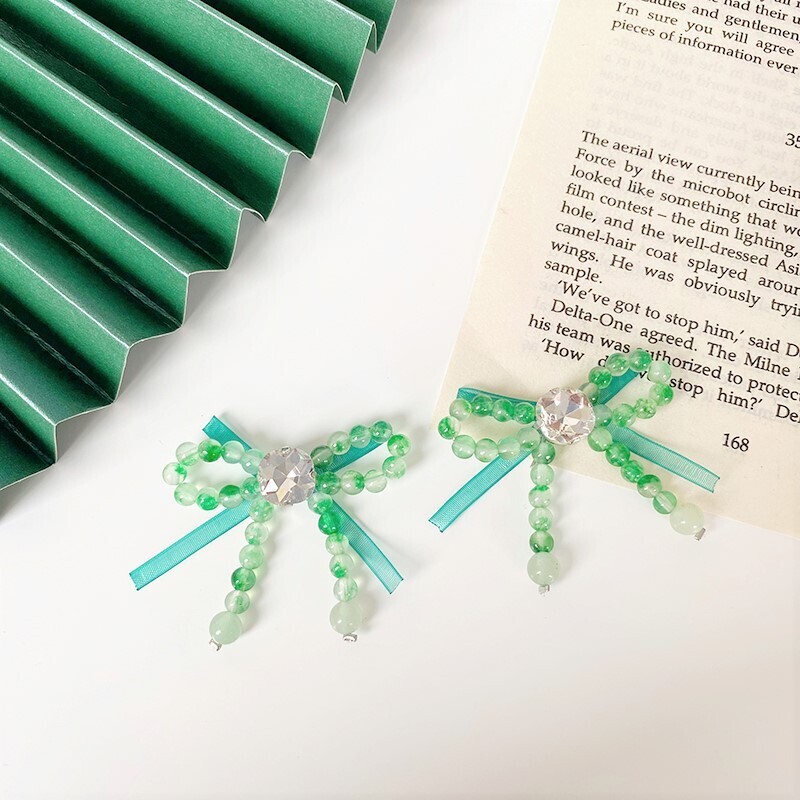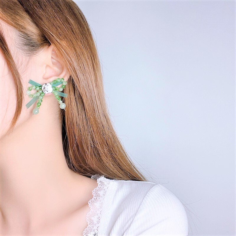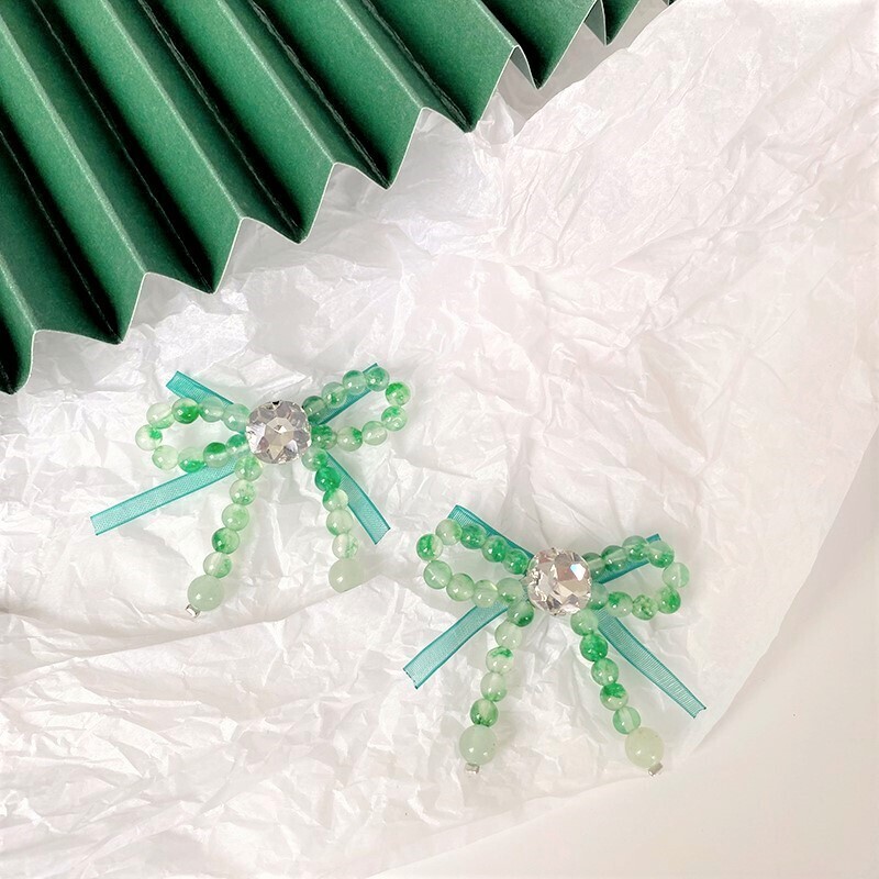 A vintage-inspired piece designed with a retro green mood. This charming earring features beads in shifting shades from deep green to mint, accented with a crystal center and delicate green ribbon. Crafted with silver 92.5% posts, it's a lovely choice for retro and playful styles.