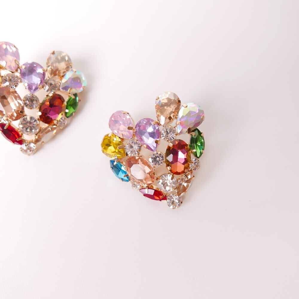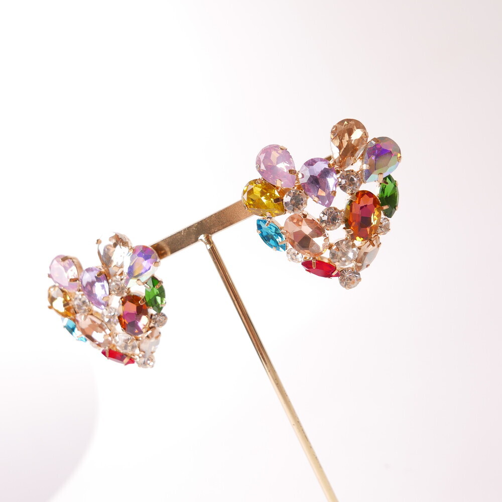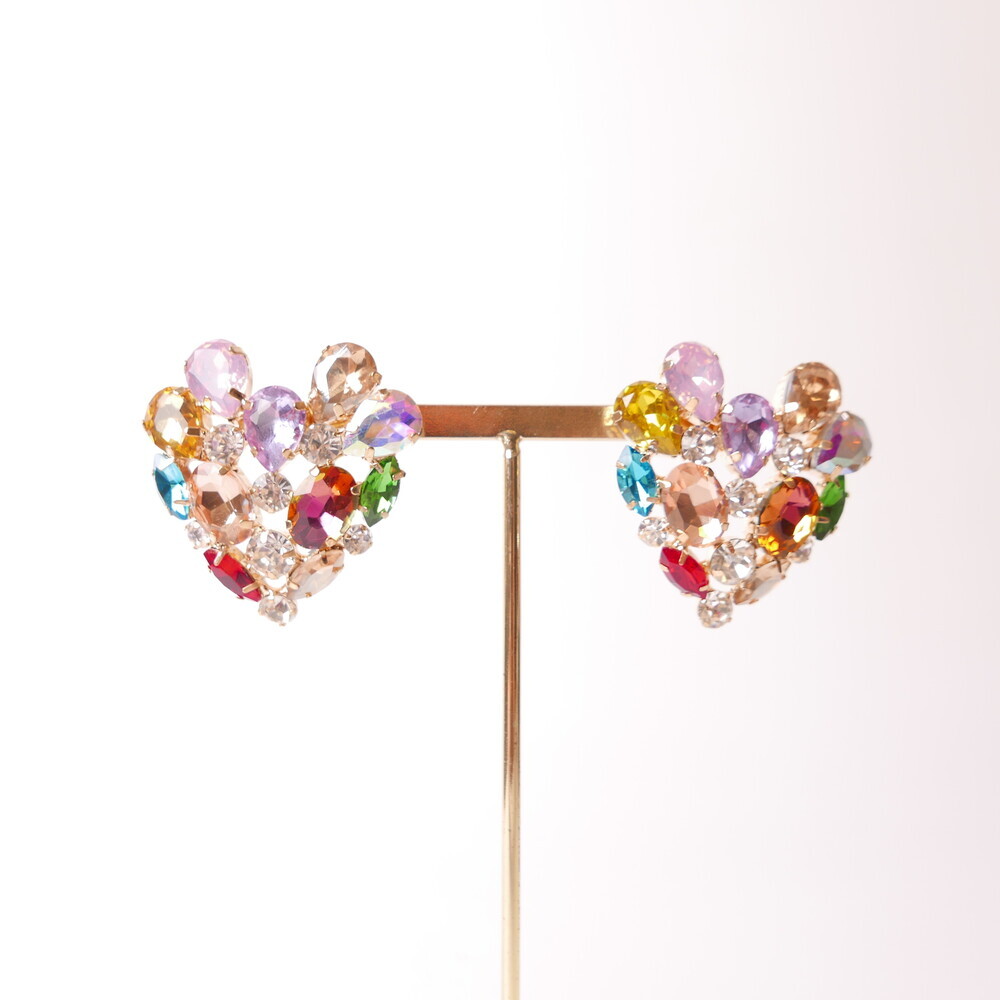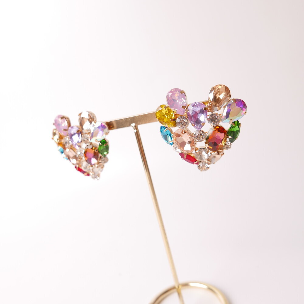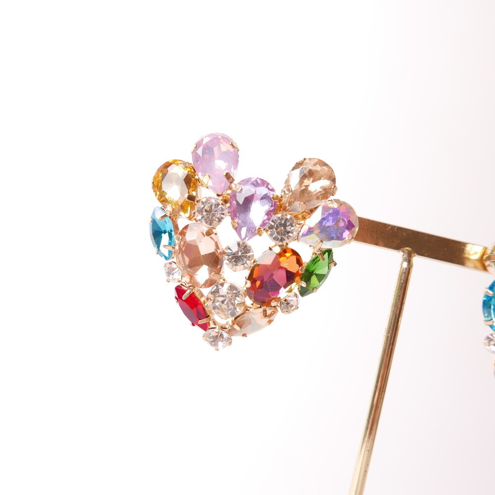These vibrant earrings look like a treasure chest of sweets straight from Willy Wonka’s factory. Crafted in a striking clustered heart shape, each gem is uniquely colored and set in layers to catch the light from every angle.A playful and bold piece that adds instant magic and whimsy to your look.
