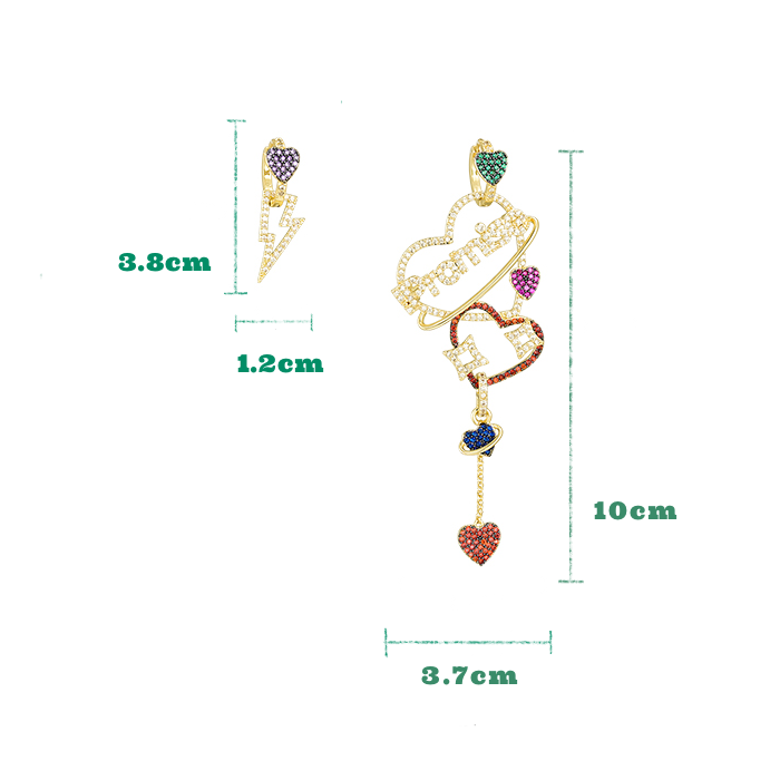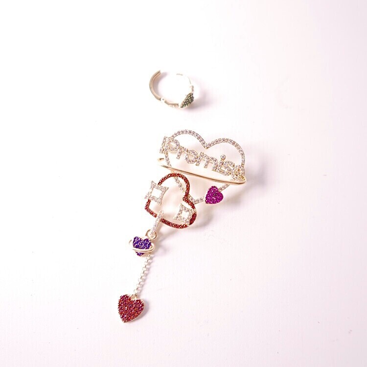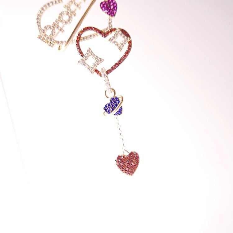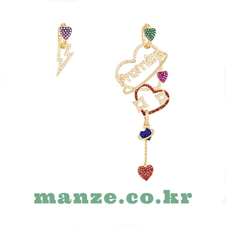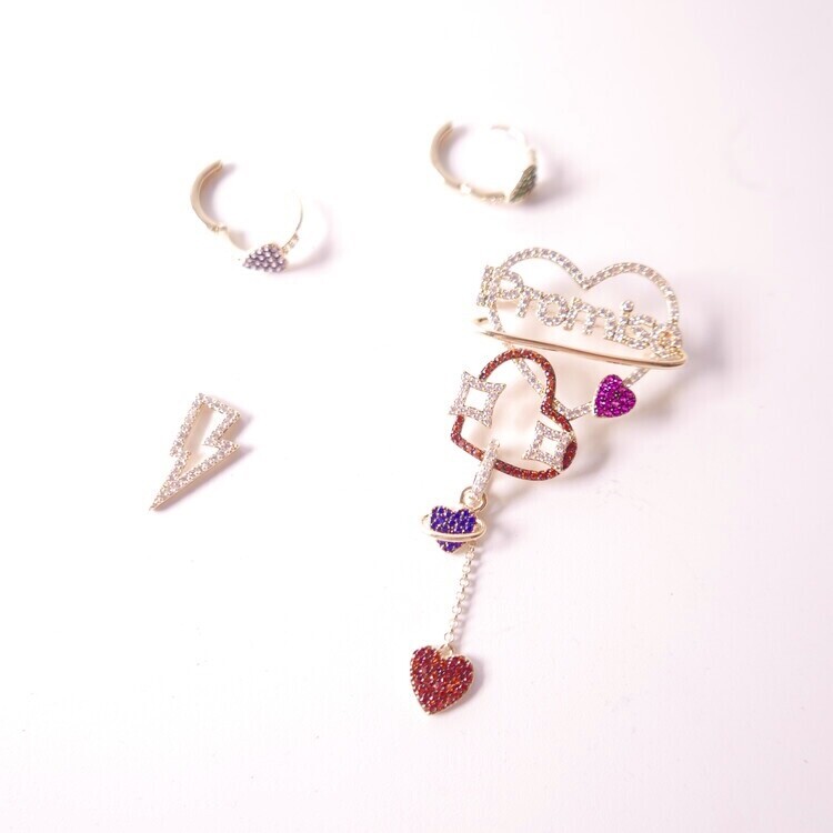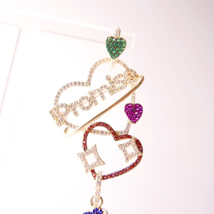 A bold promise sealed with sparkles.The Promise Earrings feature a colorful lightning bolt stud on one side and a whimsical cascade of charms on the other — including glittering hearts, a planet motif, and detachable brooch.The bottom heart charm can be removed and worn separately as a brooch, giving you multiple styling options in one piece.