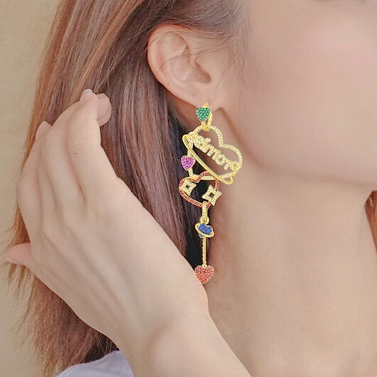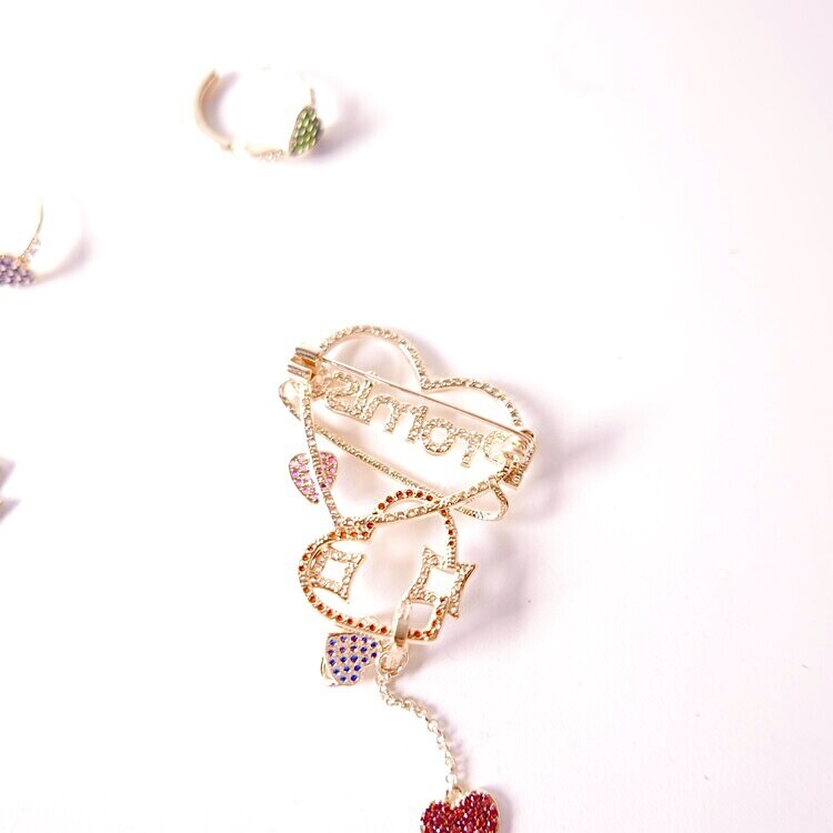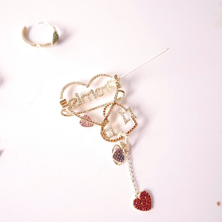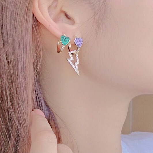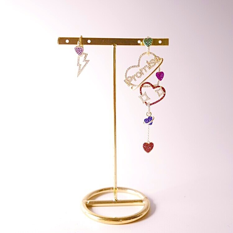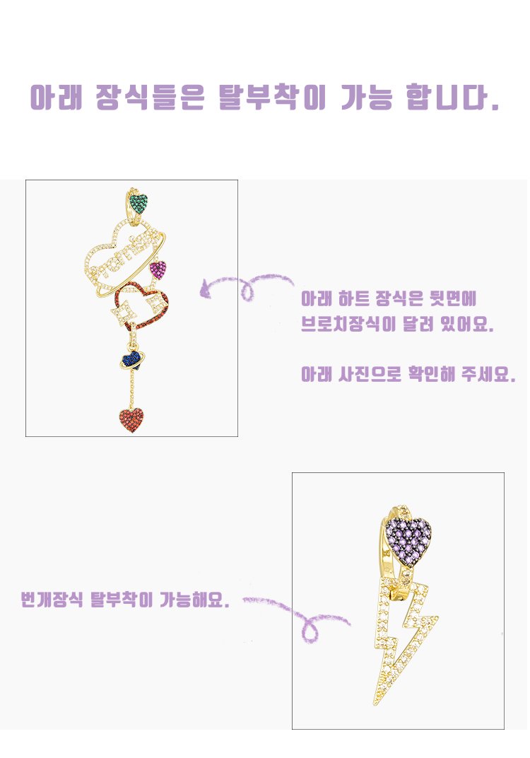 A bold promise sealed with sparkles.The Promise Earrings feature a colorful lightning bolt stud on one side and a whimsical cascade of charms on the other — including glittering hearts, a planet motif, and detachable brooch.The bottom heart charm can be removed and worn separately as a brooch, giving you multiple styling options in one piece.