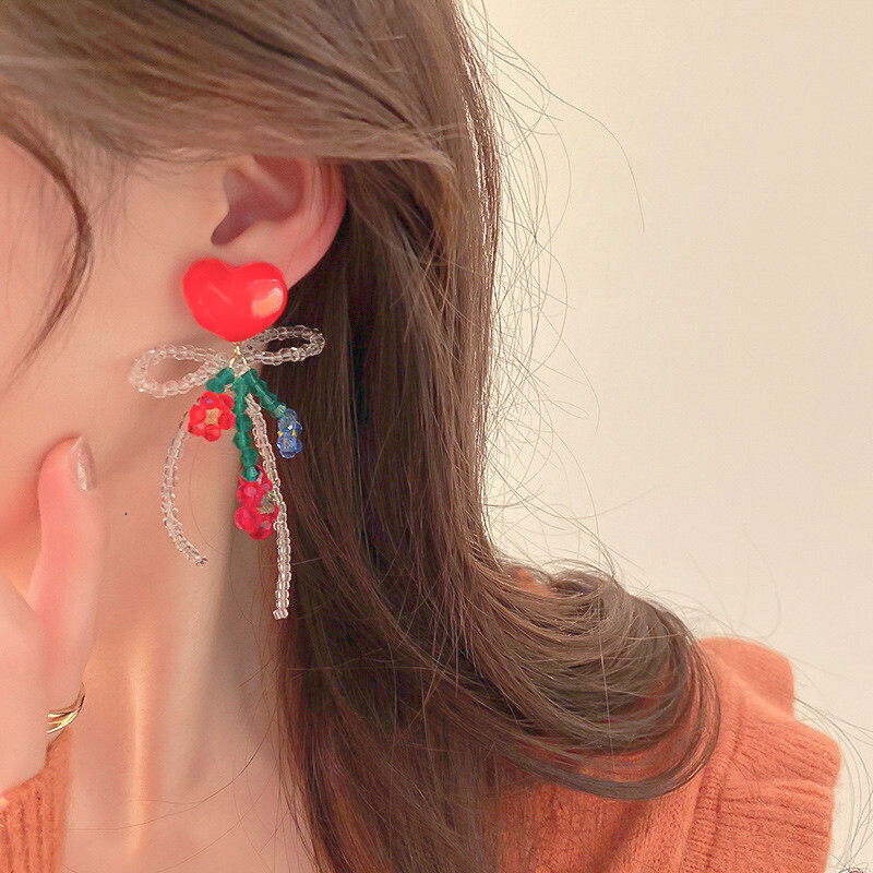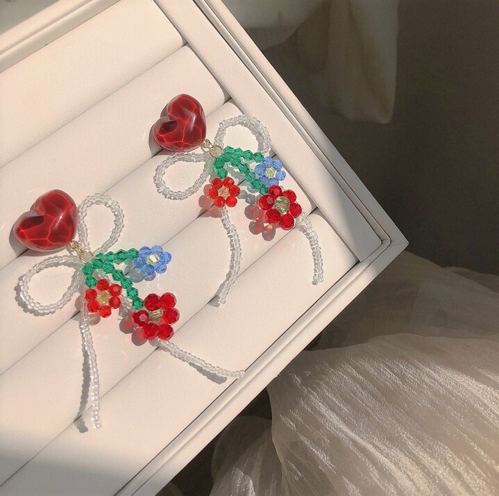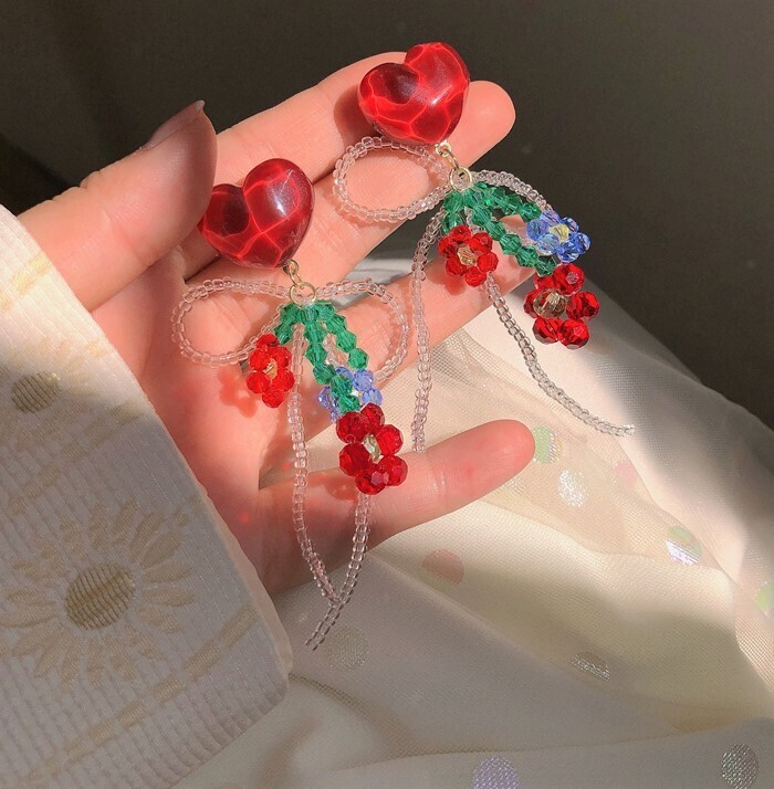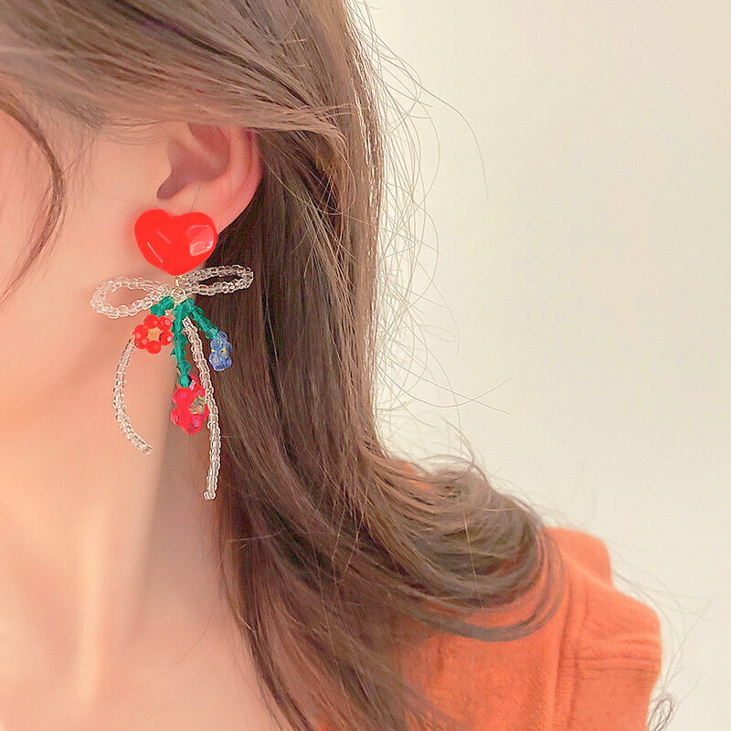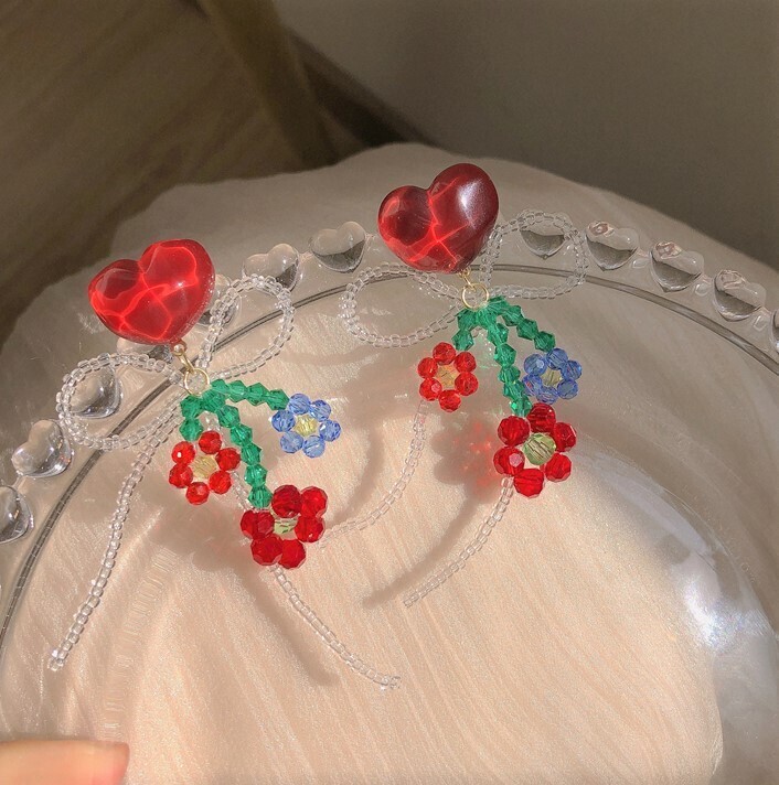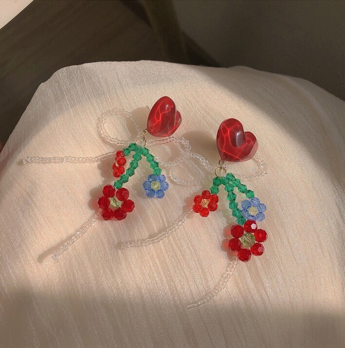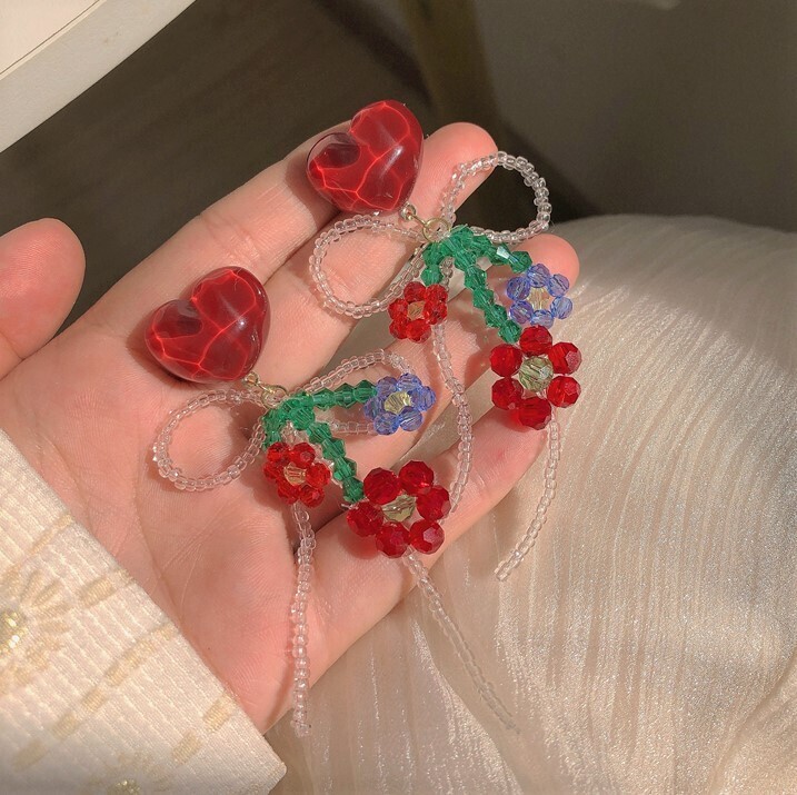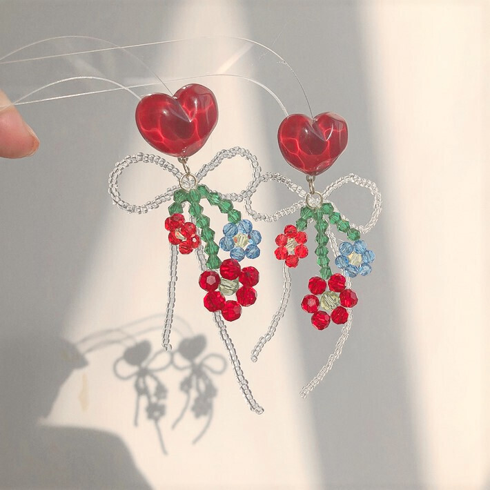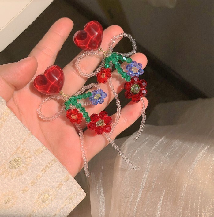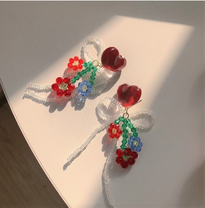 This delightful pair features heart-shaped studs adorned with intricate glass beadwork in floral shapes and a looping bow. Each earring combines reds, blues, and greens to create a sweet and romantic look, perfect for those who love handcrafted details. Whether paired with a dress or a casual top, these earrings add a gentle, lovely flair to any outfit.