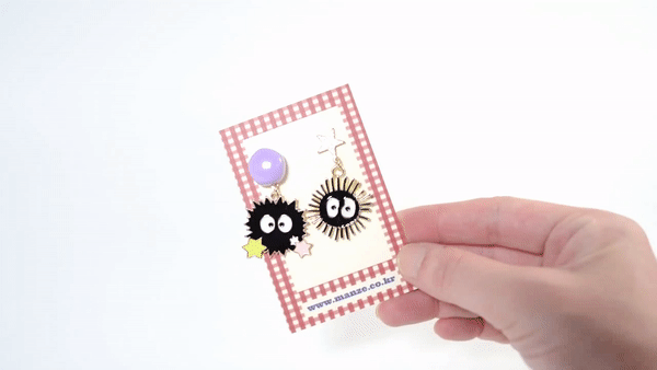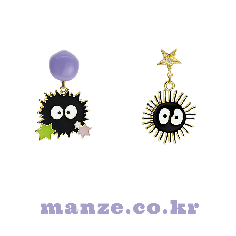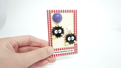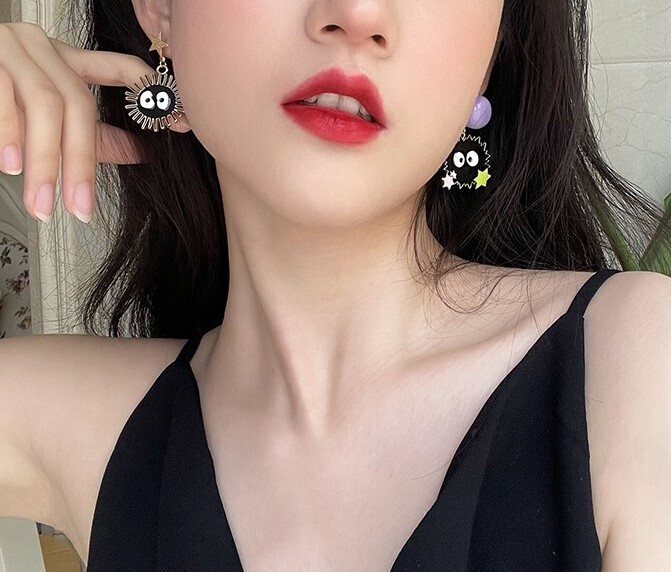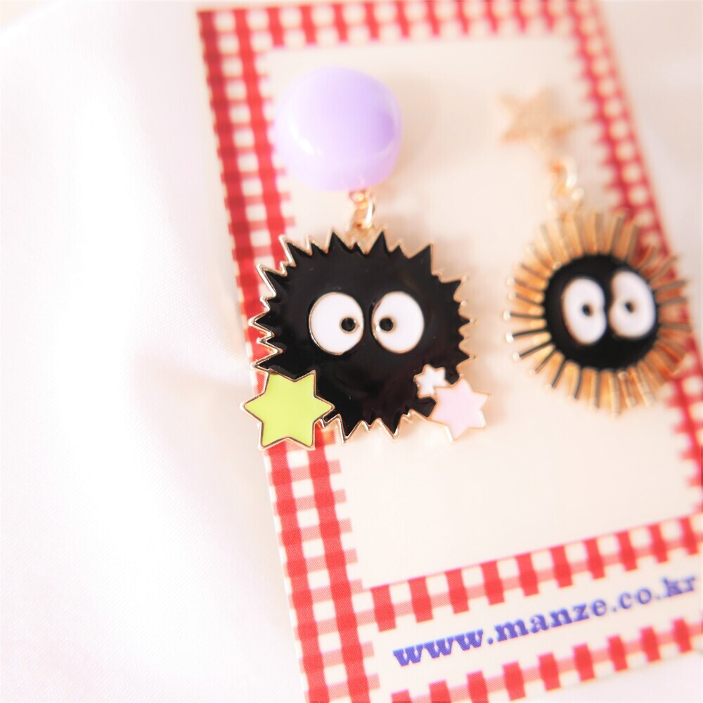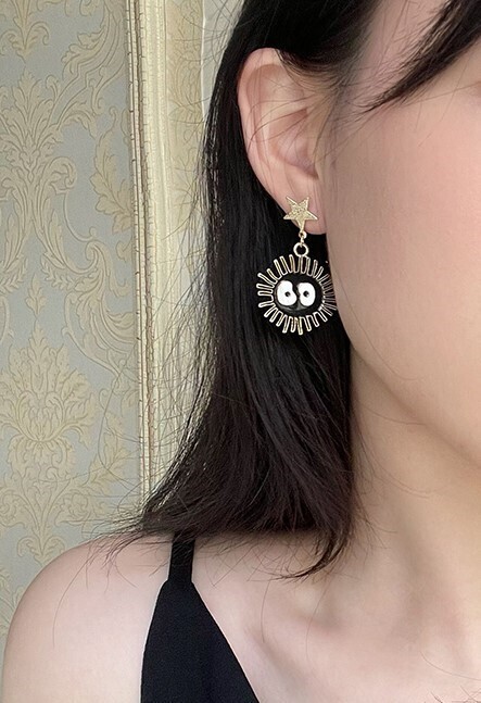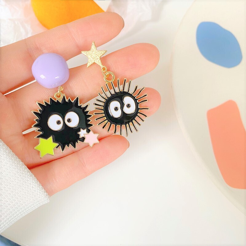These adorable mismatched earrings feature the iconic soot sprites from Spirited Away, complete with colorful star candies and fun facial expressions. Designed with a playful anime vibe and nostalgic charm, they’re a lightweight and delightful way to show your love for Studio Ghibli classics. A cute conversation starter perfect for everyday wear or gifting to animation fans.