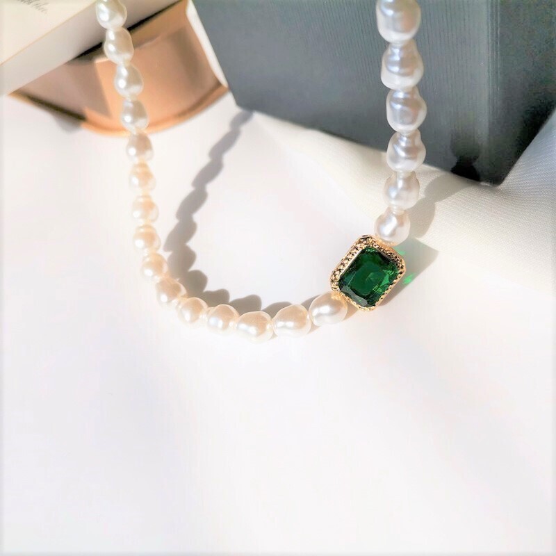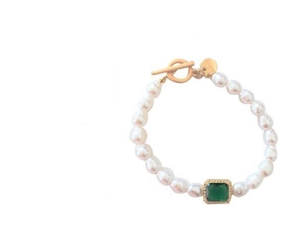 A timeless piece featuring luminous freshwater pearls and a deep green gemstone framed in an antique gold setting. The oval pearls bring soft luster, while the central gem adds a bold, elegant contrast. Perfect for special occasions or elevating daily looks. Finished with a secure gold toggle clasp for easy wear.
