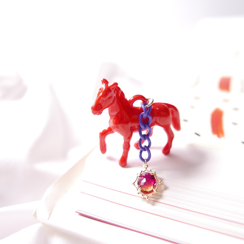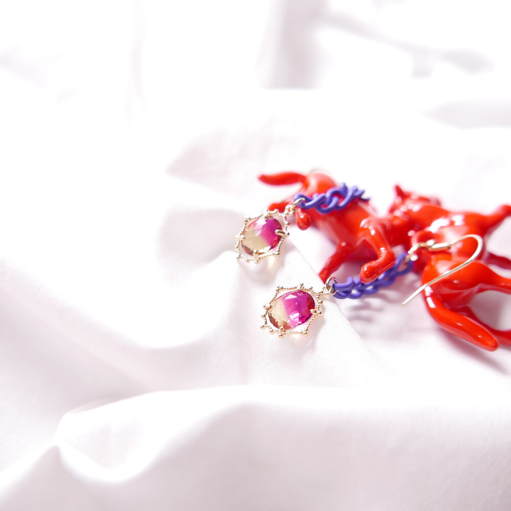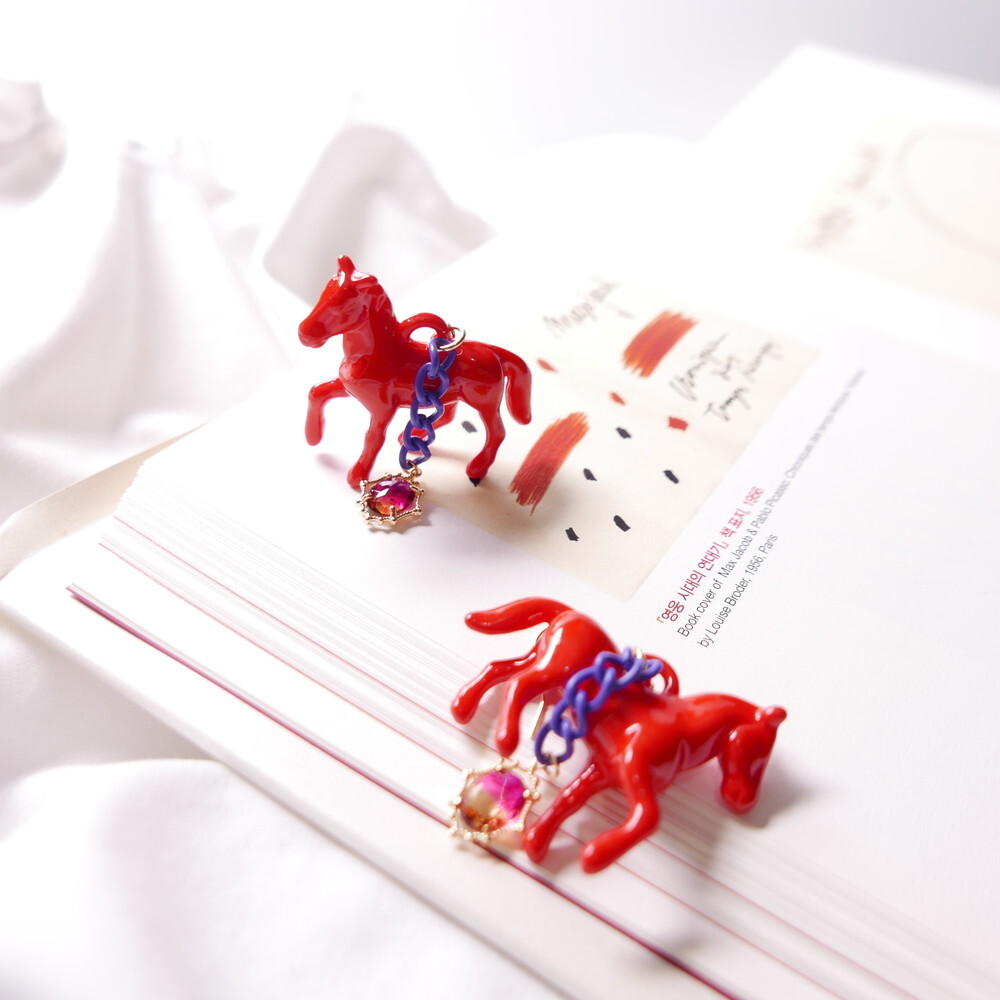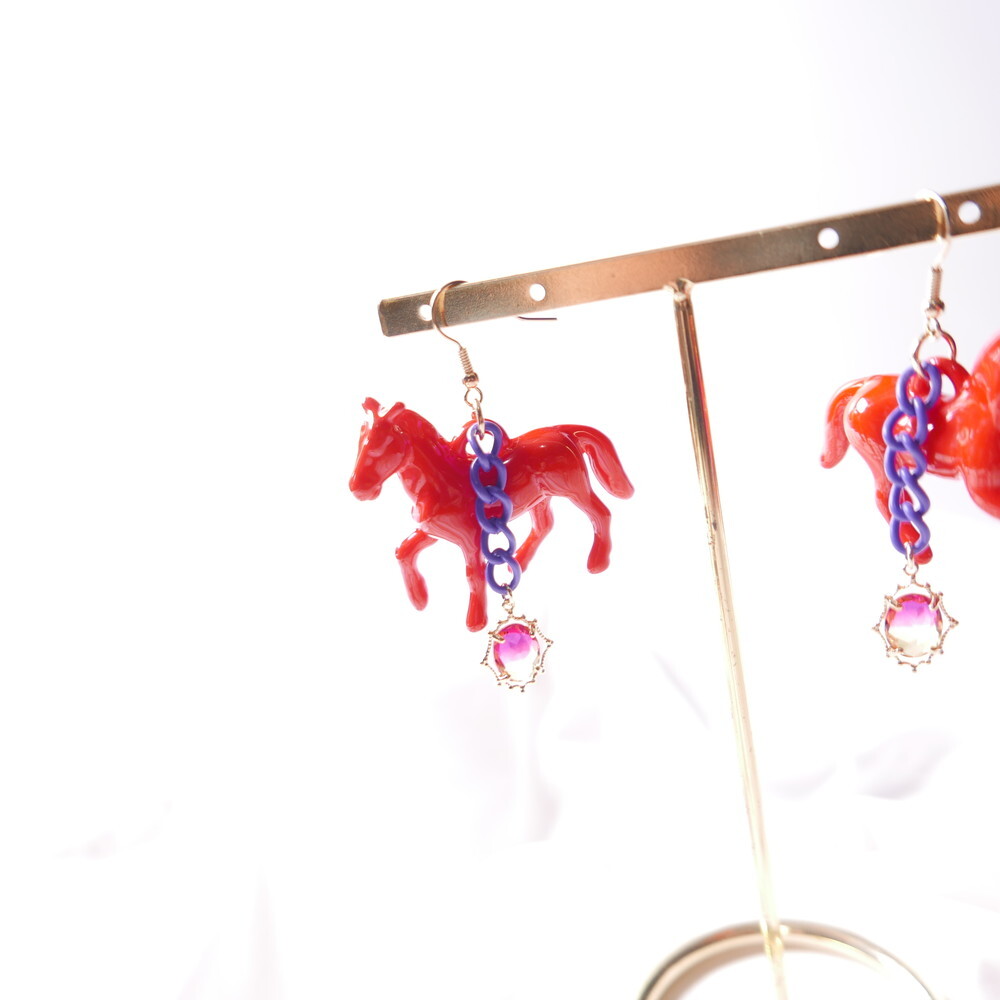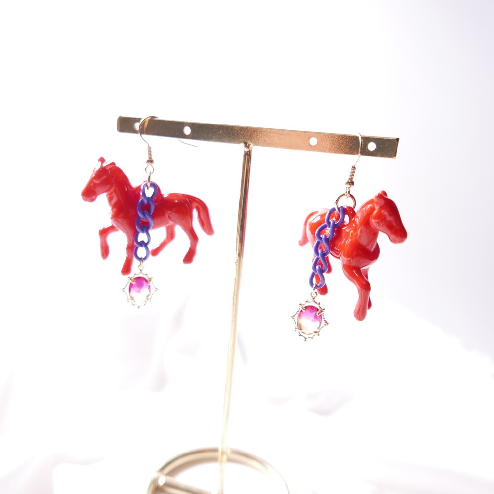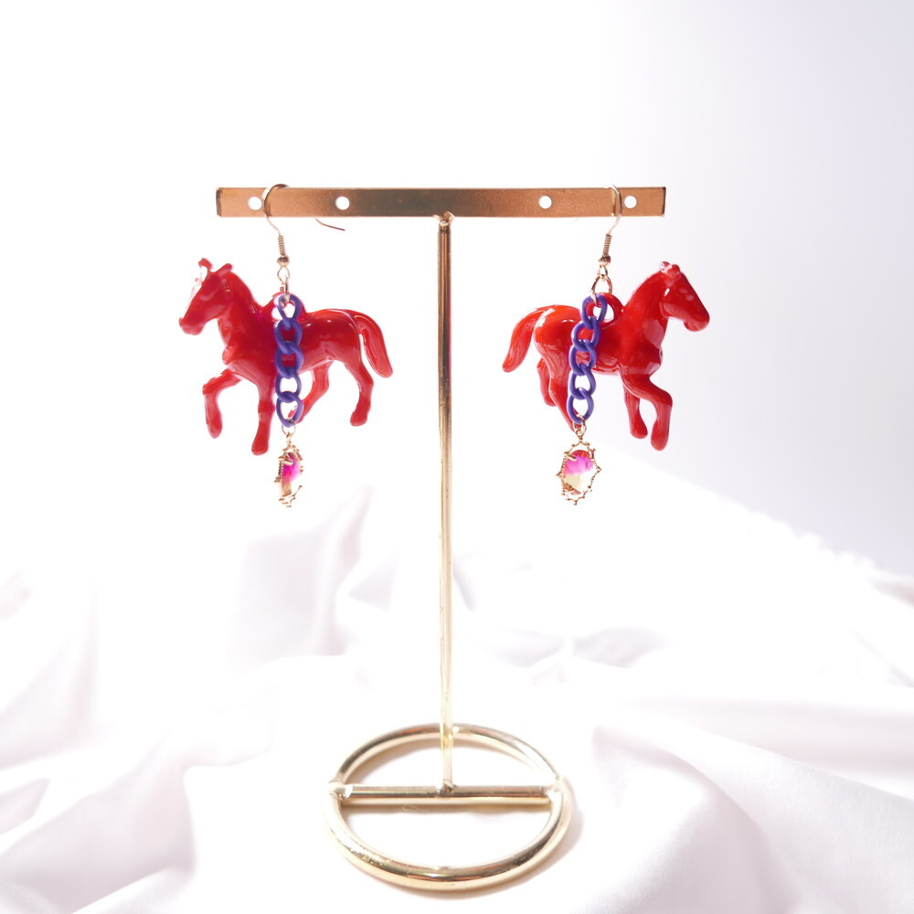 Bold and vivid, these unicorn-inspired earrings are designed with a striking red horse figure, a rich purple chain, and a sunset-tone gem drop. The dramatic combination of colors and playful elements make them a perfect match for anyone who loves statement, artsy accessories with a touch of whimsy.